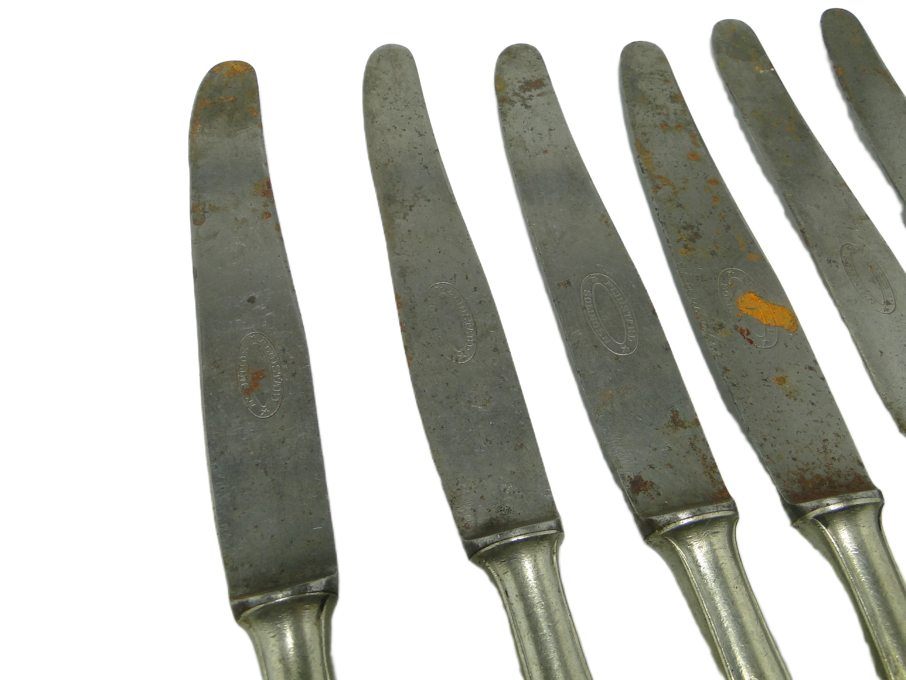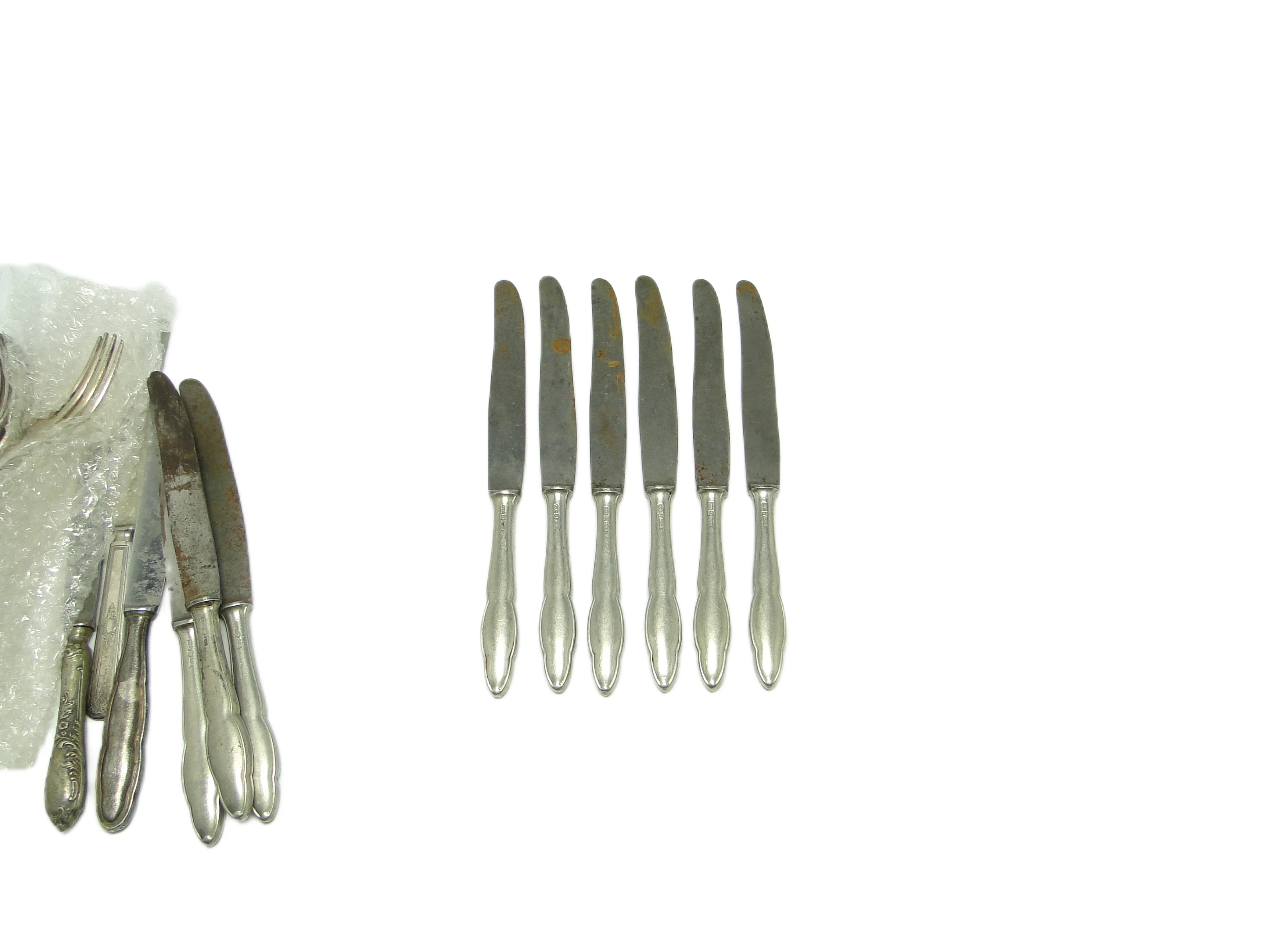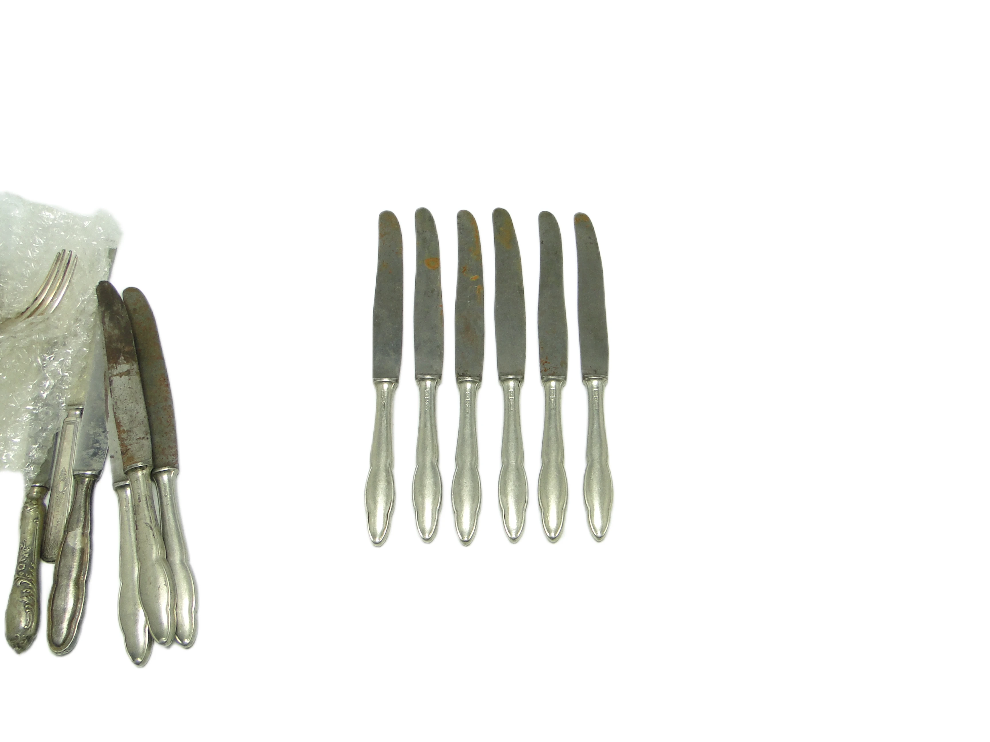 Komplet sześciu noży do chleba z Polski, datowany na lata 50., wykonany został ze srebrzonego mosiądzu. Każdy nóż zachowuje stonowany, srebrzysty odcień o matowym wykończeniu – charakterystycznym dla powojennego wzornictwa, w którym walory użytkowe łączono z oszczędnością formy. Rękojeści mają subtelnie organiczną linię i delikatnie wyoblone zakończenie, wpisując się w modernistyczne tendencje epoki. Ostrza są proste, z łagodnie zaokrąglonymi końcami, płynnie przechodzącymi w trzon noża. Na powierzchni widoczna jest patyna, miejscowe naloty oraz drobne ogniska rdzy, podkreślające autentyczny charakter vintage. Rękojeści wykazują lekko ziarnistą fakturę i subtelne nieregularności świadczące o ręcznym wykończeniu. Brak dekoracji czy grawerunków wskazuje na minimalistyczny, funkcjonalny projekt. Komplet pozostaje w dobrym stanie zachowania – widoczne są ślady utlenienia i punktowe ślady korozji, typowe dla przedmiotów z połowy XX wieku, bez uszkodzeń strukturalnych.W tych nożach wyczuwalny jest powojenny pragmatyzm i cicha nostalgia za dawnymi rytuałami. Ich forma przemawia głosem epoki, w której nawet najprostszy przedmiot miał być trwały i służyć przez lata, a matowy połysk srebrzonego mosiądzu odbijał światło domowej lampy i pierwsze promienie dnia nad stołem śniadaniowym. Patyna i niewielkie niedoskonałości nie kryją wieku, lecz opowiadają o historii rodzinnych spotkań i codziennych posiłków, gdzie funkcja spotykała się z dyskretną estetyką.Komplet ten można wprowadzić do aranżacji inspirowanej modernizmem lub eklektycznym stylem kolekcjonerskim – dobrze sprawdzi się w towarzystwie ceramiki z lat 50. lub szkła prasowanego. Warto zestawić go z lnianymi serwetami i prostą, białą porcelaną, by wydobyć pierwotny, użytkowy charakter. W nowoczesnej jadalni noże mogą pojawić się jako subtelny antyk przy minimalistycznym nakryciu stołu, z kolei w klasycznym wnętrzu – uzupełnią kolekcję stołowej galanterii z połowy XX wieku.