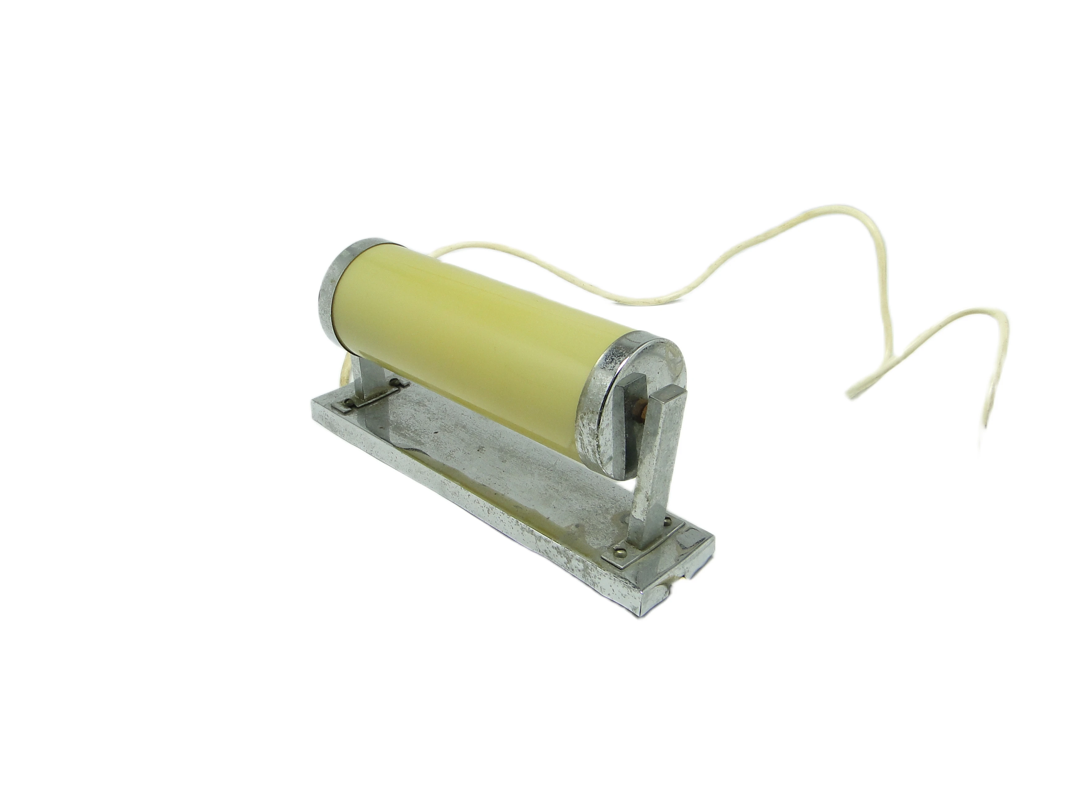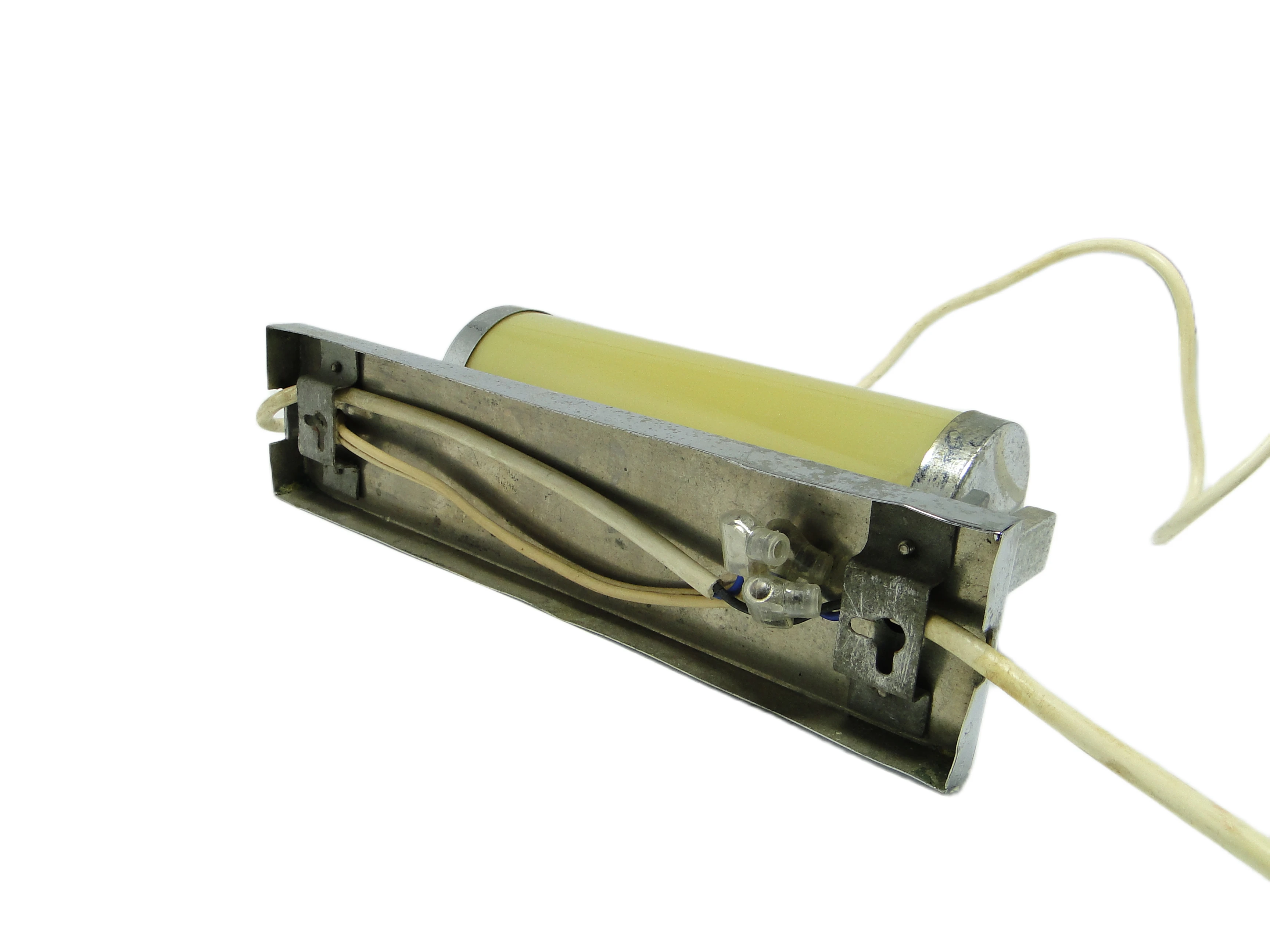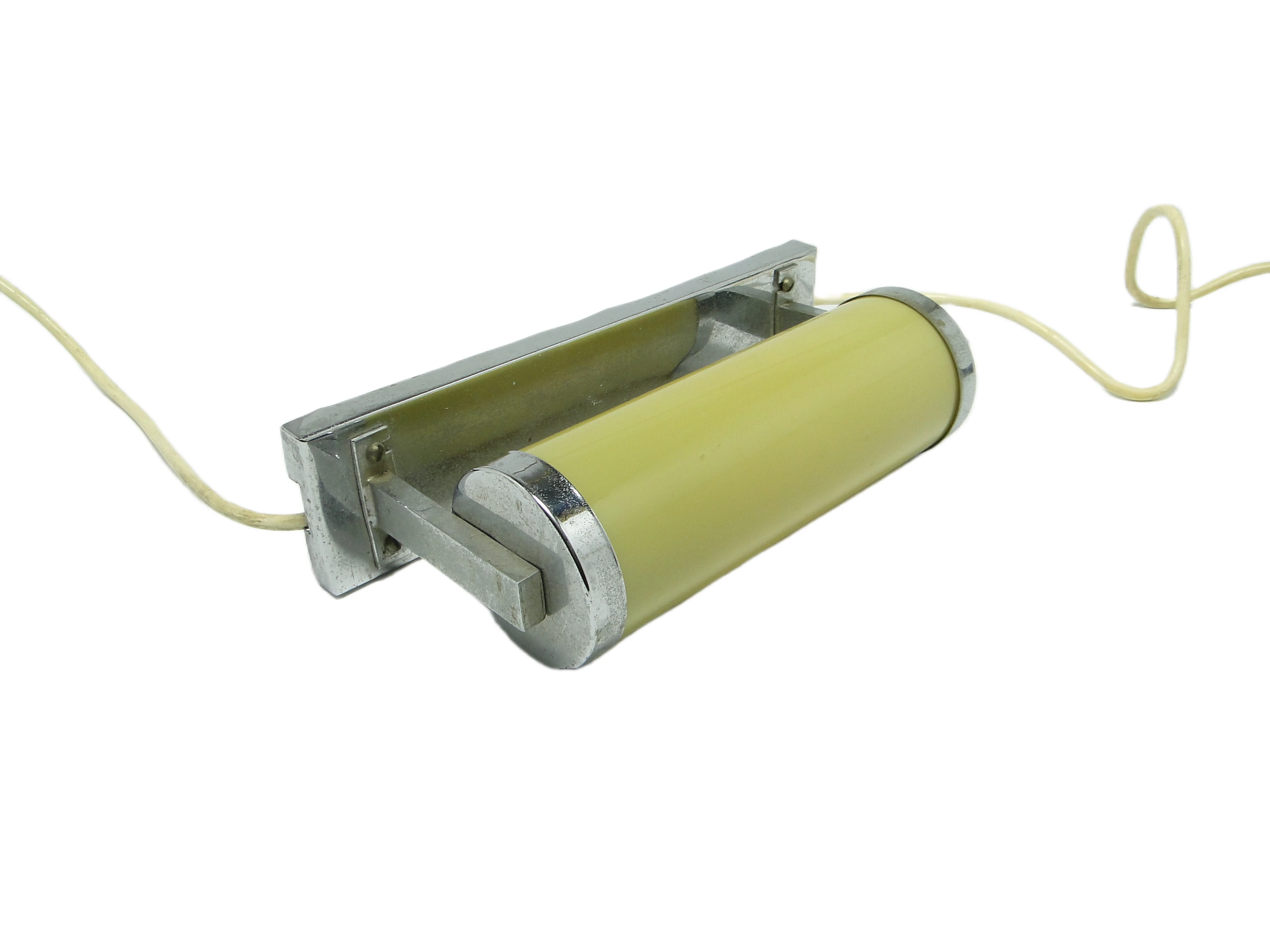 Lampa ścienna z lat 70., wyprodukowana najprawdopodobniej w Polsce, reprezentuje klasykę nurtu mid-century modern. Cylindryczny klosz utrzymany jest w odcieniu ciepłej kości słoniowej z matową powierzchnią, co pozwala na miękkie rozpraszanie światła. Zakończenia oraz solidna, prostokątna podstawa wykonane są z metalu, prawdopodobnie chromowanego, z miejscową patyną i drobnymi przebarwieniami. Wyeksponowane śruby oraz widoczne połączenia konstrukcyjne podkreślają szczerość i funkcjonalność projektu. Oryginalny przewód zasilający w odcieniu jasnokremowym nosi ślady naturalnego przebarwienia. Całość zachowana jest w bardzo dobrym stanie vintage – obecne są wyłącznie subtelne oznaki użytkowania, bez poważnych uszkodzeń czy braków.Forma tej lampy opowiada historię dekady, w której optymizm modernizmu łączył się z przemysłową szczerością. Metaliczne, lekko spatynowane wykończenia tchną duchem fabrycznych warsztatów lat 70., a delikatny klosz łagodzi surowość materiałów. To światło, które wieczorami rozjaśniało domy inżynierów i architektów, tworząc przestrzeń dla zadumy nad nowoczesnością i codziennym rytuałem.Tego typu kinkiet można zestawić z minimalistycznym biurkiem lub konsolą z naturalnego drewna, gdzie podkreśli swoją funkcję użytkową i klarowną formę. Dobrze odnajdzie się również na niskiej komodzie w salonie, w towarzystwie grafiki o mocnym konturze lub obok wazonu z geometryczną ceramiką. Wnętrza inspirowane stylem mid-century modern, industrialnym lub eklektycznym zyskają dzięki tej lampie subtelny, kolekcjonerski akcent świetlny, który łagodzi ostrość surowych materiałów.