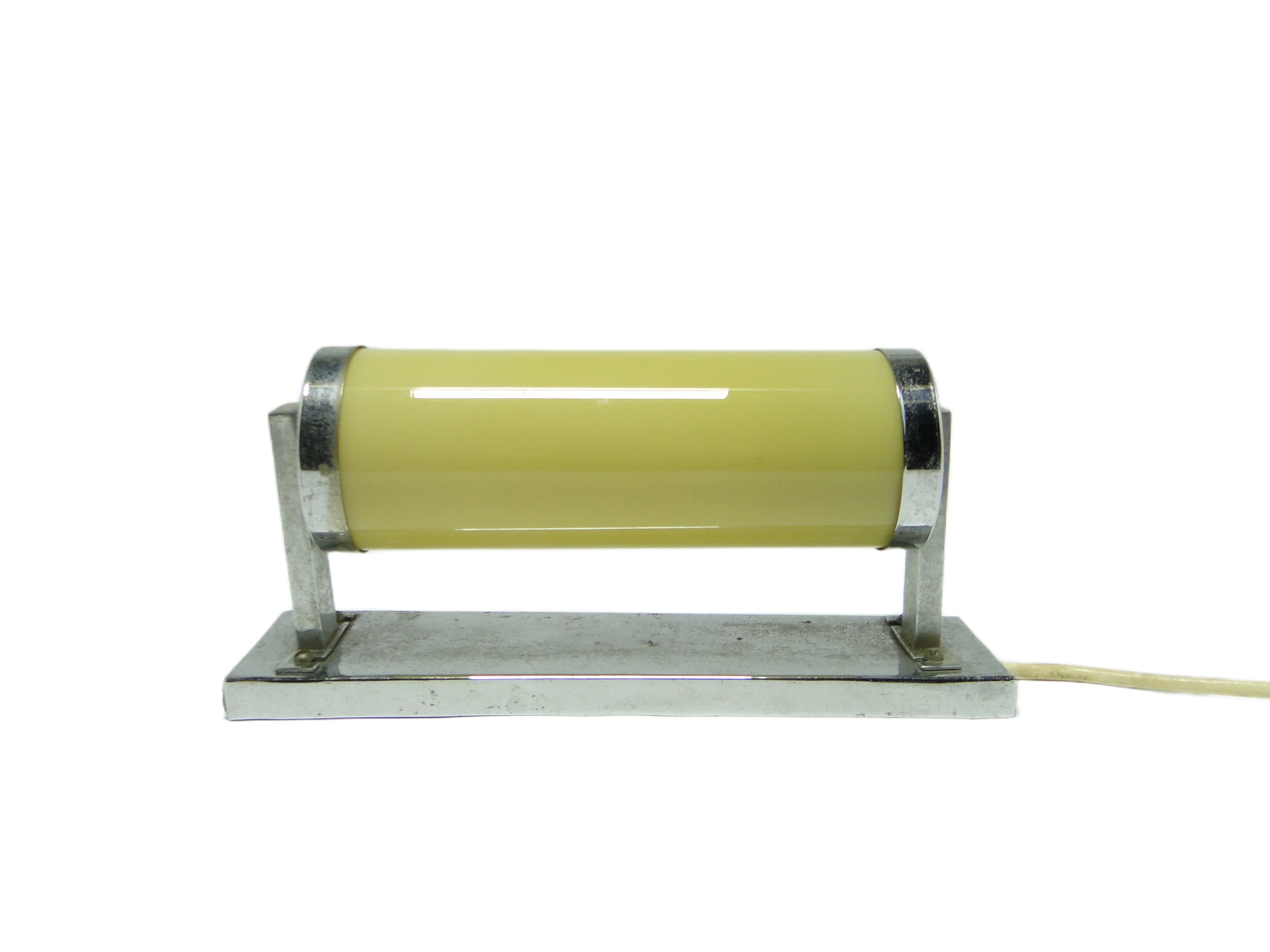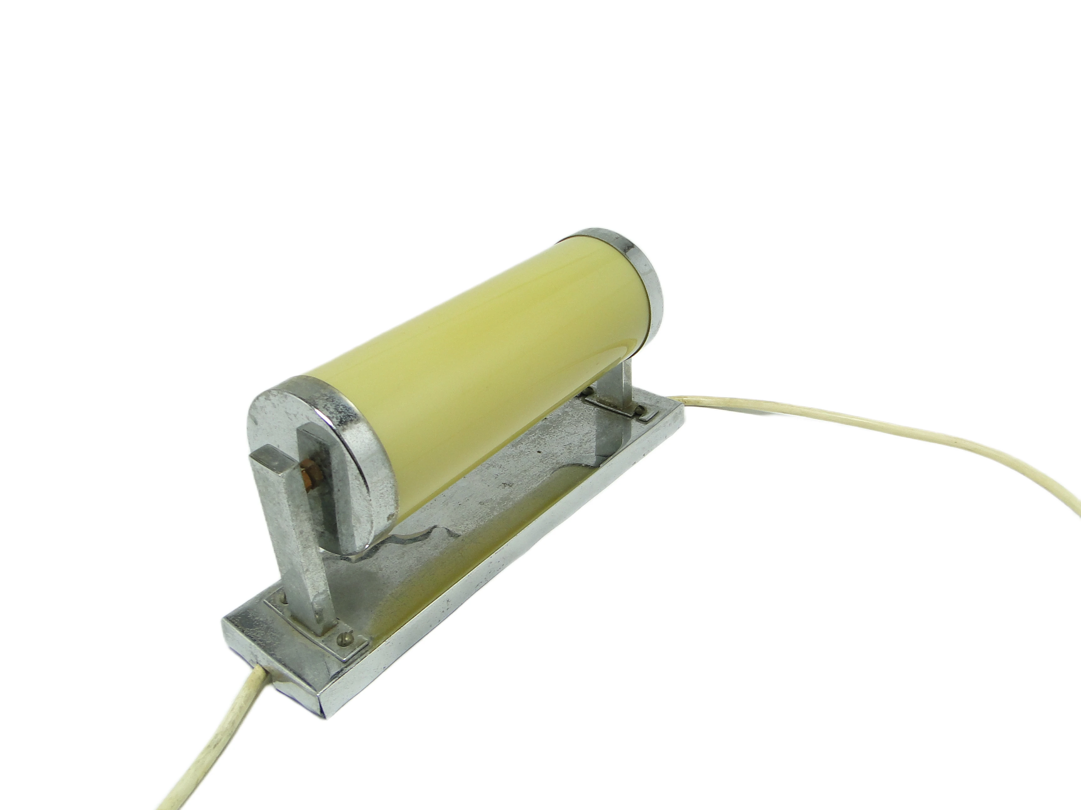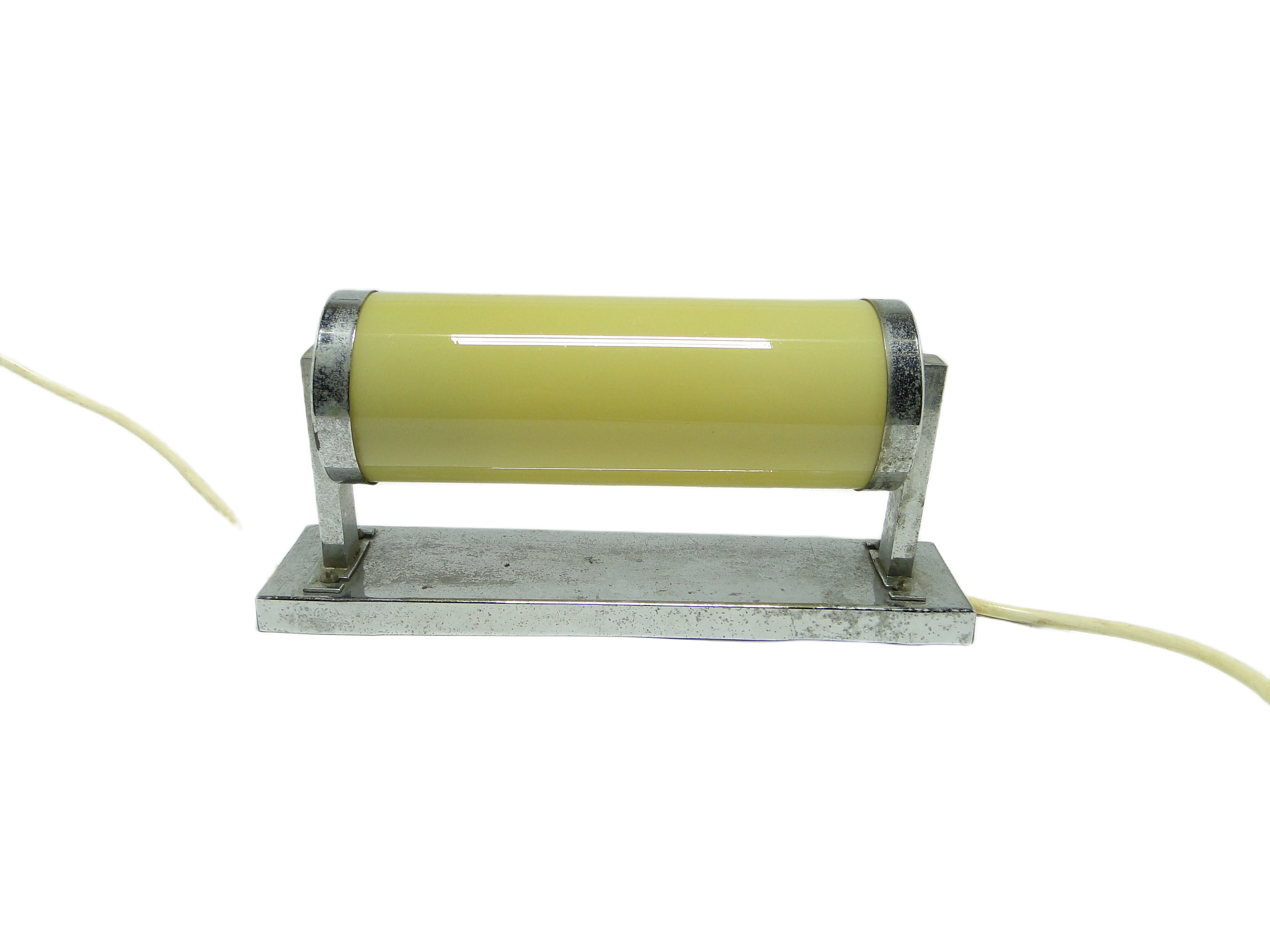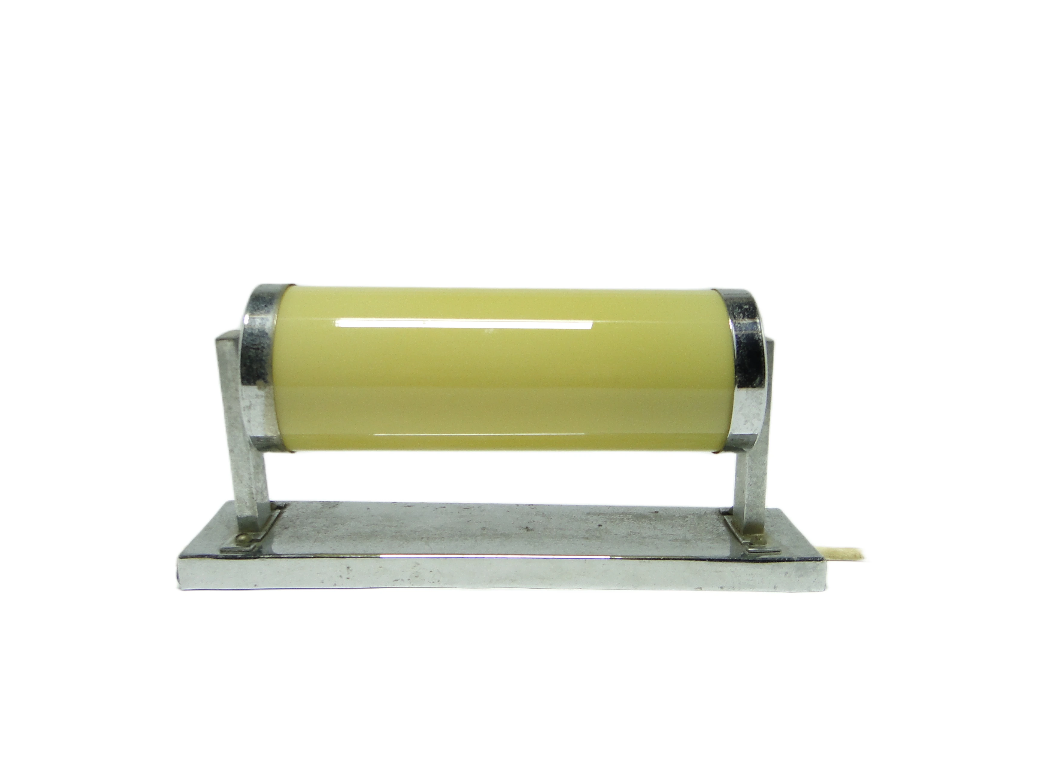 Lampa ścienna z lat 70., wyprodukowana najprawdopodobniej w Polsce, reprezentuje klasykę nurtu mid-century modern. Cylindryczny klosz utrzymany jest w odcieniu ciepłej kości słoniowej z matową powierzchnią, co pozwala na miękkie rozpraszanie światła. Zakończenia oraz solidna, prostokątna podstawa wykonane są z metalu, prawdopodobnie chromowanego, z miejscową patyną i drobnymi przebarwieniami. Wyeksponowane śruby oraz widoczne połączenia konstrukcyjne podkreślają szczerość i funkcjonalność projektu. Oryginalny przewód zasilający w odcieniu jasnokremowym nosi ślady naturalnego przebarwienia. Całość zachowana jest w bardzo dobrym stanie vintage – obecne są wyłącznie subtelne oznaki użytkowania, bez poważnych uszkodzeń czy braków.Forma tej lampy opowiada historię dekady, w której optymizm modernizmu łączył się z przemysłową szczerością. Metaliczne, lekko spatynowane wykończenia tchną duchem fabrycznych warsztatów lat 70., a delikatny klosz łagodzi surowość materiałów. To światło, które wieczorami rozjaśniało domy inżynierów i architektów, tworząc przestrzeń dla zadumy nad nowoczesnością i codziennym rytuałem.Tego typu kinkiet można zestawić z minimalistycznym biurkiem lub konsolą z naturalnego drewna, gdzie podkreśli swoją funkcję użytkową i klarowną formę. Dobrze odnajdzie się również na niskiej komodzie w salonie, w towarzystwie grafiki o mocnym konturze lub obok wazonu z geometryczną ceramiką. Wnętrza inspirowane stylem mid-century modern, industrialnym lub eklektycznym zyskają dzięki tej lampie subtelny, kolekcjonerski akcent świetlny, który łagodzi ostrość surowych materiałów.