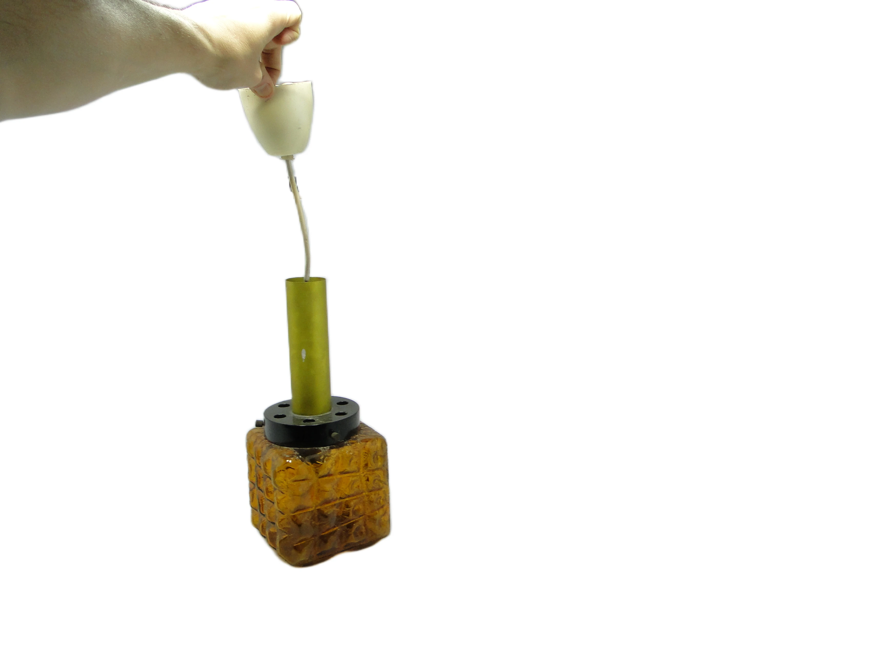 Sufitowa lampa Polam z lat 80. reprezentuje modernistyczne podejście do wzornictwa oświetleniowego w Polsce. Klosz w formie sześcianu wykonany jest ze szkła mrożonego w intensywnie bursztynowo-brązowym odcieniu o półpołyskliwym wykończeniu. Powierzchnia szkła zdobiona została geometrycznym, reliefowym wzorem, który nadaje mu głębi i przypomina pikowaną tkaninę. Uchwyt lampy to cylindryczny element w barwie oliwkowej zieleni, przechodzący w czarny pierścień spinający całość, a podsufitka utrzymana jest w minimalistycznej bieli. Forma lampy jest zwarta, a proporcje harmonijne – sześcienny klosz stanowi wyraźny punkt ciężkości, a wykończenia podkreślają solidność konstrukcji. Wszystkie elementy zachowały się w oryginale, widoczne są śruby mocujące pierścień. Stan zachowania bardzo dobry – brak odprysków, pęknięć czy wyraźnych śladów użytkowania.W tej lampie odbija się głos późnego modernizmu lat 80., kiedy funkcjonalność spotykała się z dekoracyjną odwagą. Szkło, o lekko transparentnym charakterze, filtruje światło, zmiękczając je i wprowadzając do wnętrza ciepły bursztynowy ton. Geometryczna faktura klosza zdaje się opowiadać historię o dążeniu do struktury i porządku, ale z nutą zmysłowości ukrytą w załamaniach światła. Lampa mogłaby szeptać o czasach, w których detal był manifestem nowoczesności, a zestawienie kolorów i materiałów tworzyło dialog między codziennością a designem.Można zawiesić ją nad stołem w salonie lub w centralnym punkcie pokoju, gdzie jej geometryczna forma i brązowe szkło stworzą wyrazisty akcent. Dobrze sprawdzi się w aranżacji inspirowanej modernizmem, ale także w eklektycznych wnętrzach z nutą retro – warto połączyć ją z meblami z drewna tekowego lub chłodnego metalu oraz tekstyliami o wyraźnej strukturze. W sąsiedztwie minimalistycznych grafik czy ceramiki w odcieniach ziemi, lampa podkreśli relację pomiędzy światłem a fakturą otoczenia.