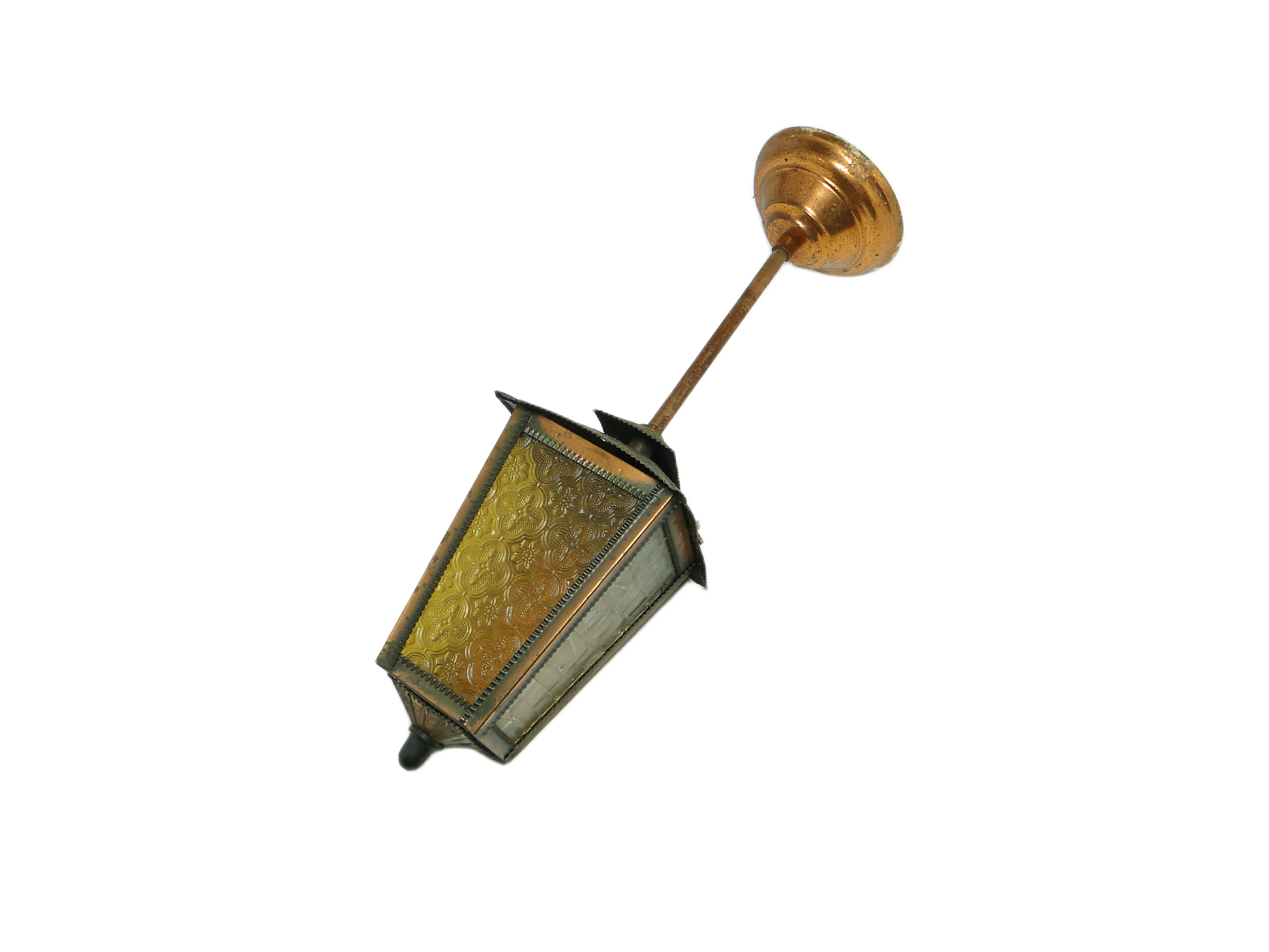 Lampa sufitowa wykonana w Polsce w latach 70. prezentuje formę inspirowaną art déco, z wyraźnym nawiązaniem do klasycznych latarni. Korpus z miedziowanej stali utrzymany jest w ciepłym, miedziano-złotym odcieniu o satynowo-matowym wykończeniu, co widoczne jest zarówno na solidnej konstrukcji ramy, jak i dekoracyjnej rozecie sufitowej. Klosz lampy oparty jest na wydłużonym, zwężającym się ku dołowi heksagonie, złożonym z czterech szyb: dwie z nich są bursztynowo-żółte, tłoczone w wypukły, kwiatowy wzór, podczas gdy pozostałe dwie pozostają przezroczyste, z geometrycznym, matowym zdobieniem. Szkło osadzone jest w nitowanej ramie, której krawędzie zdobi dekoracyjne perełkowanie, a całość wieńczy zaokrąglony, czerniony element. Mechaniczne łączenia oraz proporcje elementów świadczą o starannym rzemiośle i wyczuciu detalu. Lampa zachowana jest w bardzo dobrym stanie – widoczne są jedynie subtelne ślady użytkowania, typowe dla oryginalnych egzemplarzy z epoki.W tej lampie odnaleźć można głos polskich mieszkań lat 70., kiedy światło miało za zadanie nie tylko oświetlać, ale również budować nastrój i podkreślać indywidualność wnętrza. Miedziowana rama z satynową patyną i tłoczone szkło przywołują wspomnienie wieczorów spędzanych wśród rodzinnych pamiątek i starannie dobranych detali. Zestawienie bursztynowego światła z chłodniejszymi, przezroczystymi szybami tworzy efekt subtelnej gry świateł, który sprawia, że każde pomieszczenie nabiera spokojnego, niemal filmowego tonu.Lampę można zestawić z meblami w stylu mid-century lub klasycznymi elementami wystroju – ciemne drewno, welurowe tkaniny czy grafiki art déco doskonale podkreślą jej rodowód. Dobrze sprawdzi się jako centralny punkt nad stołem w salonie lub w holu, gdzie dekoracyjne szkło rozproszy światło na ścianach, budując przyjazną i nastrojową przestrzeń. W eklektycznych aranżacjach kolekcjonerskich warto połączyć ją z ceramiką vintage czy szklanymi dodatkami, podkreślając jej indywidualny charakter.