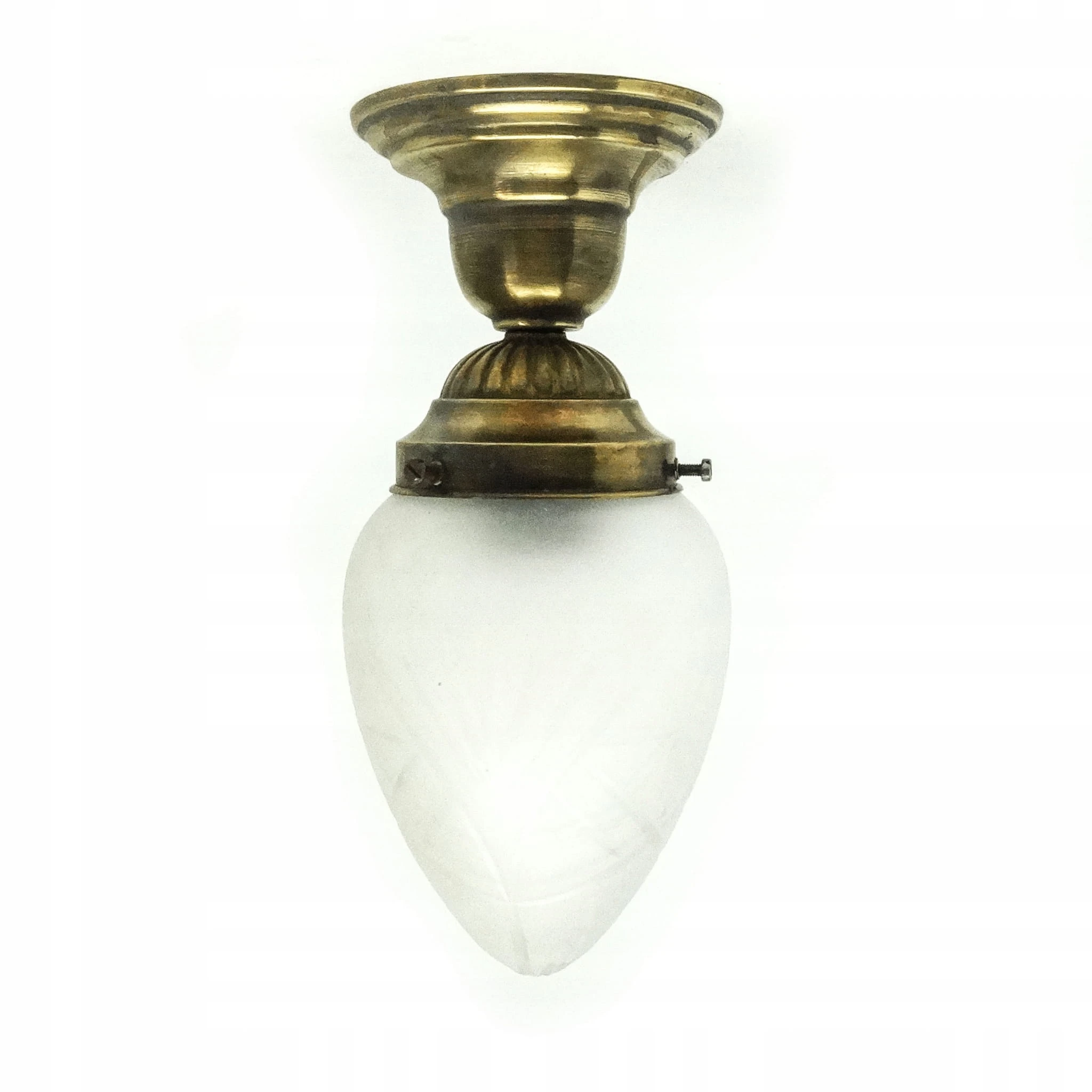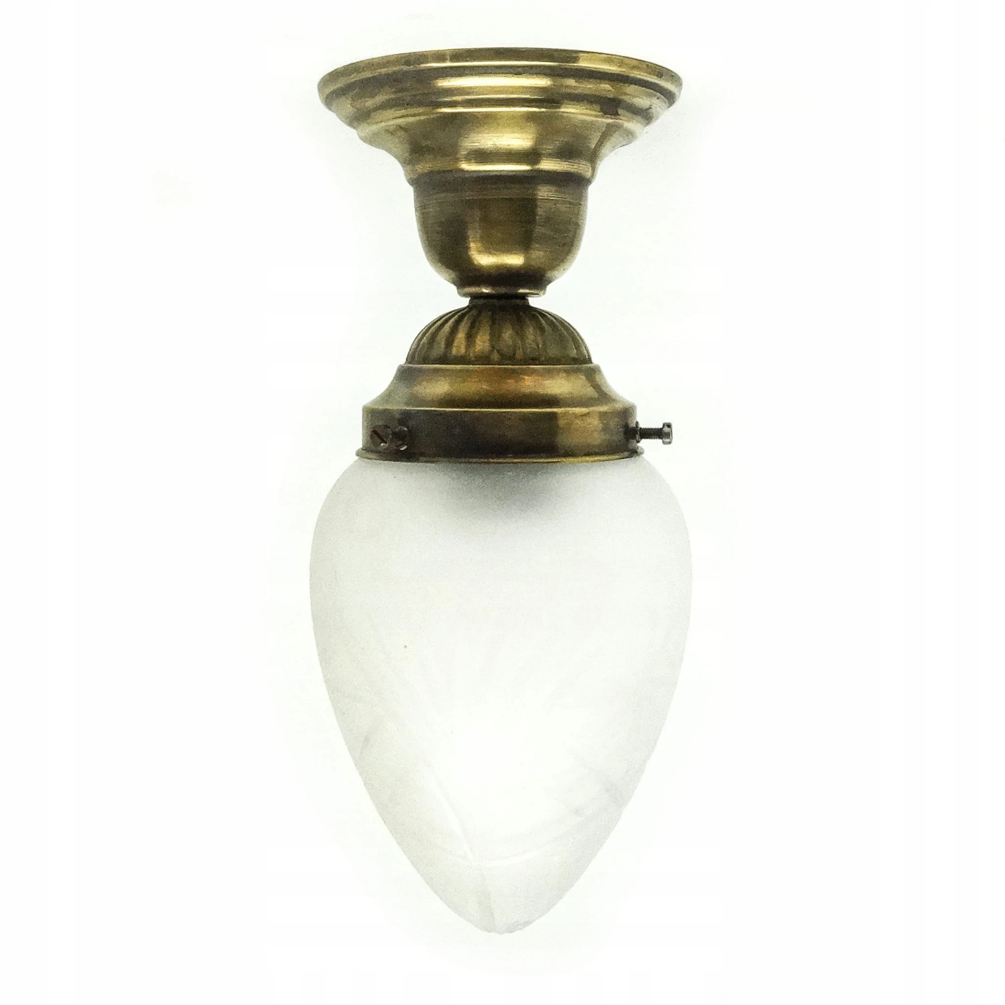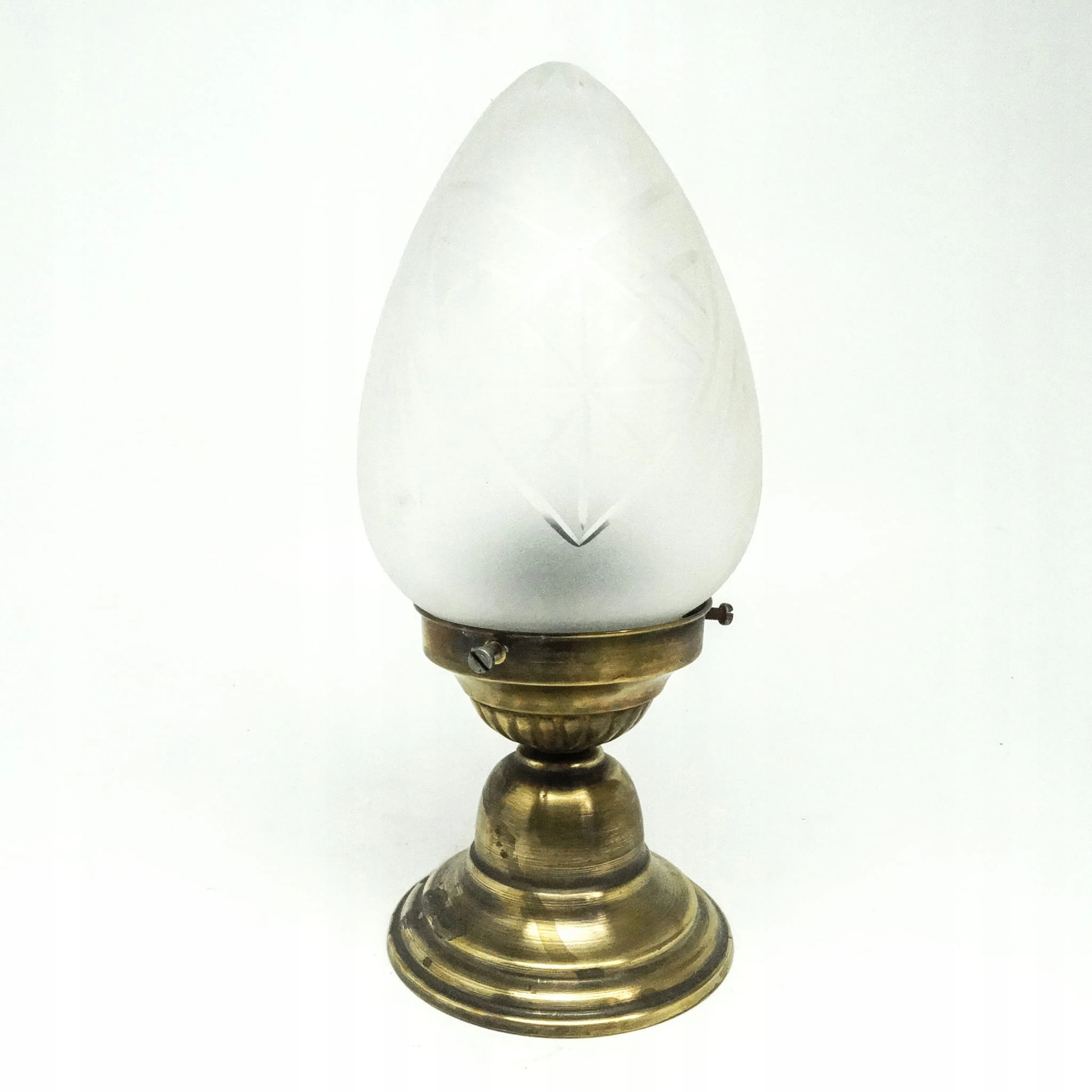 Lampa wisząca została wyprodukowana w latach 50. Konstrukcja jest mosiężna, klosz szklany. Zachowana jest w bardzo dobrym stanie, sprawna technicznie. Lampa przed wysyłką będzie miała wymienioną instalację elektryczną na nową.