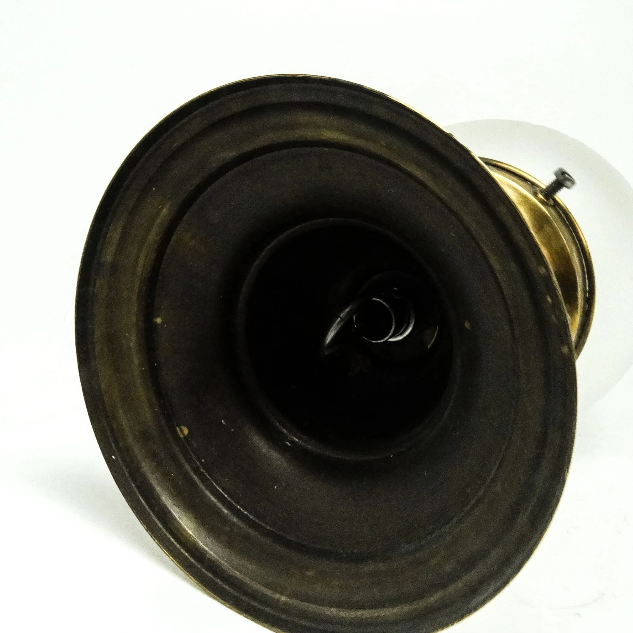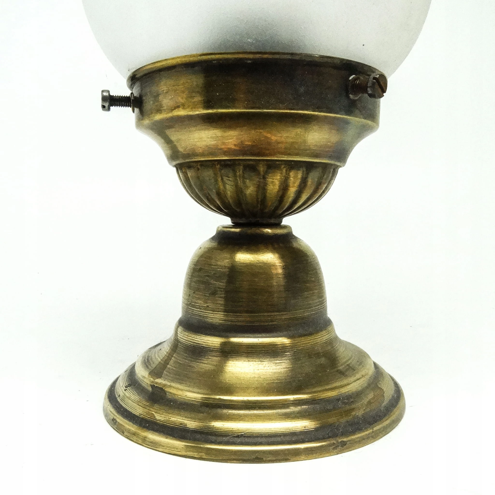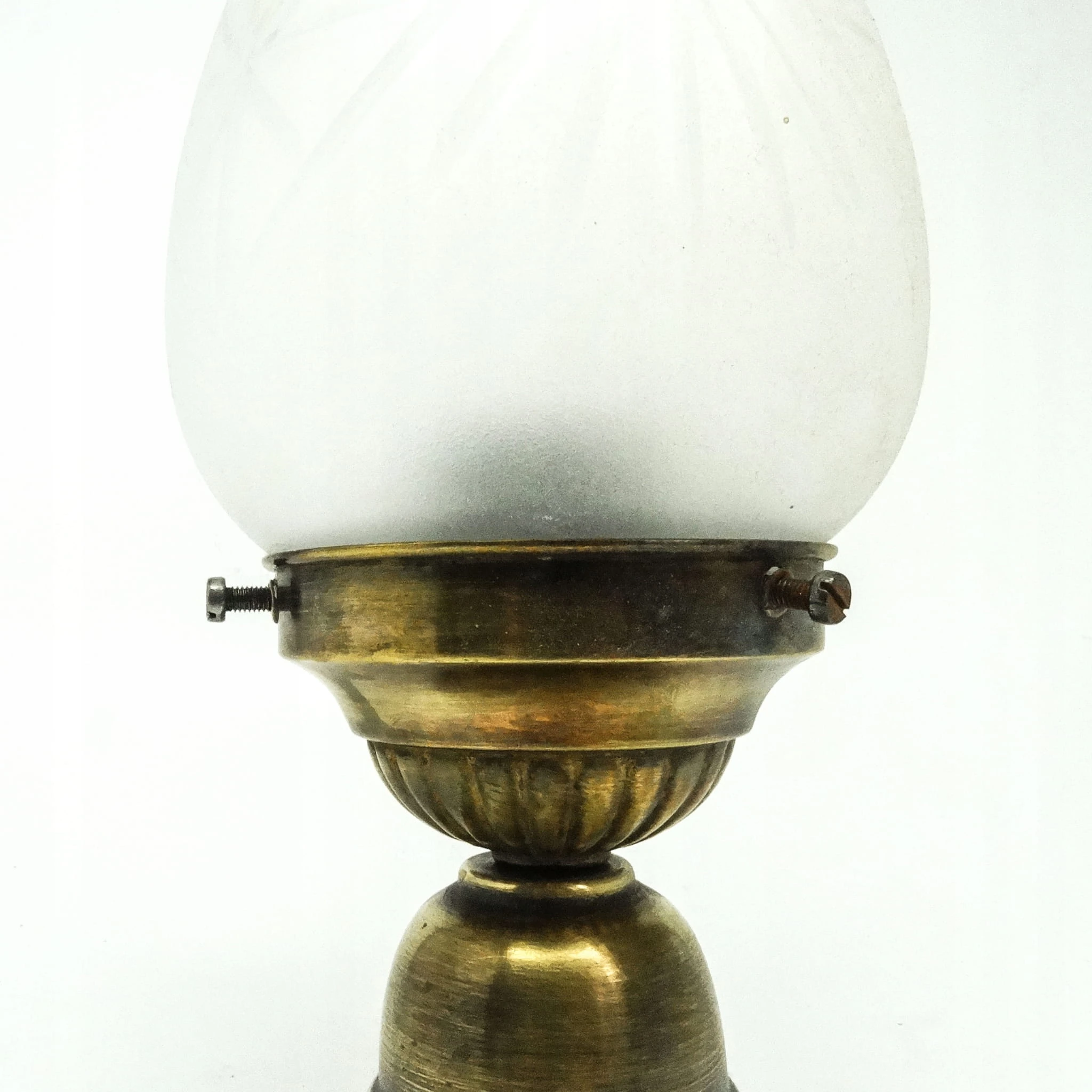 Lampa wisząca została wyprodukowana w latach 50. Konstrukcja jest mosiężna, klosz szklany. Zachowana jest w bardzo dobrym stanie, sprawna technicznie. Lampa przed wysyłką będzie miała wymienioną instalację elektryczną na nową.