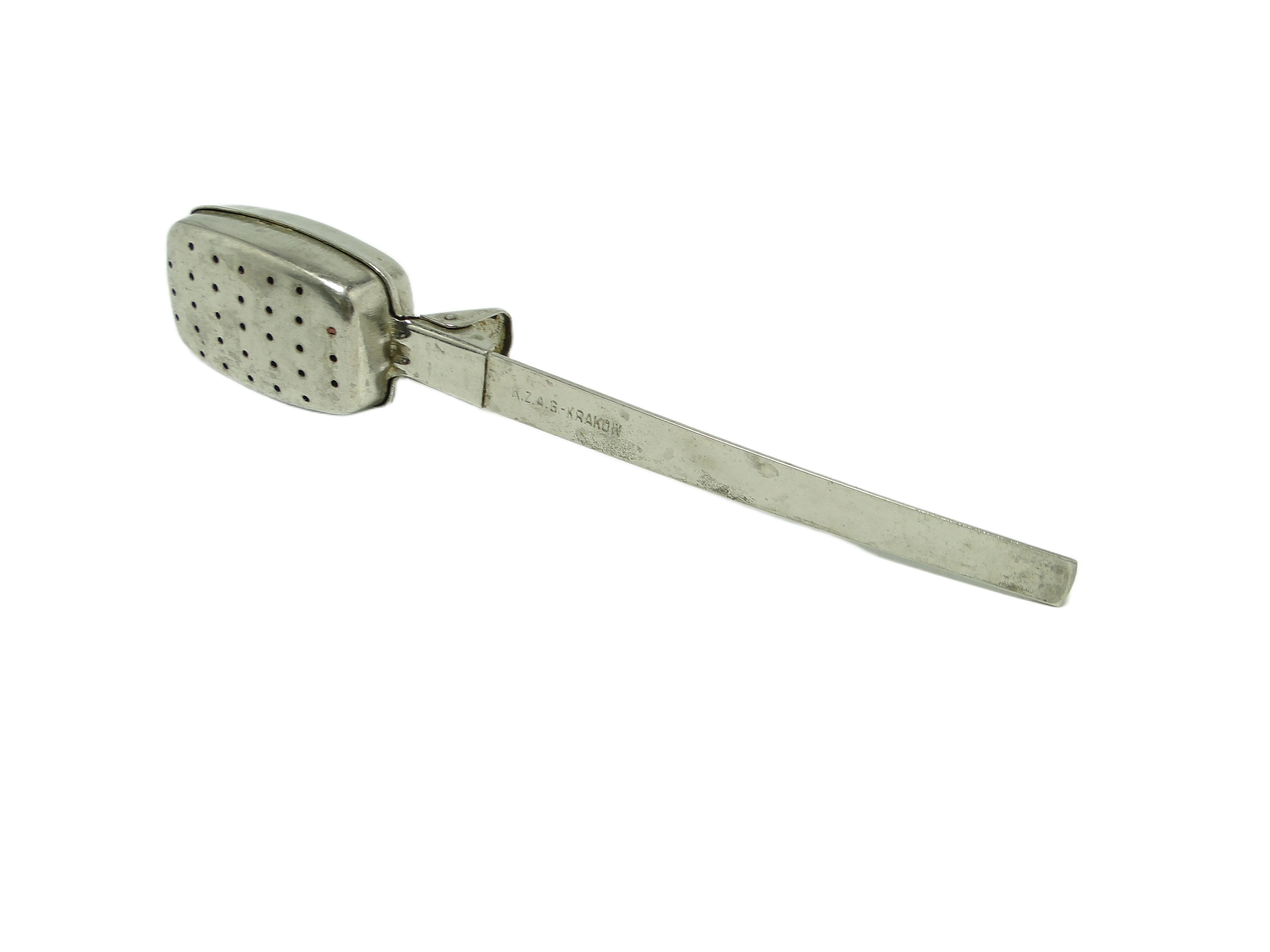Łyżka do parzenia herbaty z lat 50. XX wieku, pochodząca z terenów Związku Radzieckiego, została wykonana z mosiądzu srebrzonego. Utrzymana w chłodnym, lekko matowym odcieniu srebra, eksponuje prostotę konstrukcji typową dla industrialnego wzornictwa powojennego. Komora zaparzacza ma prostokątny kształt z zaokrąglonymi rogami i równomiernie rozmieszczonymi drobnymi otworami na obu ściankach, umożliwiającymi swobodny przepływ wody podczas parzenia. Płaska, niezdobiona rączka podkreśla funkcjonalny charakter przedmiotu, a solidny zawias umożliwia łatwe otwieranie i zamykanie komory na liście herbaty. Całość wykazuje lekko chropowatą fakturę oraz widoczne, drobne rysy i miejscową patynę – ślady użytkowania, które są zgodne z wiekiem przedmiotu. Zachowany w dobrym stanie, bez współczesnych modyfikacji, z oryginalnymi elementami oraz autentyczną warstwą czasu.W tej łyżce odnajduje się głos powojennej codzienności – przedmiot użytkowy, który nie szukał ozdób, lecz trwałości i praktyczności. Surowa, niemal ascetyczna forma przywołuje obraz kuchni, gdzie przedmioty z metalu służyły przez dekady, a każda rysa była śladem rodzinnych rytuałów i prostej, codziennej troski. Chłodne światło odbija się od lekko matowej powierzchni, a subtelne przyciemnienia wokół krawędzi i zawiasu cicho opowiadają o historii minionej epoki – o świecie, w którym wzornictwo miało przede wszystkim odpowiadać na realne potrzeby.Współcześnie łyżka sprawdzi się jako wyrazisty detal w kolekcji vintage, ekspozycji retro lub praktyczny dodatek w kuchni urządzonej w duchu industrialnym. Można zestawić ją z emaliowanymi naczyniami, półkami z surowego drewna czy ceramiką o minimalistycznej linii, tworząc spójny zestaw przedmiotów z historią. Dobrze odnajdzie się także wśród innych metalowych akcesoriów o prostych formach, stając się subtelnym, autentycznym akcentem dla miłośników wzornictwa połowy XX wieku.