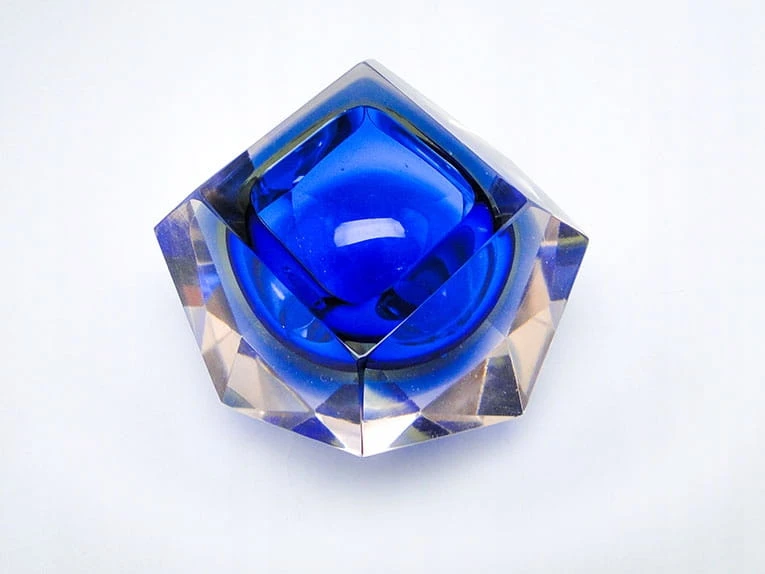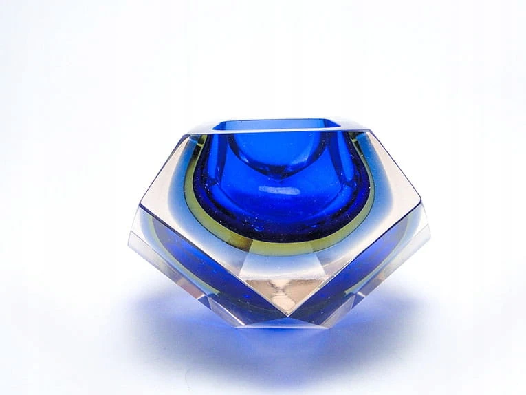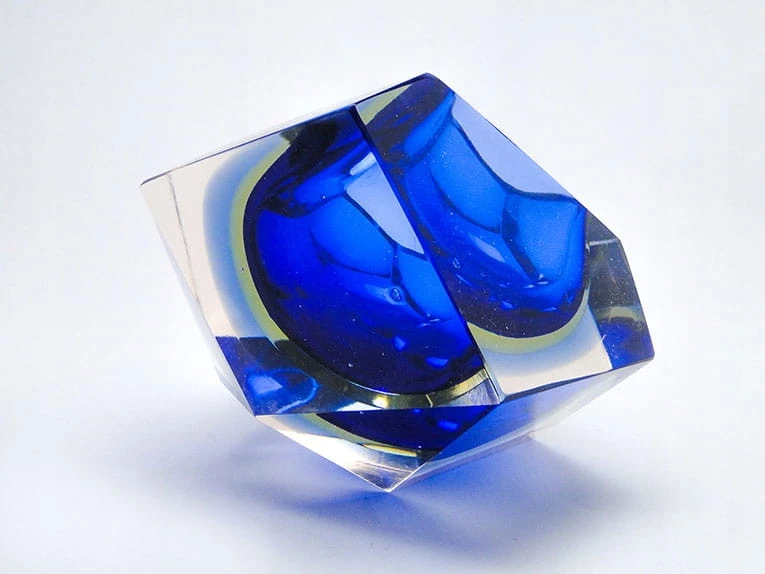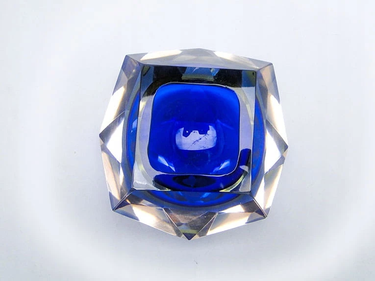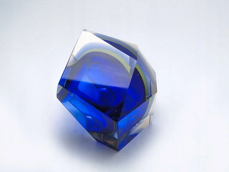Zaprojektowane przez Flavio Poli dla Seguso Vetri d'Arte. Szkło warstwowe, kryształowe bezbarwne, żłóte i czerwone - szlifowane szlifem płaszczyznowym.