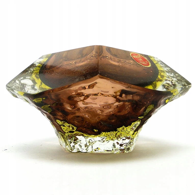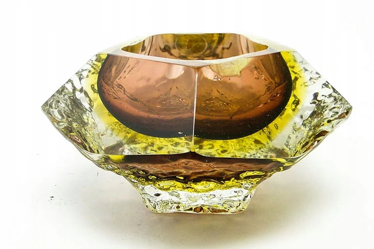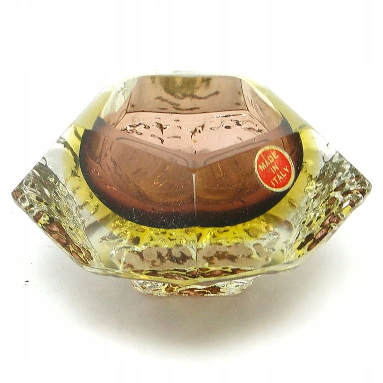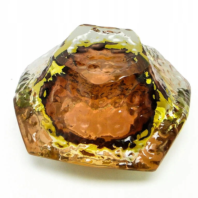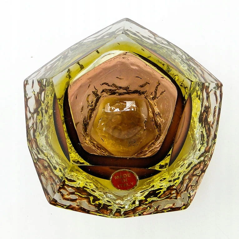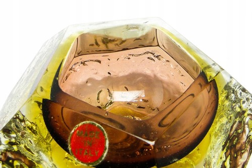 Zaprojektowane przez Flavio Poli dla Seguso Vetri d'Arte. Szkło warstwowe, kryształowe bezbarwne, żłóte i czerwone - szlifowane szlifem płaszczyznowym.