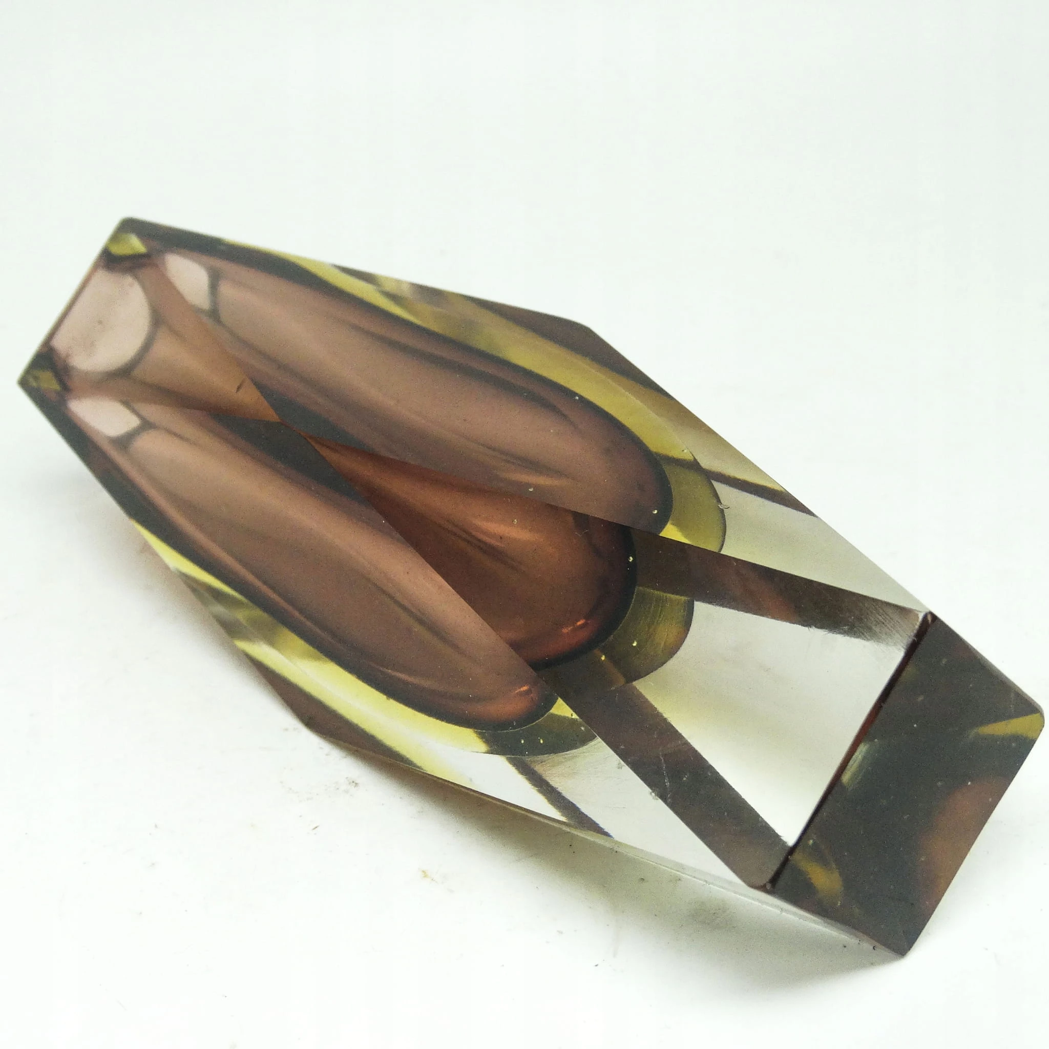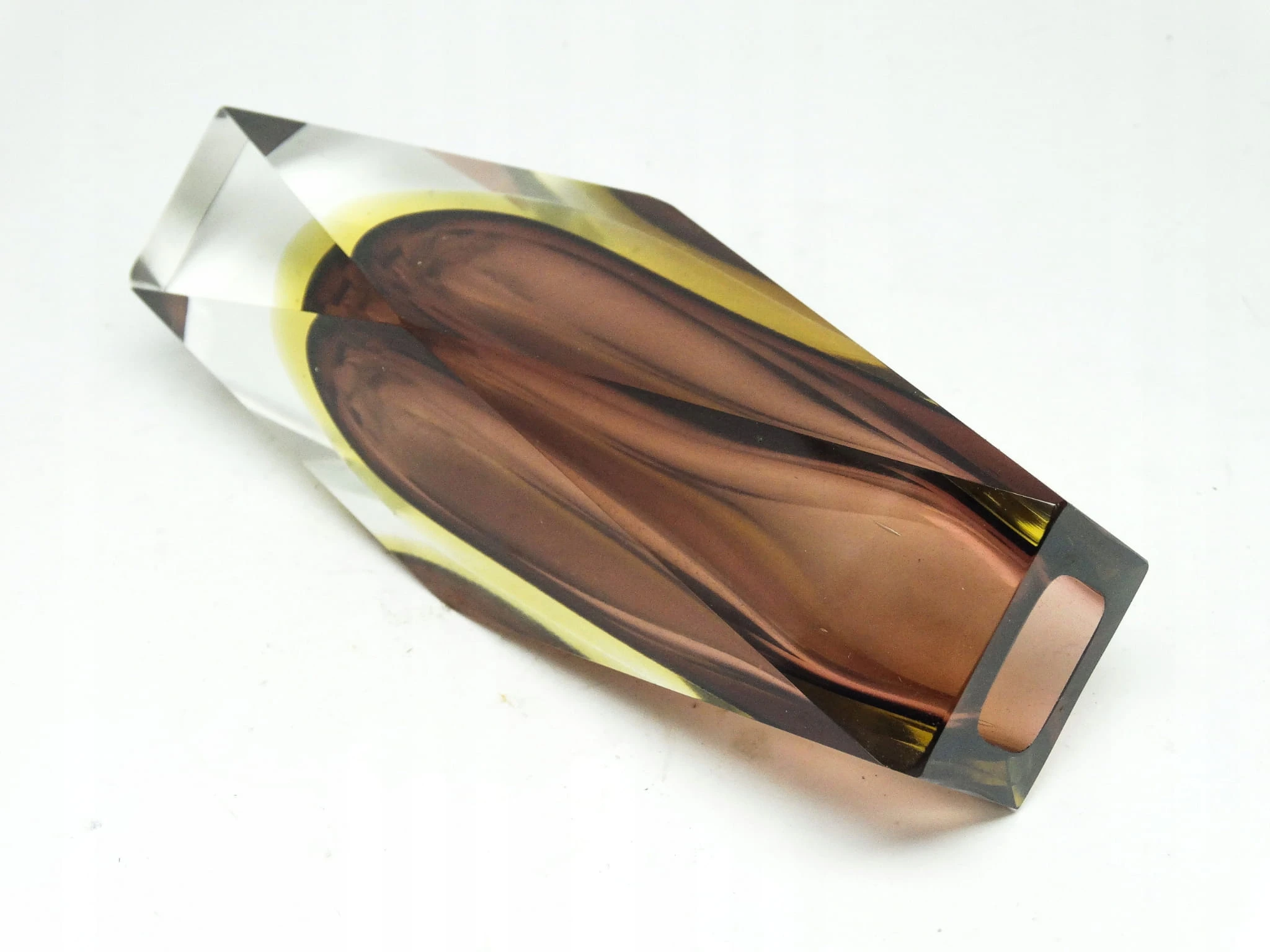 Wykonany w latach 1955-60, na terenie Włoch, techniką słoneczną tzw; Sommerso. Szkło warstwowe. Dobrze zachowane.