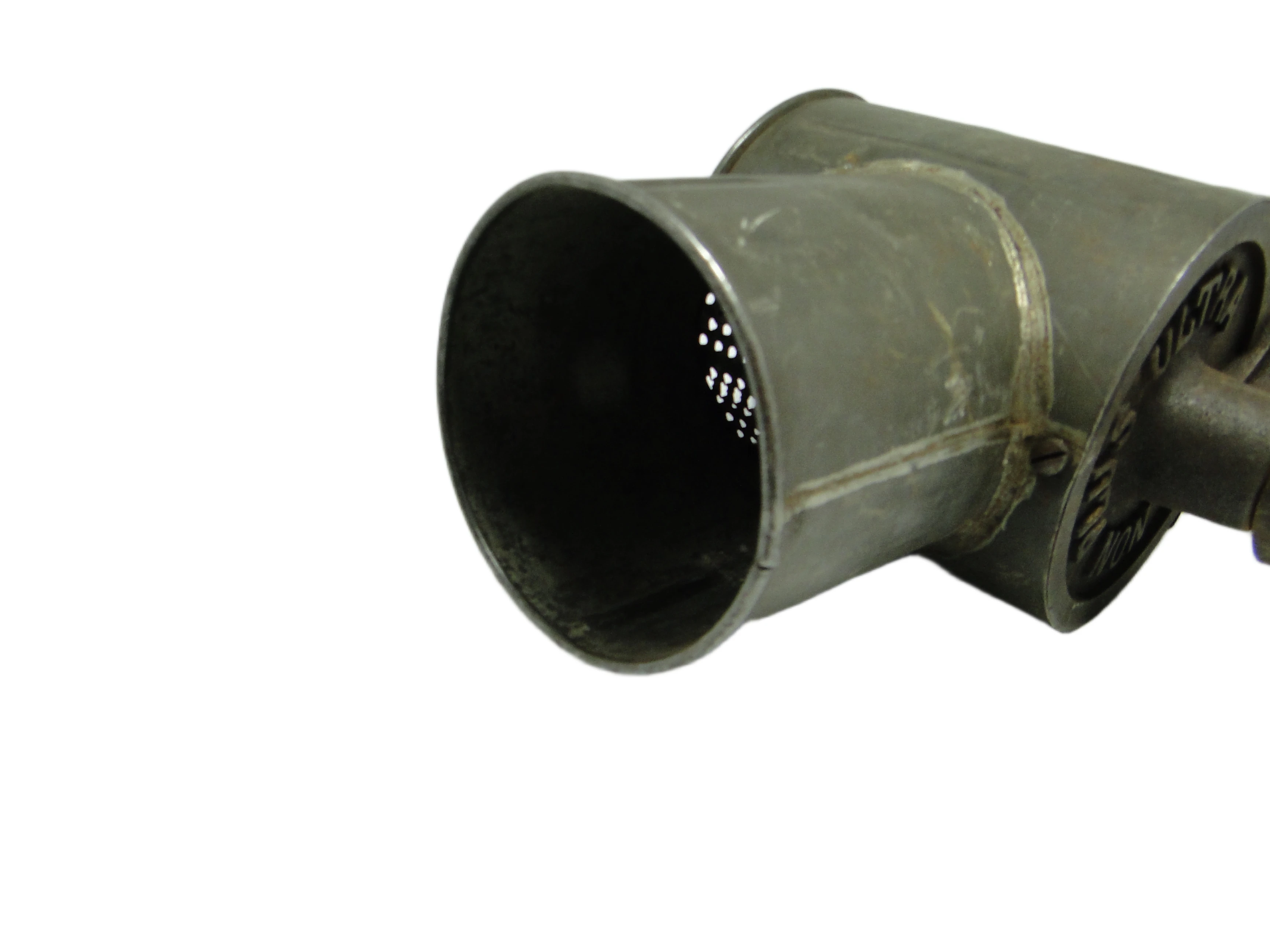 Maszynka do mielenia orzechów z początku XX wieku, wyprodukowana w Niemczech, stanowi przykład funkcjonalnego wzornictwa przemysłowego tego okresu. Jej konstrukcję tworzy masywny, cylindryczny bęben z matowego, ciemnoszarego metalu, z wyraźną patyną i śladami utlenienia, widocznymi szczególnie na powierzchni korpusu i ramionach. Wszystkie elementy łączone są za pomocą surowych nitów i śrub, bez dekoracji, co podkreśla surowy, industrialny charakter. Drewniana rączka w naturalnym, jasnobrązowym odcieniu eksponuje strukturę słojów i ślady wieloletniego użytkowania. Mechanizm opiera się na ręcznym obracaniu korbki, a śrubowy zacisk umożliwia stabilne mocowanie do blatu roboczego. Proporcje są wyważone: masywny bęben i solidne ramię wspierające mechanizm tworzą harmonijną, użytkową całość. Stan zachowania określa się jako dobry – widoczne są ślady czasu, rysy, patyna i drobne ogniska rdzy, lecz brak poważnych uszkodzeń czy braków.Forma tej maszynki opowiada historię codzienności wczesnego XX wieku, kiedy kuchenne narzędzia projektowano z myślą o wytrzymałości i prostocie. Surowy metal milczy o czasach, gdy przemysłowa precyzja spotykała się z domową rutyną, a każda rysa przypomina o setkach rodzinnych obiadów i powracających gestach. Drewniana rączka, wygładzona przez dłonie wielu użytkowników, zdaje się szeptać o dawnych zwyczajach i zmieniającym się tempie życia, kiedy trwałość i praktyczność były równie istotne jak smak przygotowywanych potraw.Współcześnie maszynka może zostać wyeksponowana na półce w kuchni urządzonej w duchu industrialnym, obok emaliowanych naczyń czy starych puszek, tworząc autentyczny akcent vintage. W aranżacjach eklektycznych warto połączyć ją z surowym drewnem, szkłem lub czarnym metalem, by podkreślić jej oryginalny rodowód. Może stać się nietuzinkowym elementem dekoracyjnym w otwartej jadalni lub kuchni z nutą loftowego klimatu, stanowiąc wyrazisty kontrapunkt dla współczesnych sprzętów.Brak szczegółowych danych technicznych. Metalowe powierzchnie wykazują typowe dla wieku przebarwienia i chropowatość, a drewniana rączka zachowała oryginalną strukturę i tonację. Zaleca się delikatne czyszczenie na sucho oraz unikanie wilgoci, by zachować naturalną patynę i zapobiec postępowi korozji.