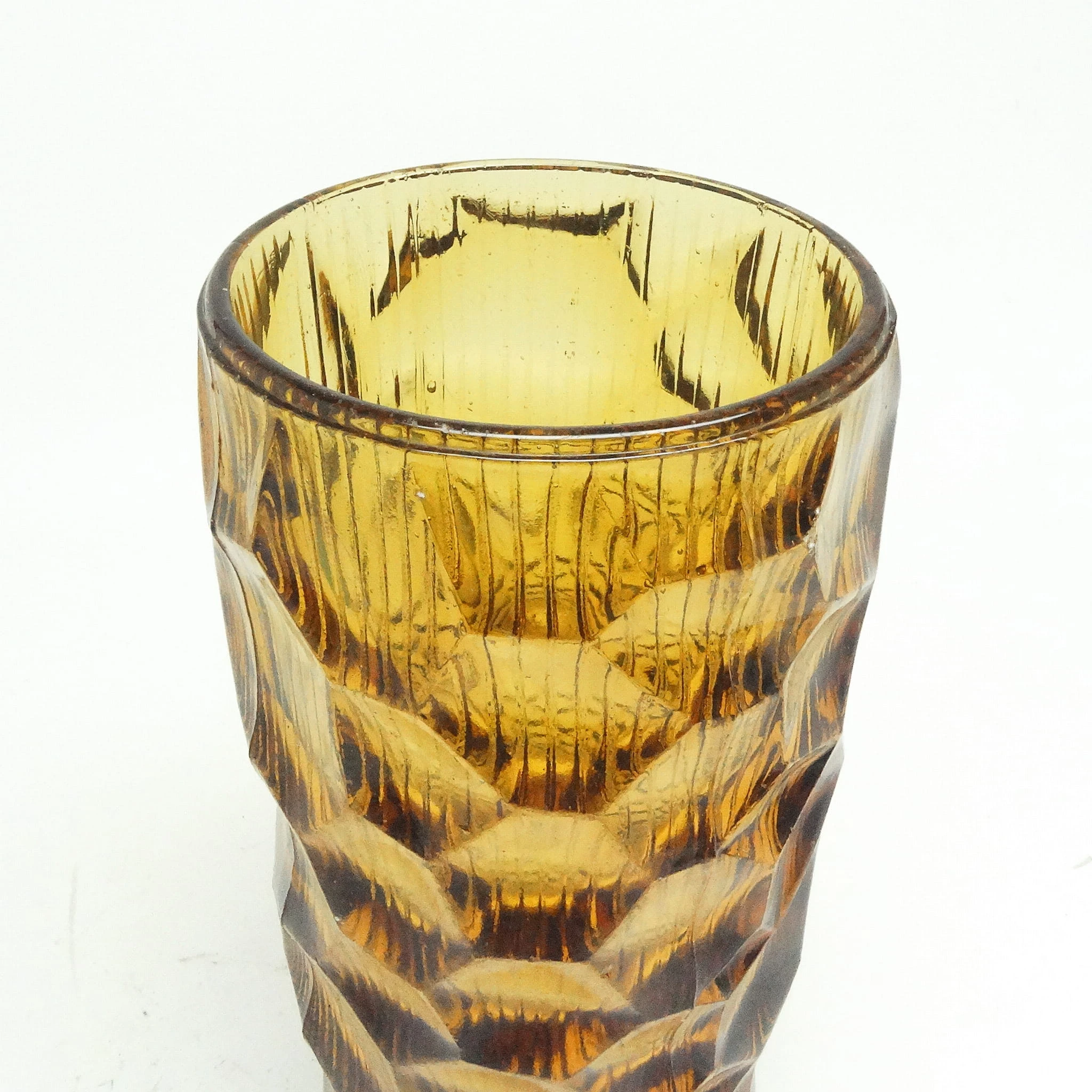 szkło sodowe, prasowane, barwione w masie u unikatowym wybarwieniu wys.: 22 cm, śr.: 10,5 cm