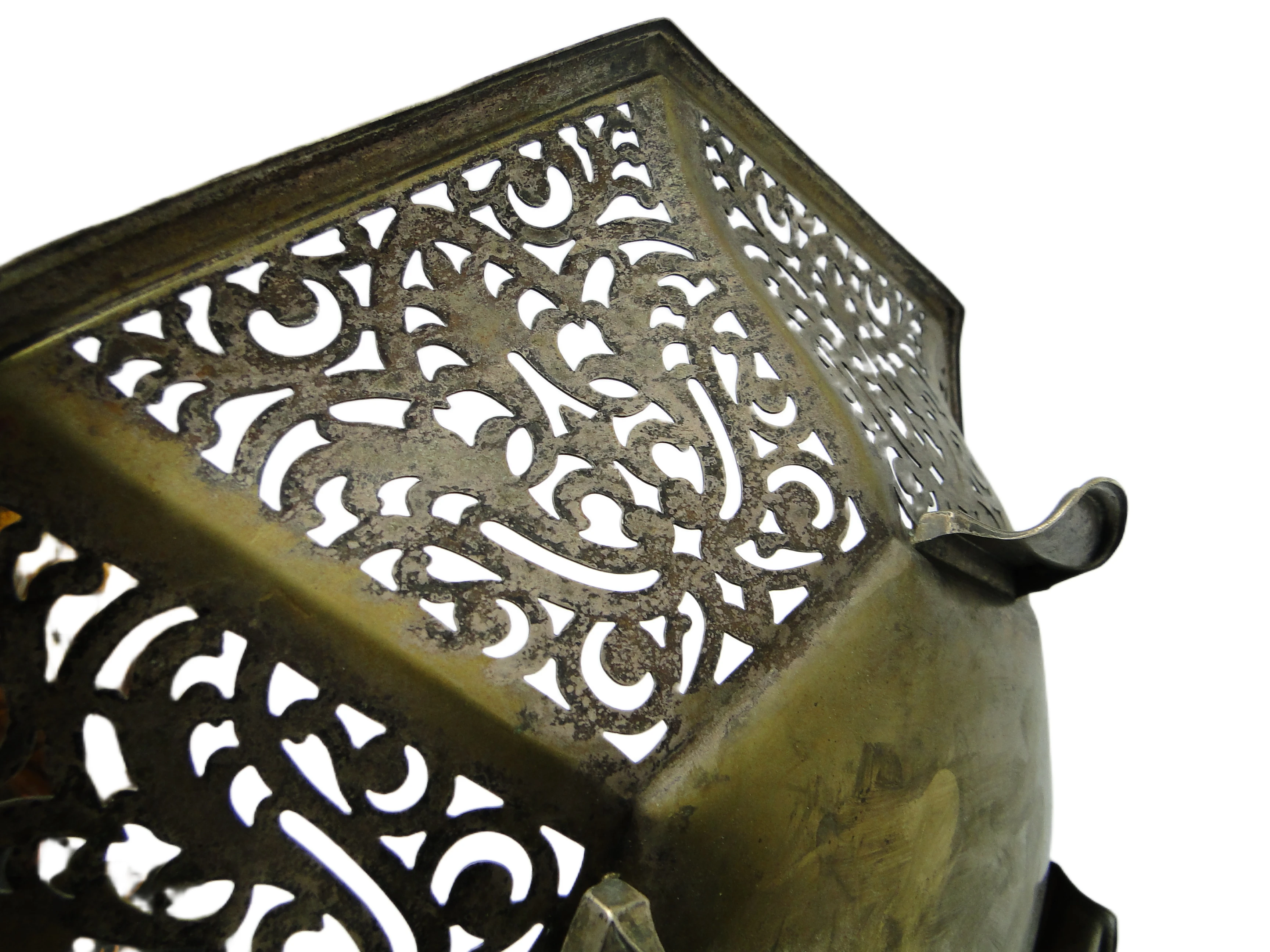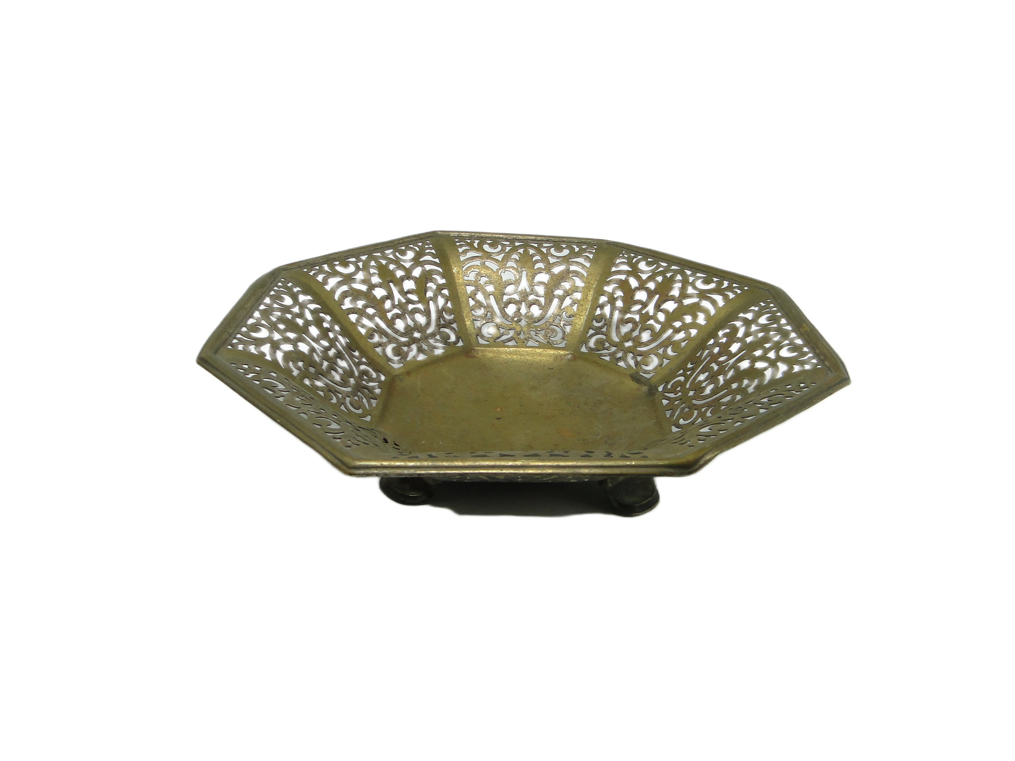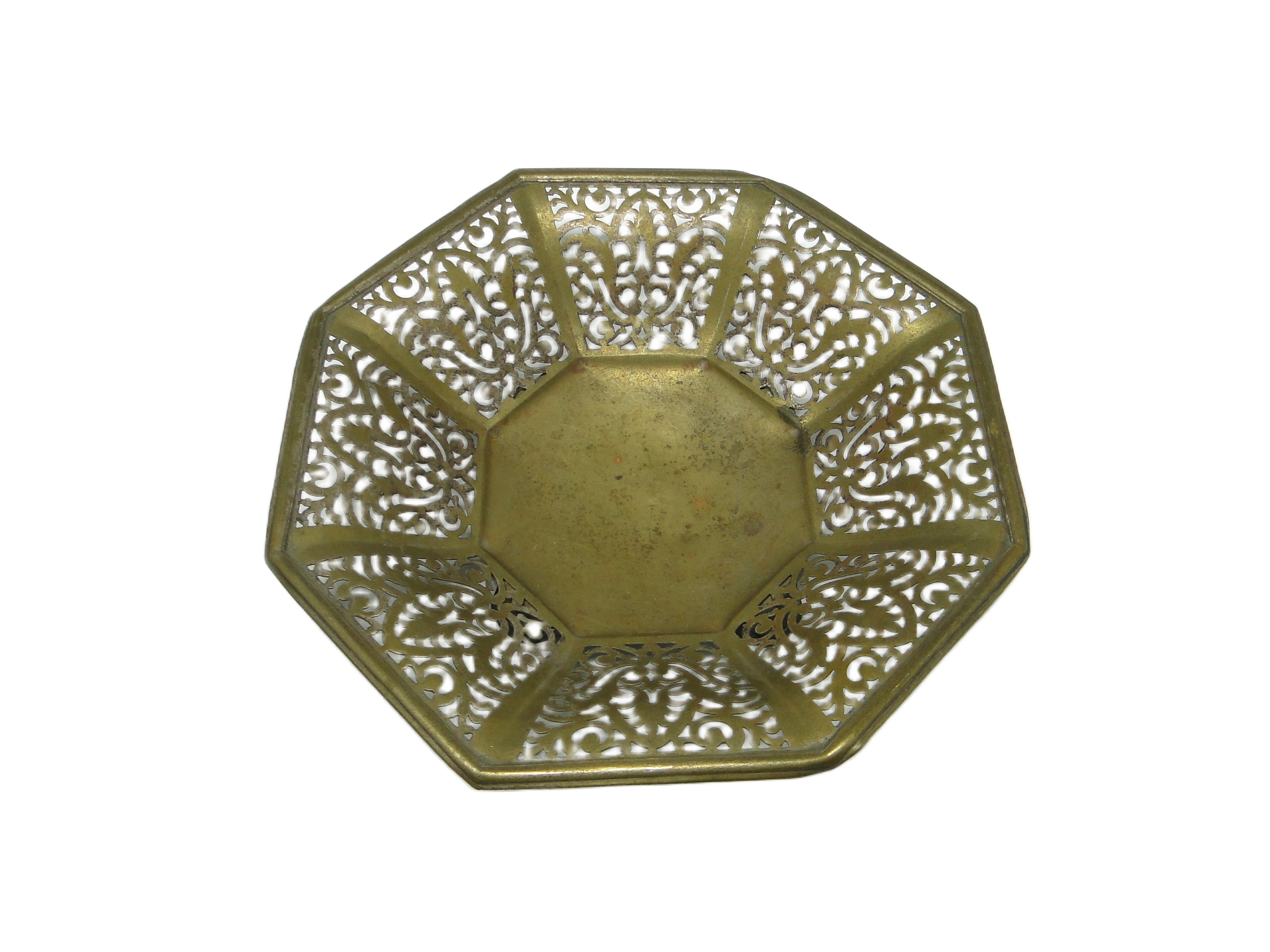 Dekoracyjna misa z lat 70., wykonana z mosiądzu, prezentuje ośmiokątną formę z ażurowymi, filigranowymi ściankami, ozdobionymi precyzyjnymi, symetrycznymi motywami inspirowanymi naturą. Dominującą tonację stanowi przytłumione, ciepłe złoto z widoczną patyną oraz delikatnymi śladami utlenienia, charakterystycznymi dla dojrzałego metalu. Powierzchnia jest matowa z subtelnym satynowym połyskiem na wypukłych detalach. Trzy niewielkie, zaokrąglone nóżki unoszą misę lekko nad powierzchnią, podkreślając jej ozdobny charakter. Ornamentyka kontynuuje tradycję secesji, łącząc organiczne linie z geometrycznym porządkiem. Stan zachowania określony jako dobry – widoczne są drobne ślady użytkowania i naturalna patyna, które potwierdzają autentyczność przedmiotu.W tej misie pobrzmiewa głos epoki, w której rzemiosło i natura tworzyły wspólną narrację. Ażurowe zdobienia przywodzą na myśl koronkę, jakby metal próbował uchwycić lekkość liści i wijących się pędów. Ciepły odcień złota i szlachetna patyna wywołują skojarzenia z delikatnie przyciemnionym salonem, gdzie światło przenika przez filigranowe ściany, a każdy przedmiot staje się nośnikiem minionych tradycji europejskiego wzornictwa.Misa może stanowić centralny element na dębowym stole w salonie vintage lub dopełnienie kolekcji dekoracyjnych obiektów w otoczeniu drewna, szkła czy ceramiki. Warto zestawić ją z innymi przedmiotami w stylu secesyjnym, lecz równie interesująco zaprezentuje się w eklektycznym wnętrzu z nowoczesnymi akcentami – na półce z książkami, komodzie lub konsoli w przedpokoju. Można ją połączyć z miękkimi tkaninami w naturalnych barwach dla podkreślenia organicznej linii lub z ciemniejszymi dodatkami, co wydobędzie matowe złoto i ażurową grę światła.