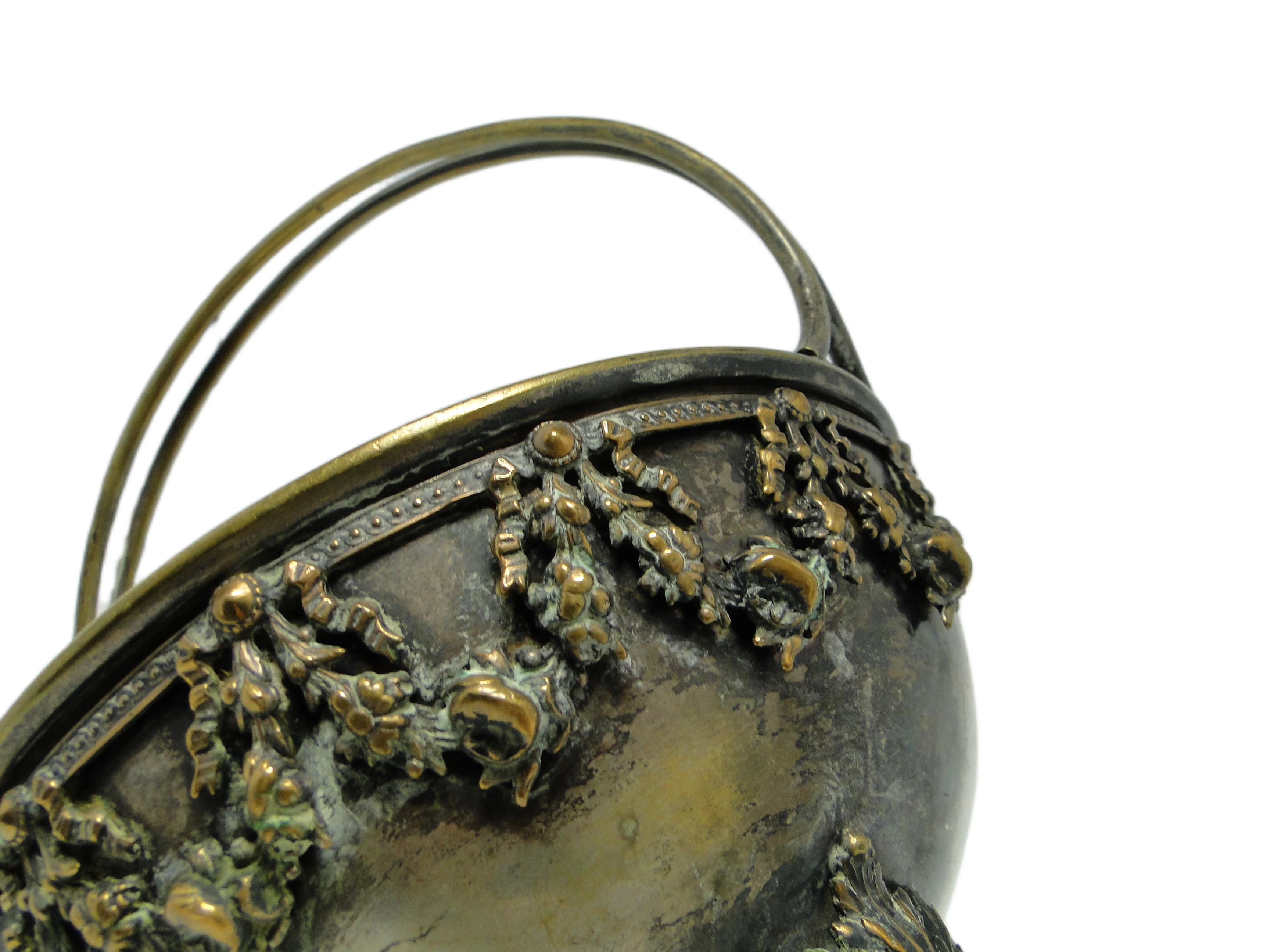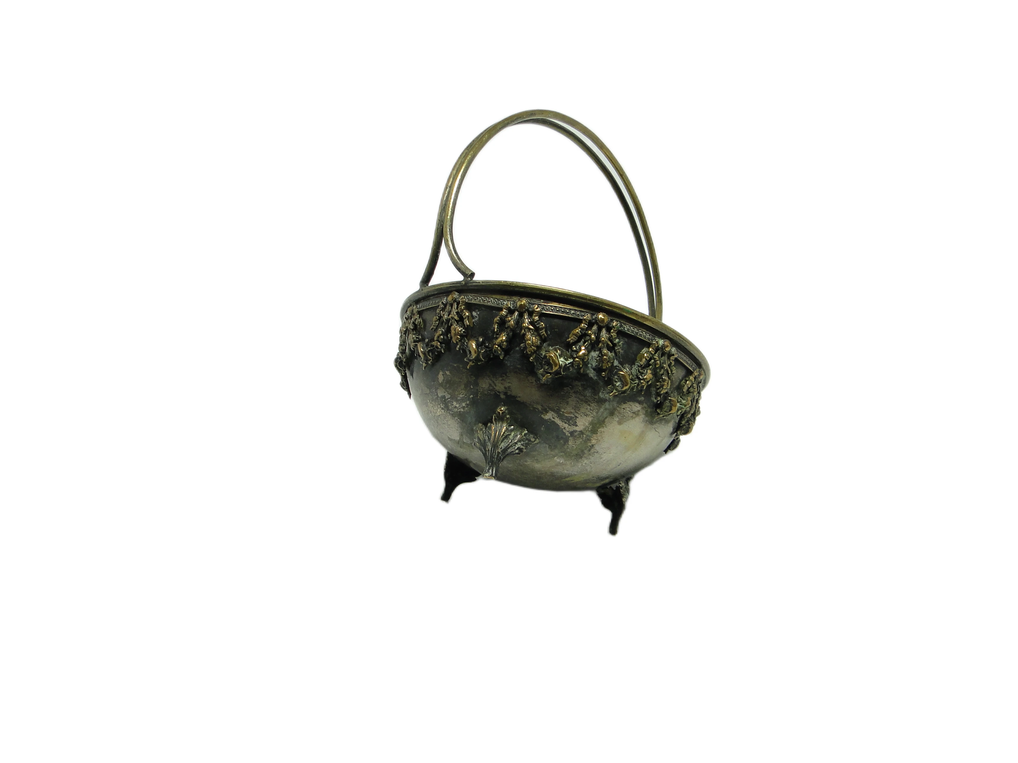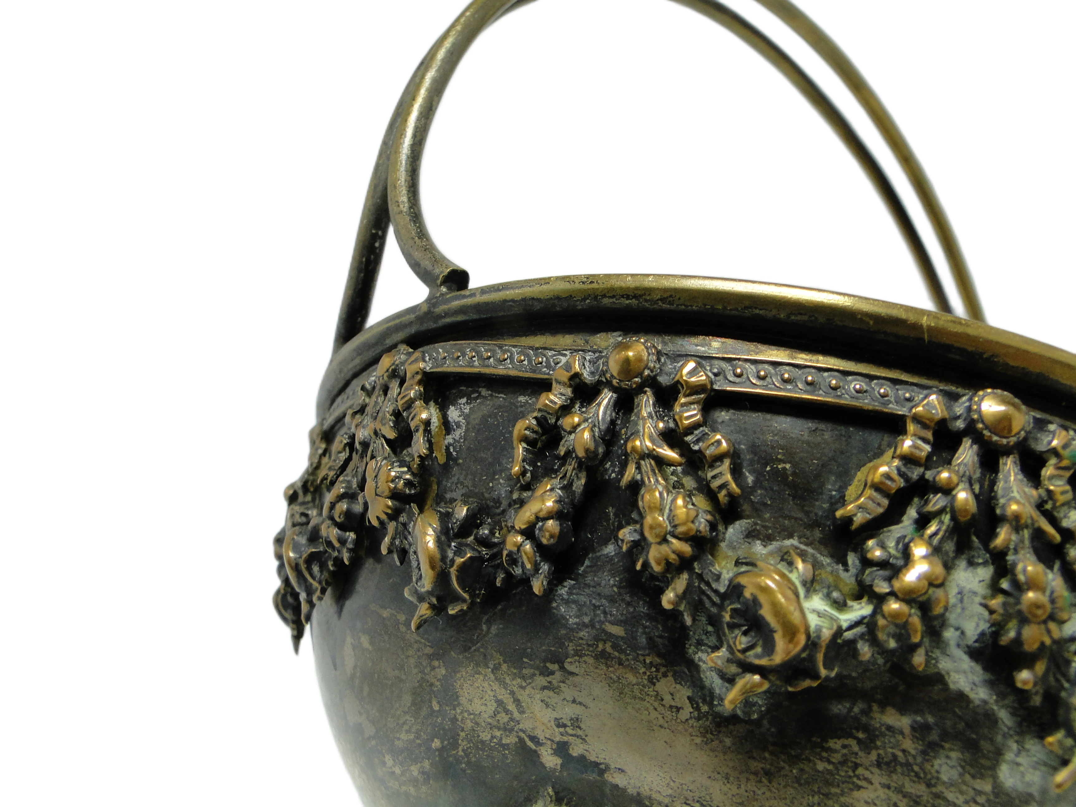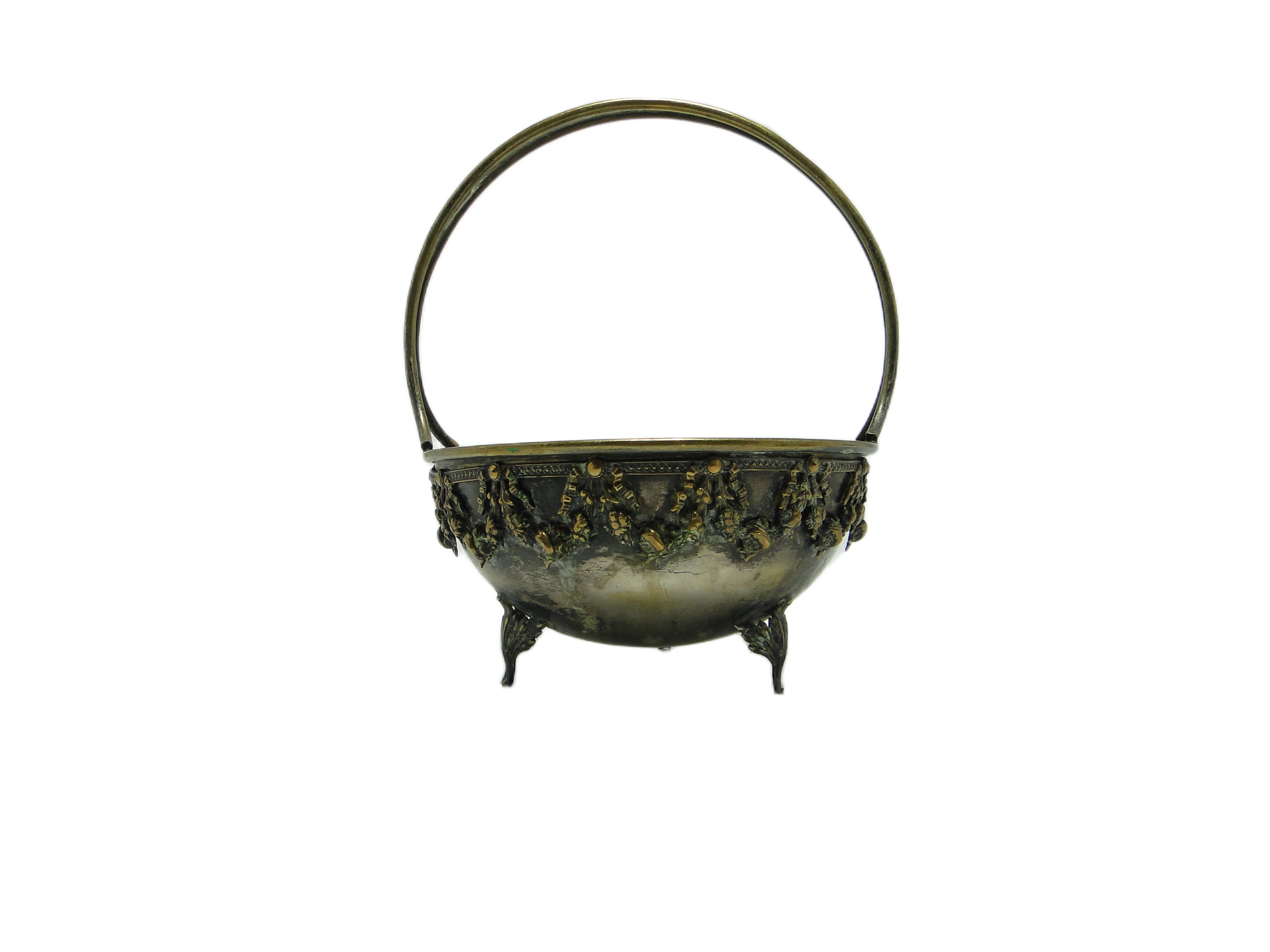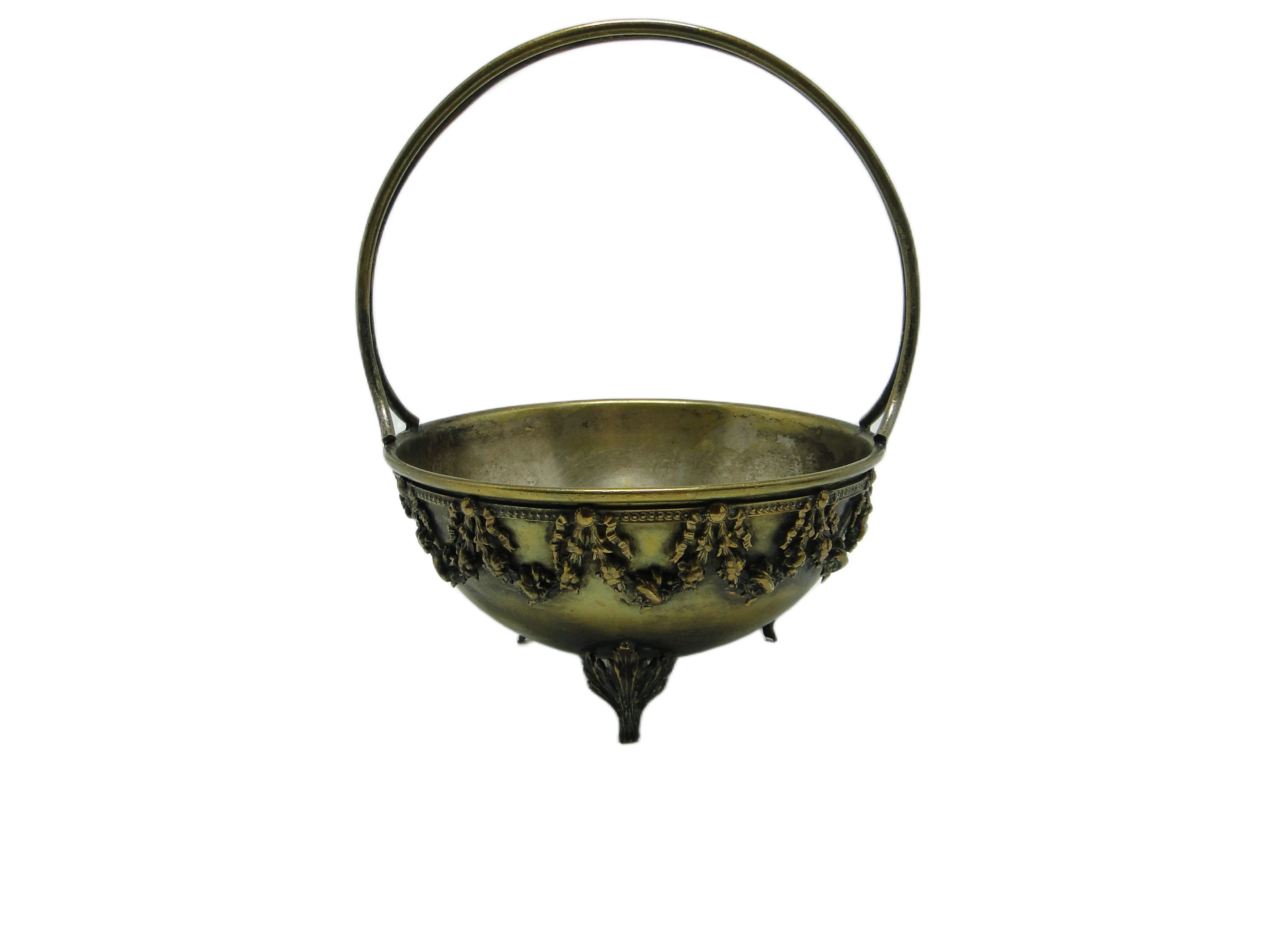 Dekoracyjna misa lub koszyk z lat 30. wykonana z mosiądzu, prezentuje szeroką, płytką bryłę w ciepłym, złocisto-brązowym odcieniu. Powierzchnia obiektu utrzymana jest w półmatowym wykończeniu z delikatnym połyskiem, miejscami przyciemniona naturalną patyną oraz subtelnymi śladami użytkowania. Górny rant zdobi bogaty, wypukły ornament w postaci girland i motywów roślinnych inspirowanych klasycyzmem oraz barokiem, natomiast smukły, łukowaty uchwyt z prostą linią mocowany jest po obu stronach. Całość wspiera się na trzech dekoracyjnych nóżkach, z których każda posiada ornamentalny detal, podkreślając charakterystyczną dla tej epoki dbałość o rzemiosło. Proporcje pozostają harmonijne – misa jest płytka, lecz szeroka, a uchwyt wyraźnie góruje nad całością, nadając lekkości całej formie. Stan zachowania bardzo dobry: widoczne są drobne rysy, patyna oraz możliwe ślady wcześniejszego czyszczenia, bez poważnych uszkodzeń czy ingerencji.Obiekt ten zdaje się opowiadać historię epoki, w której inspiracje dawnymi stylami powracały w dekoracyjnym rzemiośle lat 70. Mosiądz, z jego naturalnym przygaszeniem i ciepłem, przenosi w świat wnętrz, gdzie ornament był świadomym wyborem i wyrazem przywiązania do tradycji. Wysoki uchwyt, jak gest wyciągniętej dłoni, zaprasza do spotkania z codziennością minionych dekad, a reliefy girland i kwiatowych motywów przywołują ducha dawnych salonów i rodzinnych uroczystości.Misa doskonale odnajdzie się na komodzie lub stole w salonie o klasycznym lub eklektycznym charakterze. Można ją zestawić z porcelanową paterą, kryształową karafką lub szkłem z epoki, a także z miękkimi tekstyliami – adamaszkiem czy welurem – które podkreślą jej historyczny rodowód. Równie dobrze sprawdzi się jako dekoracyjny akcent w nowoczesnej przestrzeni, wnosząc kontrastowy akcent złocistego metalu do stonowanej kolorystyki. Warto połączyć ją z innymi elementami z lat 70., by wydobyć wielowarstwowość aranżacji.
