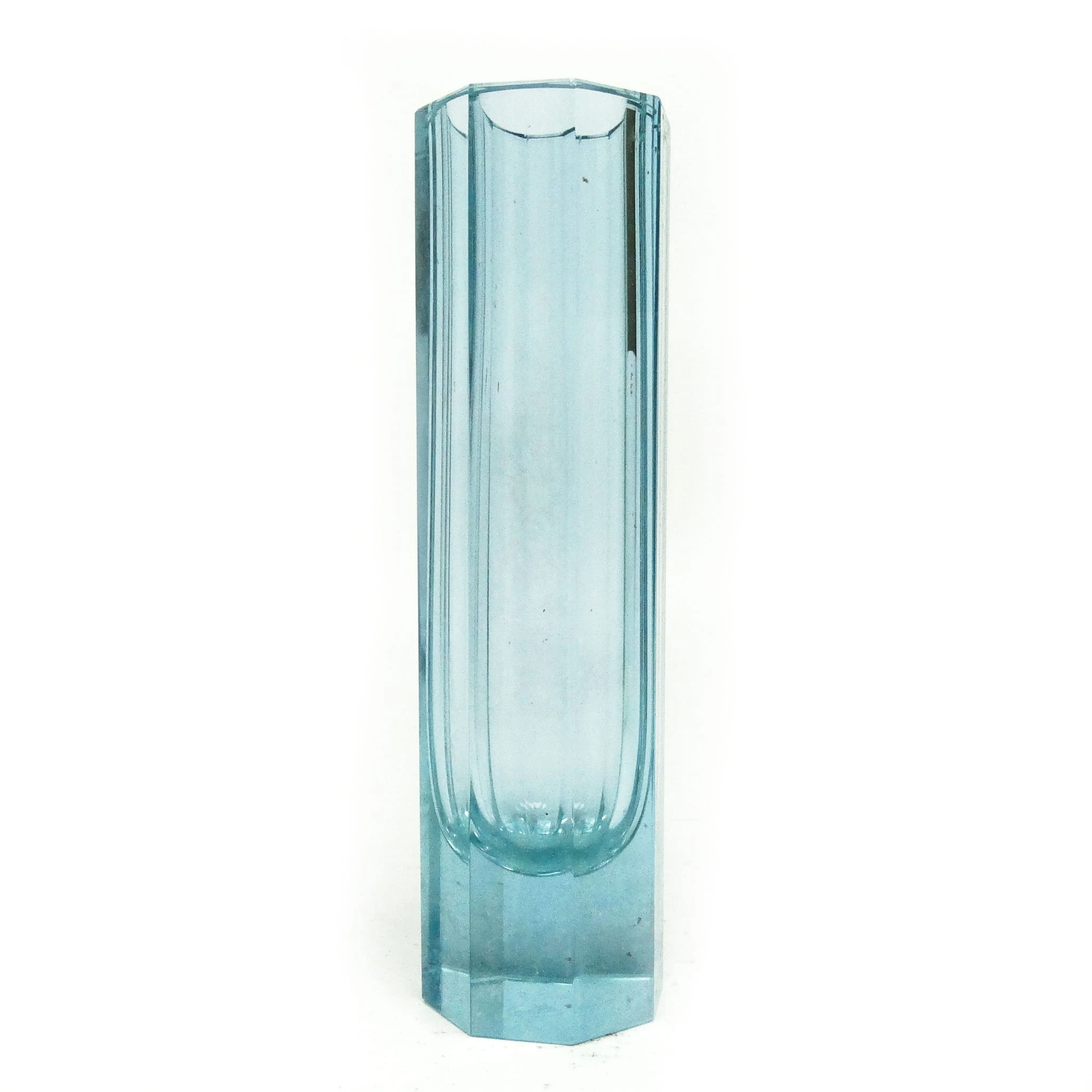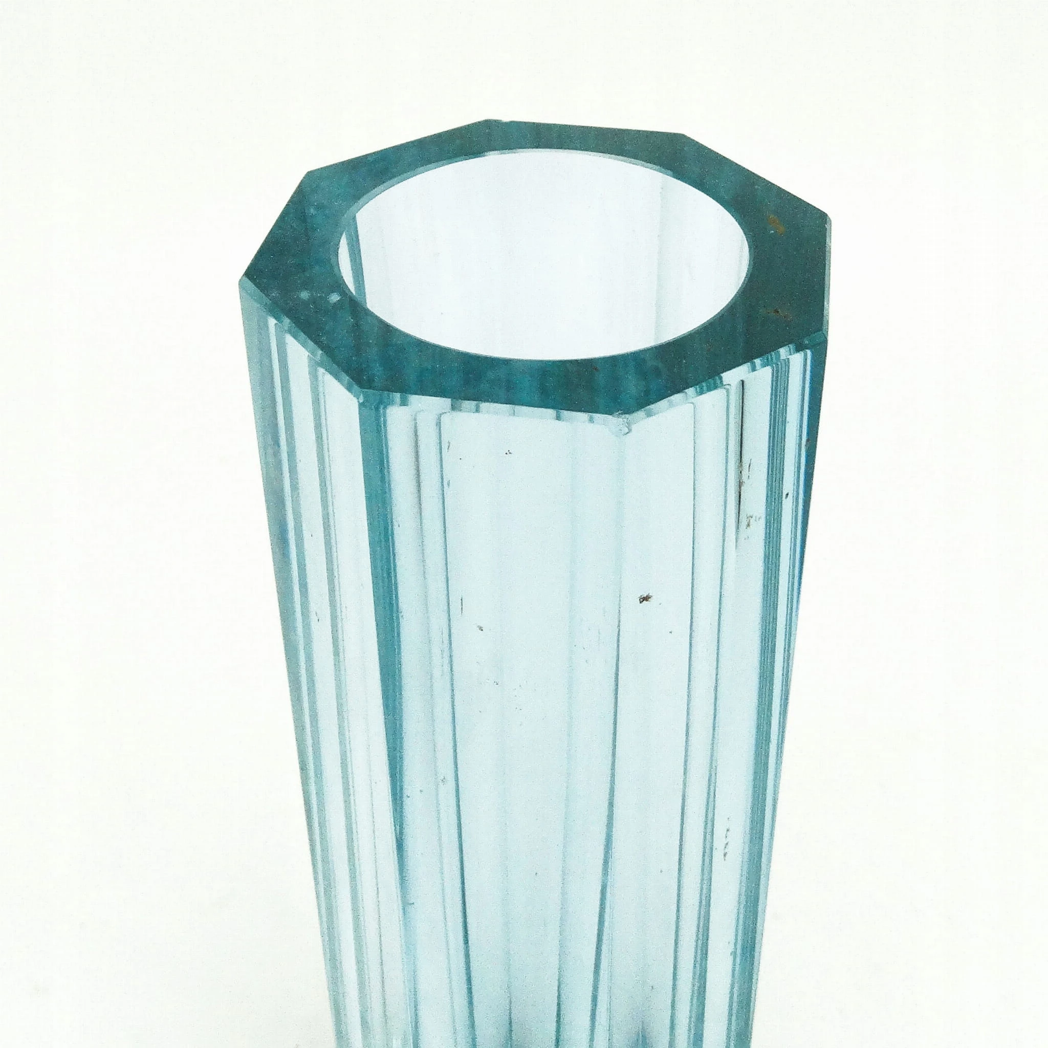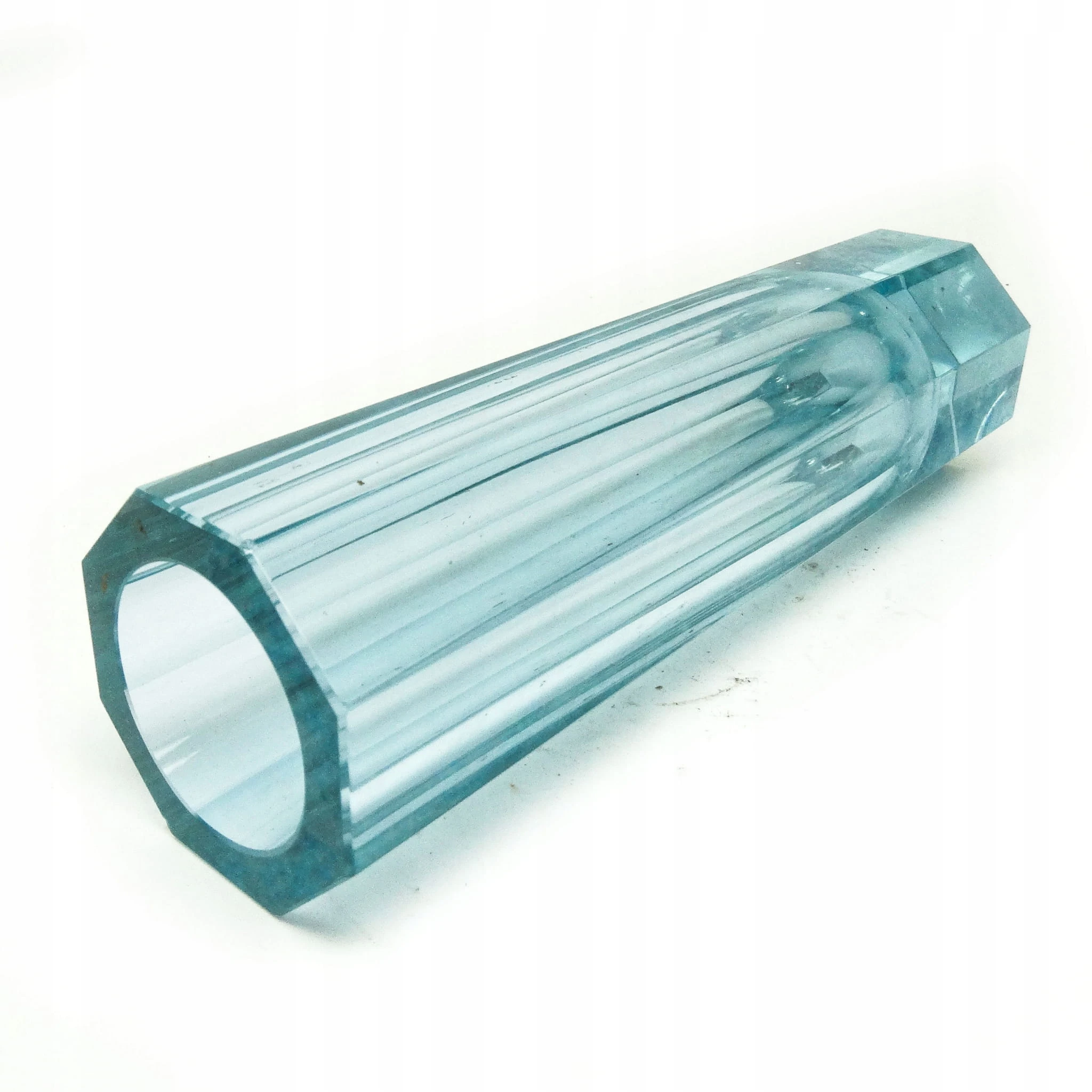 Wazon wyprodukowany został w Czechosłowacji w mieście Karlove Vary w latach 30. przez wytwórnie Moser. Wykonany jest z fasetowanego szkła. Zachowany jest w bardzo dobrym stanie. Sygnowany. Jest to szkło aleksandrytowe - zmienia kolor pod wpływem promieni UV z fioletowego na seledynowy.