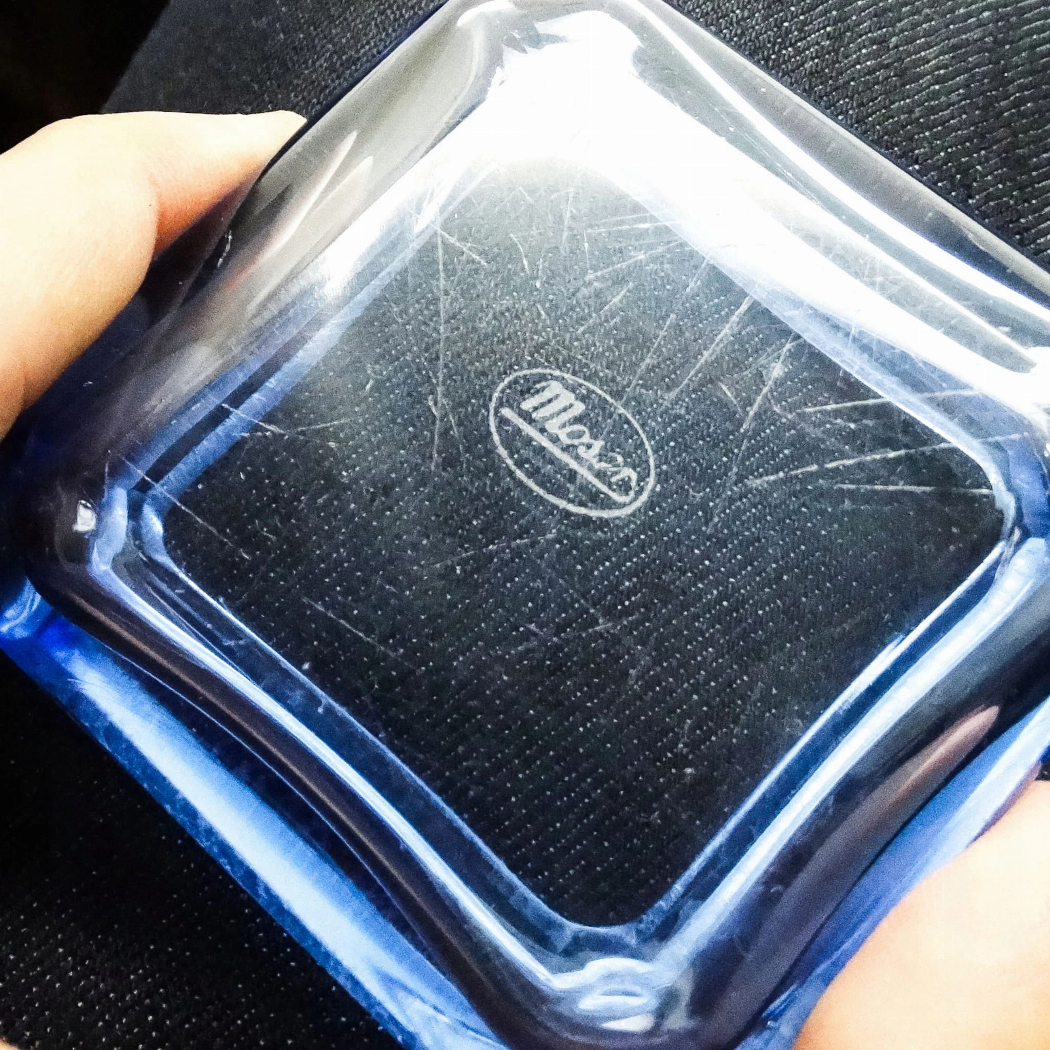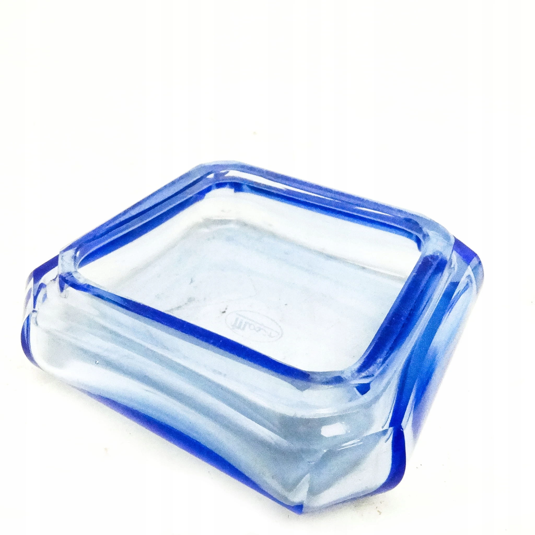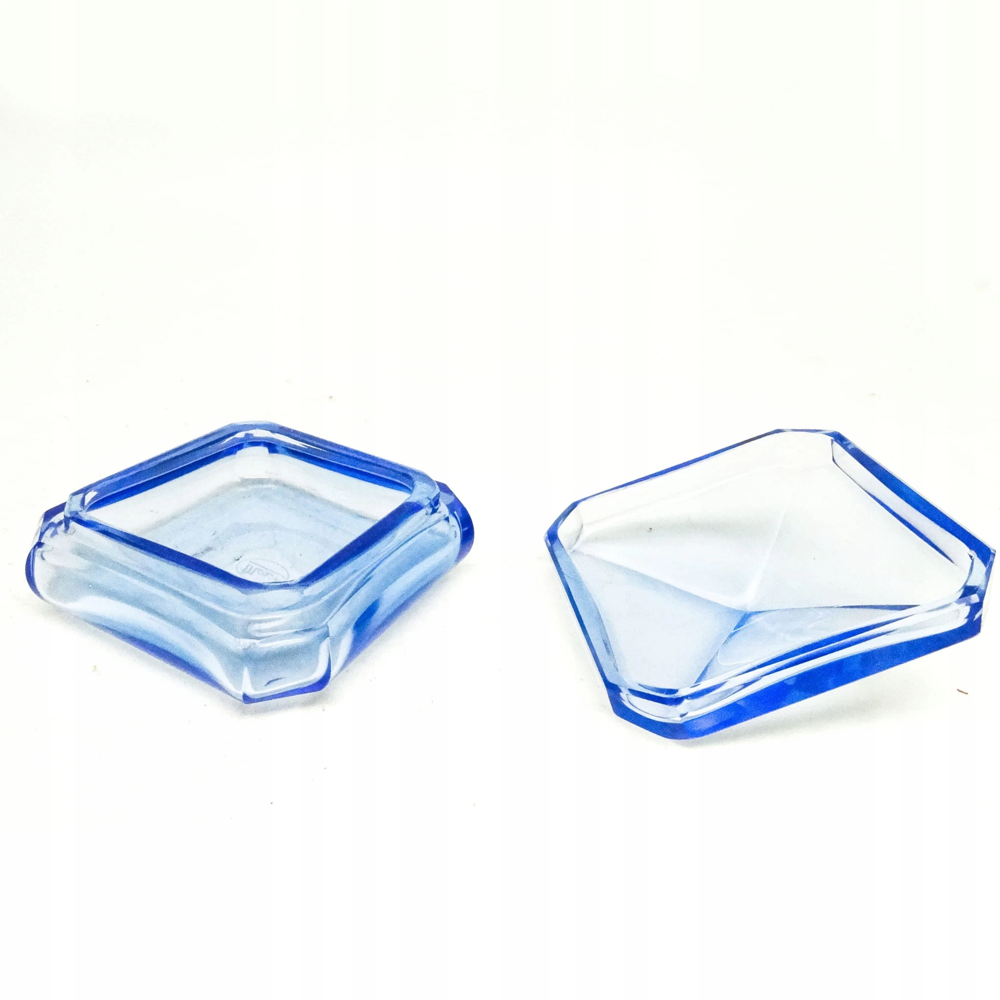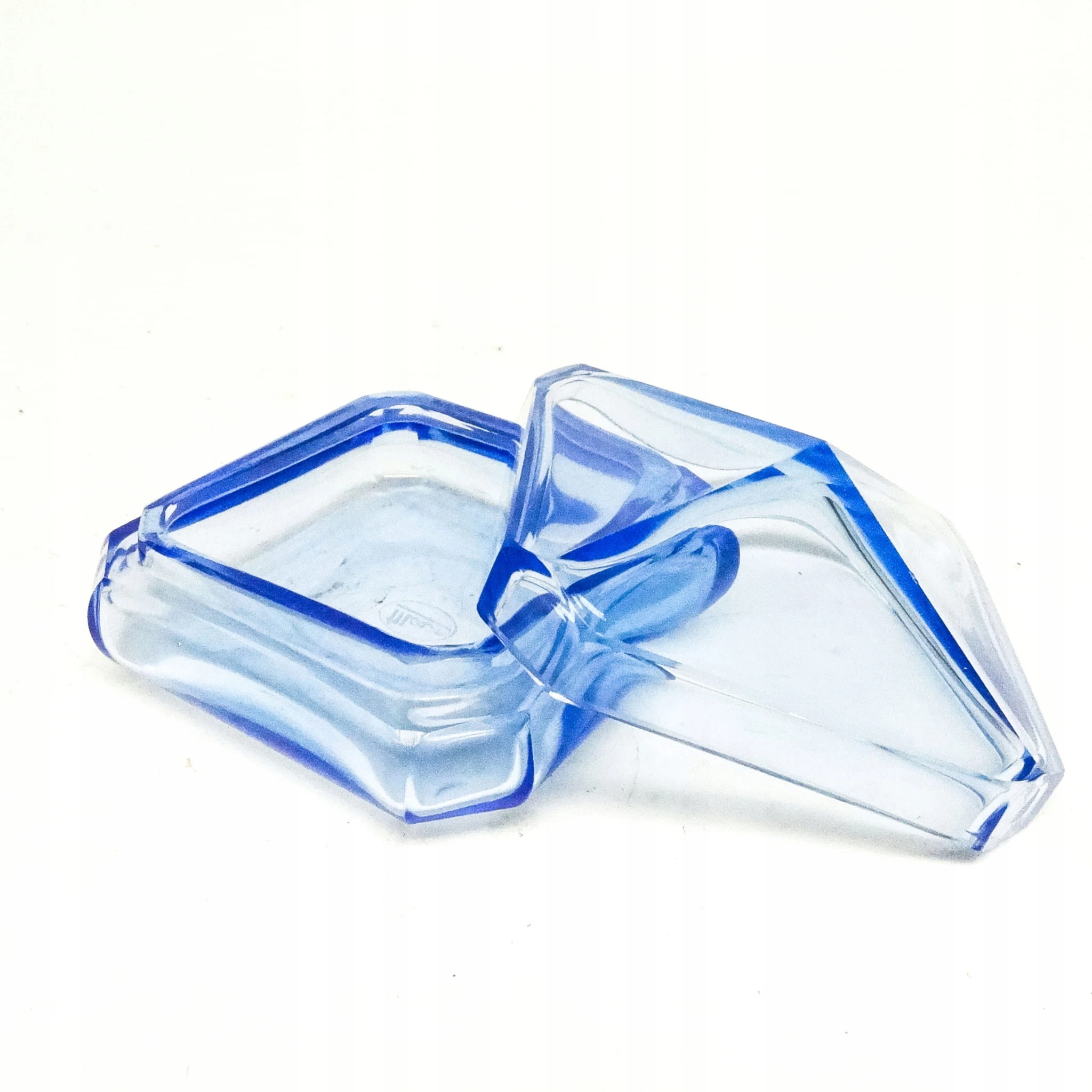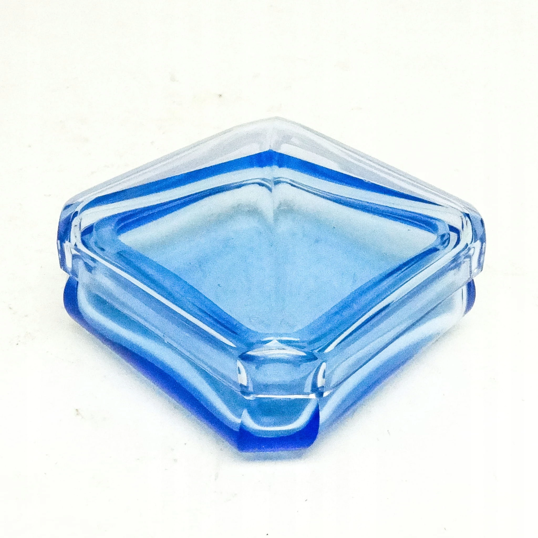 Przybornik na pierścionki wyprodukowany został w Czechosłowacji w mieście Karlove Vary w latach 30. przez wytwórnię Moser. Wykonany jest z fasetowanego szkła. Stan dobry.