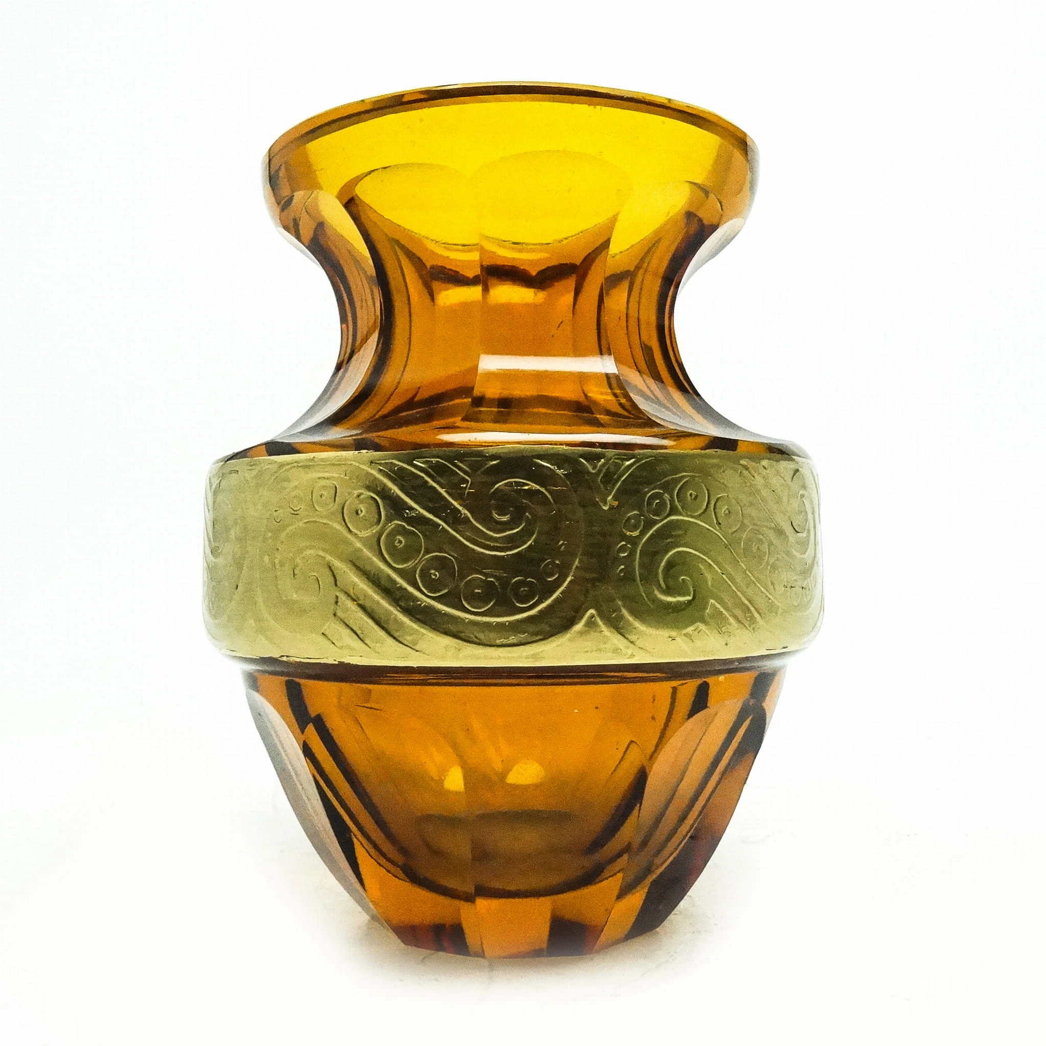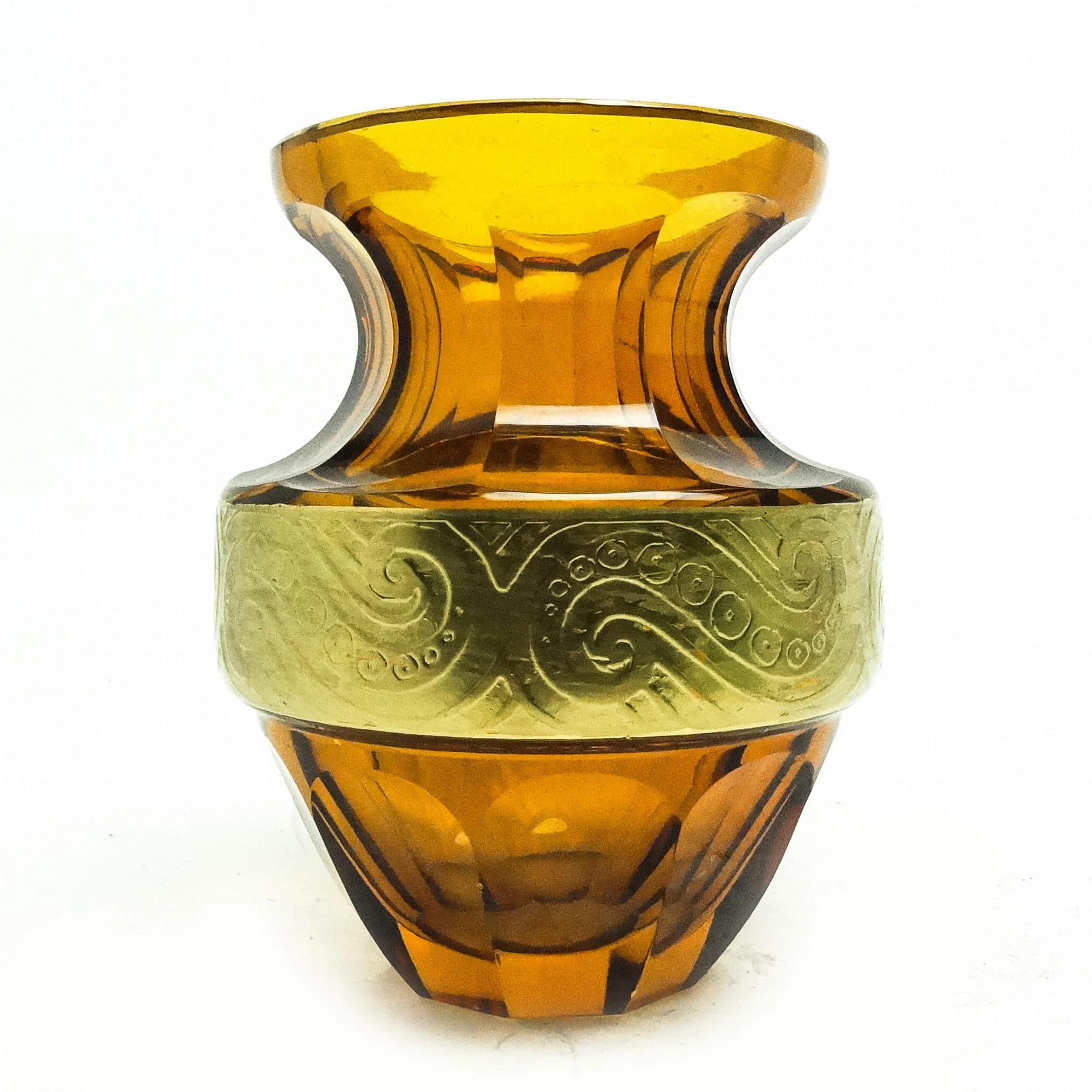 Wazon wyprodukowany został w Czechosłowacji w mieście Karlove Vary w latach 30. przez wytwórnie Moser. Wykonany jest z fasetowanego szkła i zdobiony metodą oroplastyki. Zachowany jest w bardzo dobrym stanie. Przedmiot jest sygnowany.