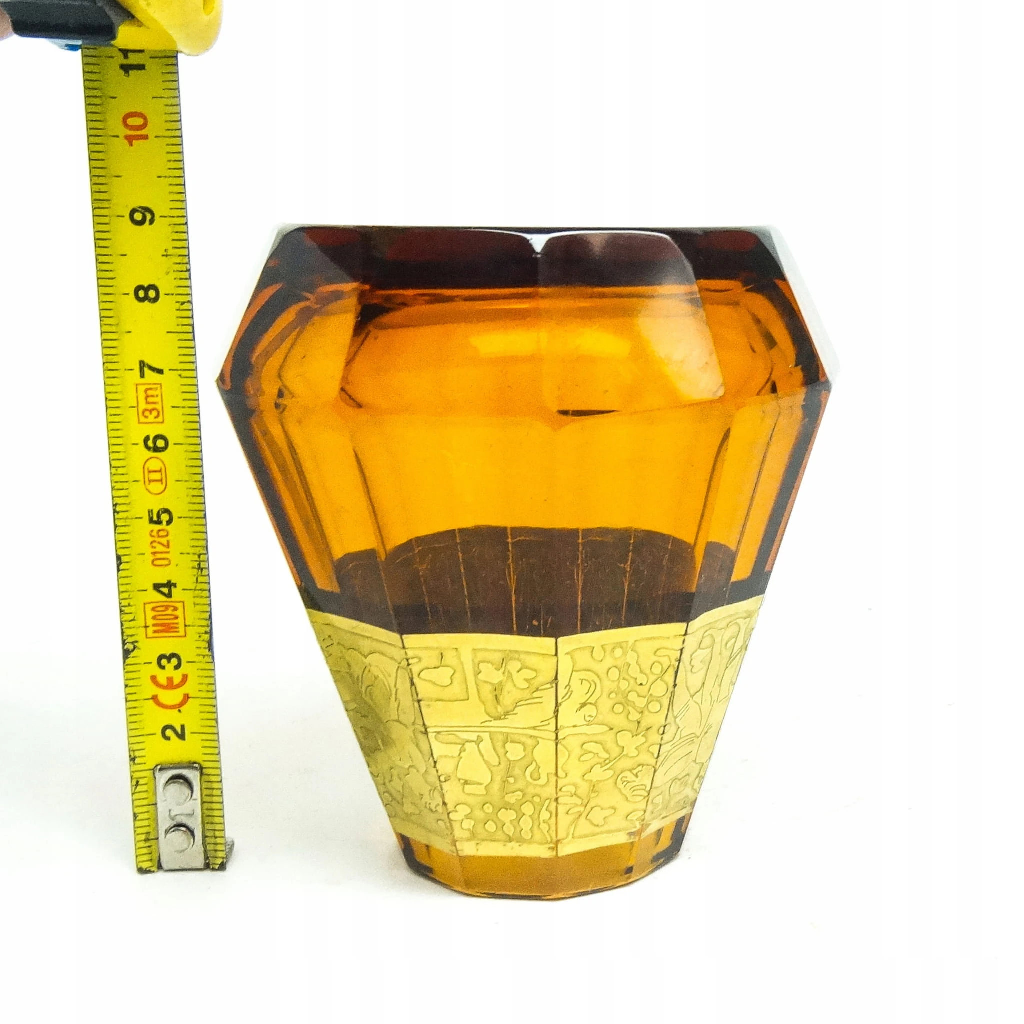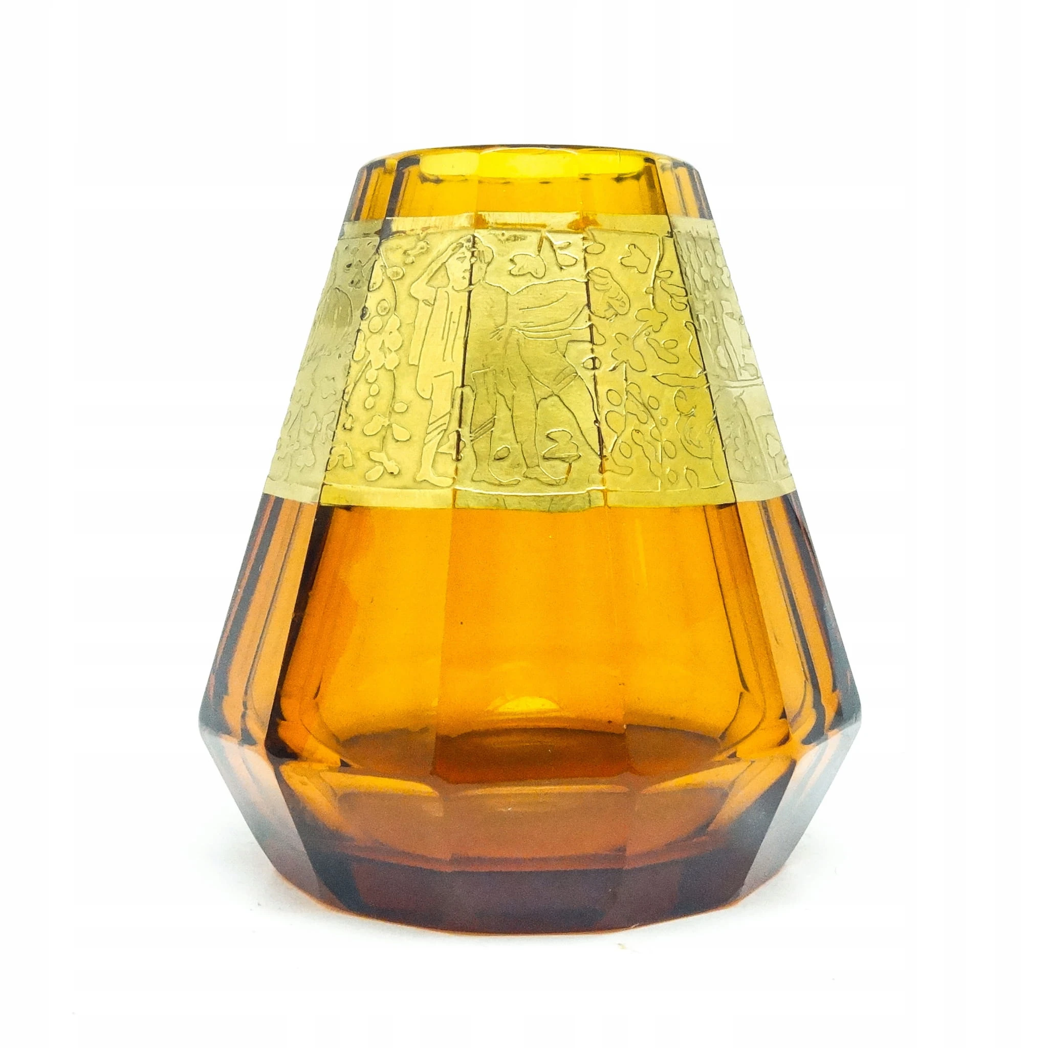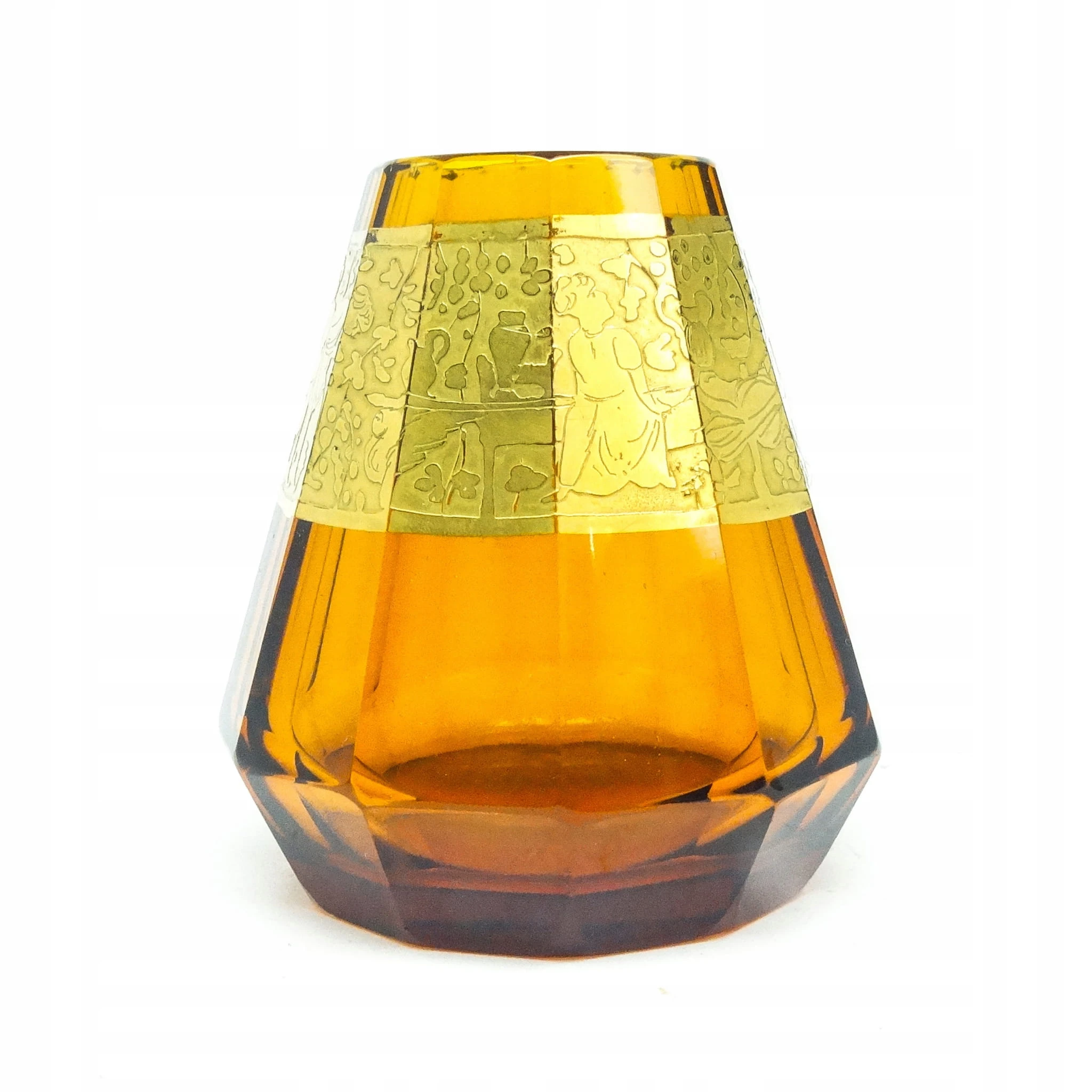Wazon wyprodukowany został w Czechosłowacji w mieście Karlove Vary w latach 30. przez wytwórnie Moser. Wykonany jest z fasetowanego szkła i zdobiony metodą oroplastyki. Zachowany jest w bardzo dobrym stanie. Przedmiot jest sygnowany.