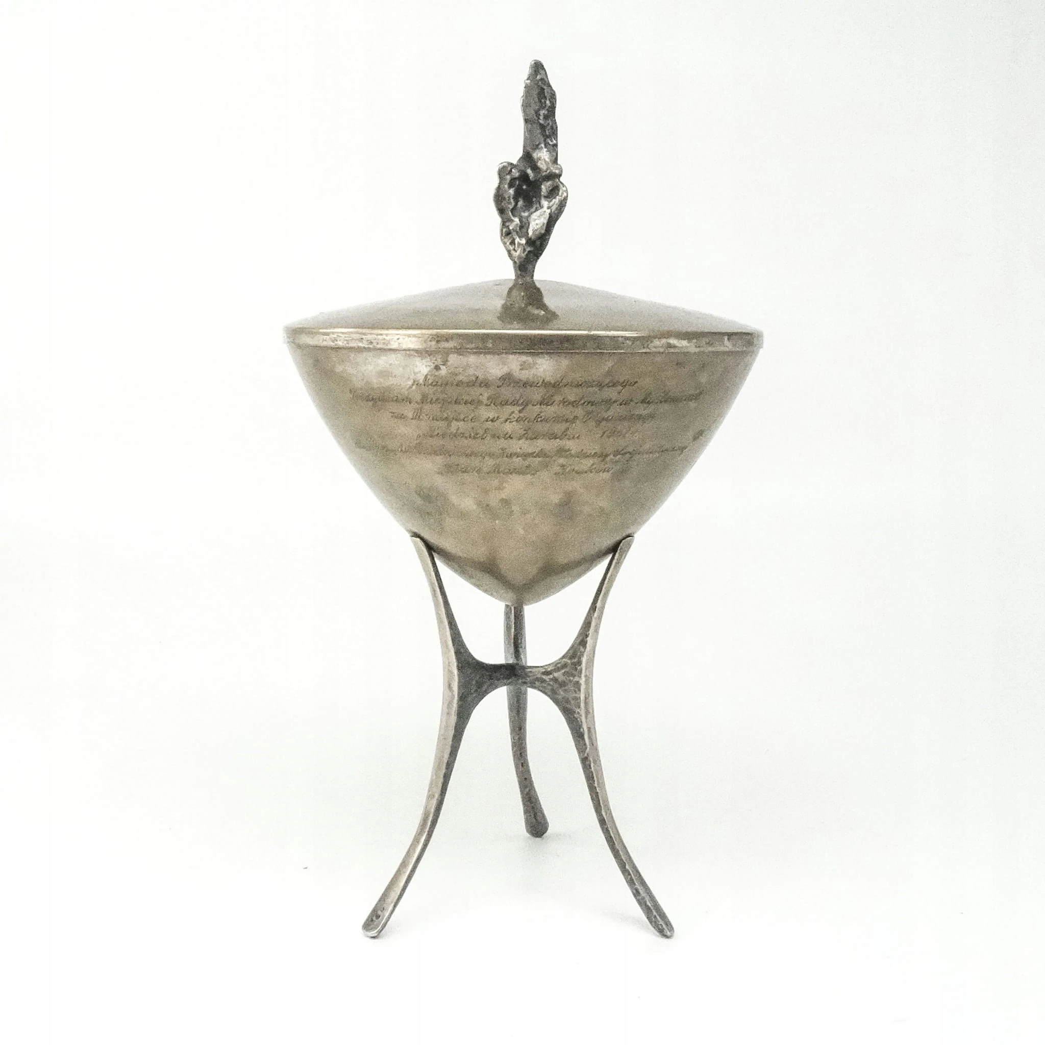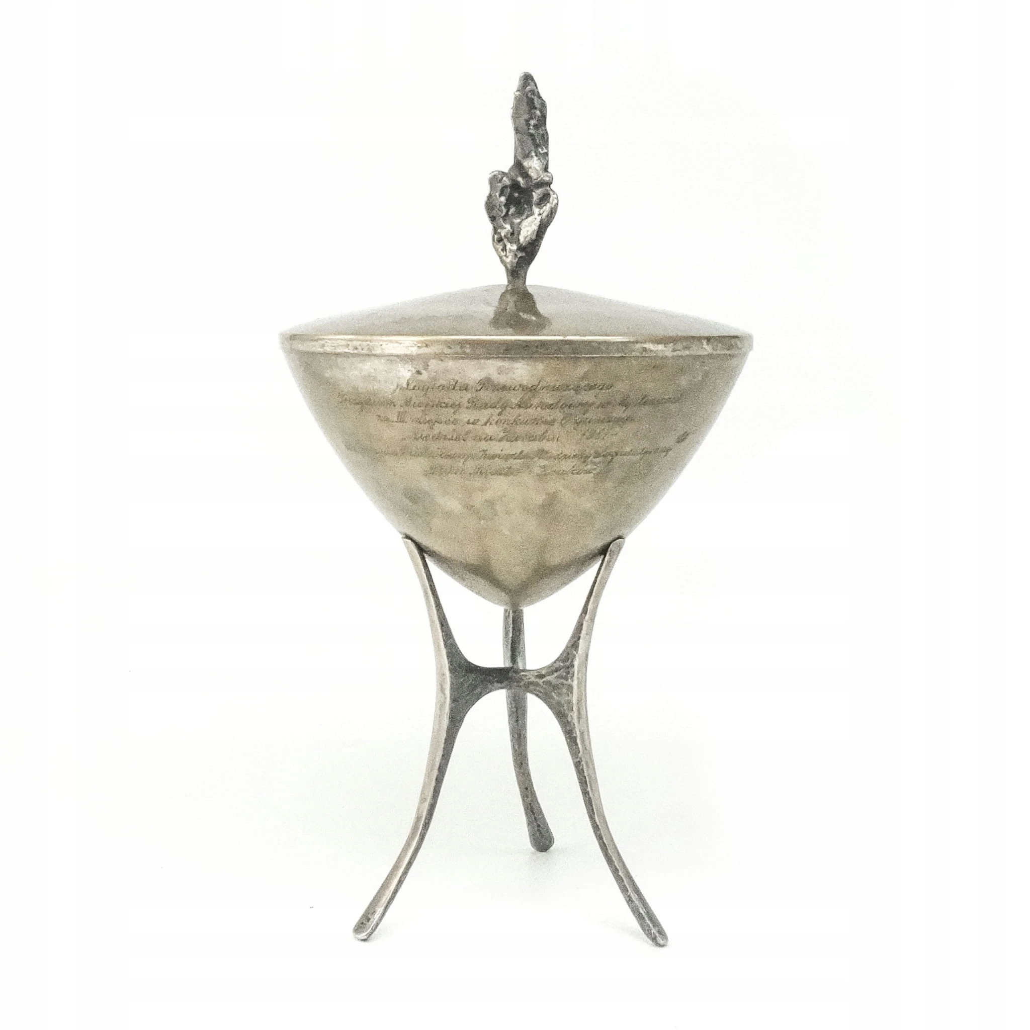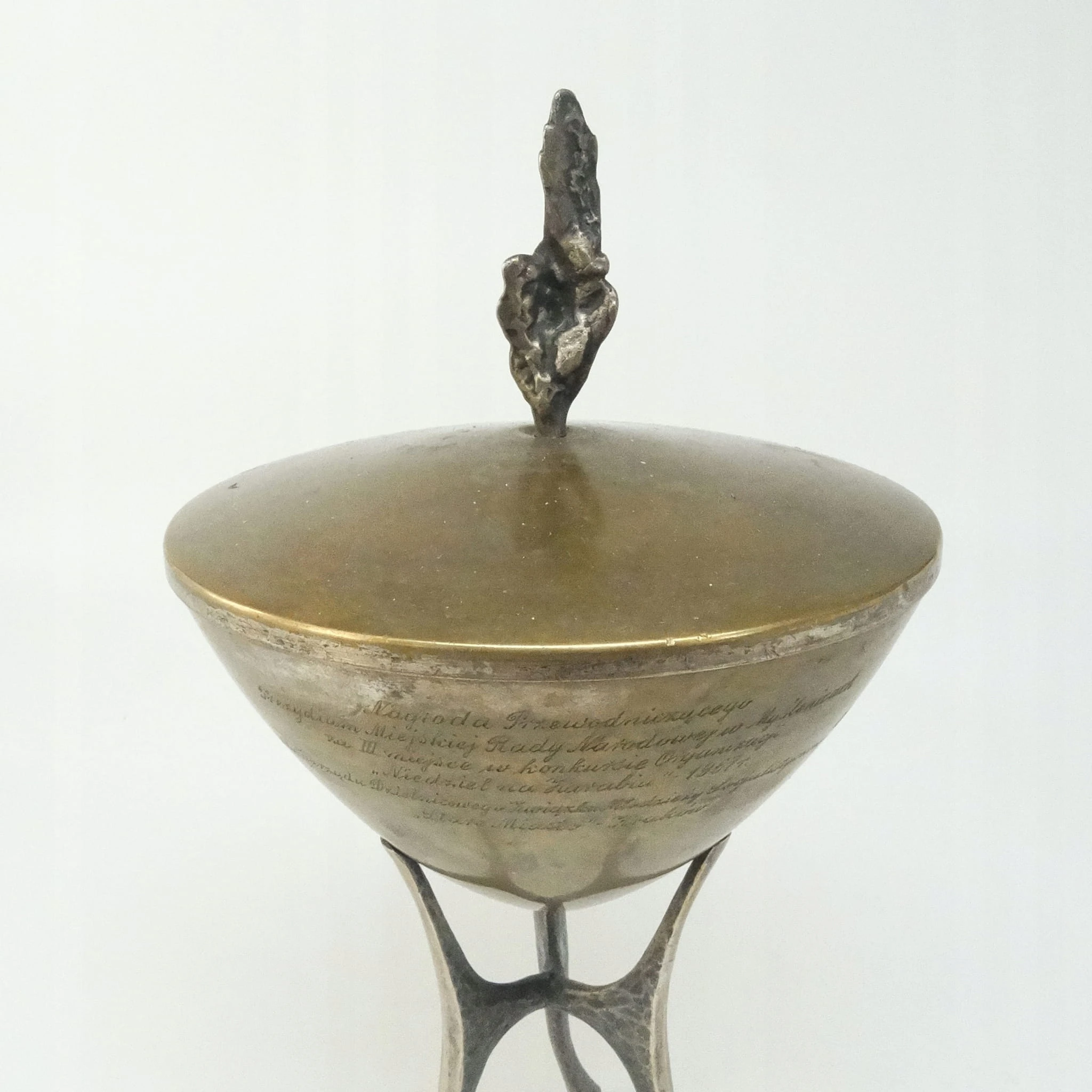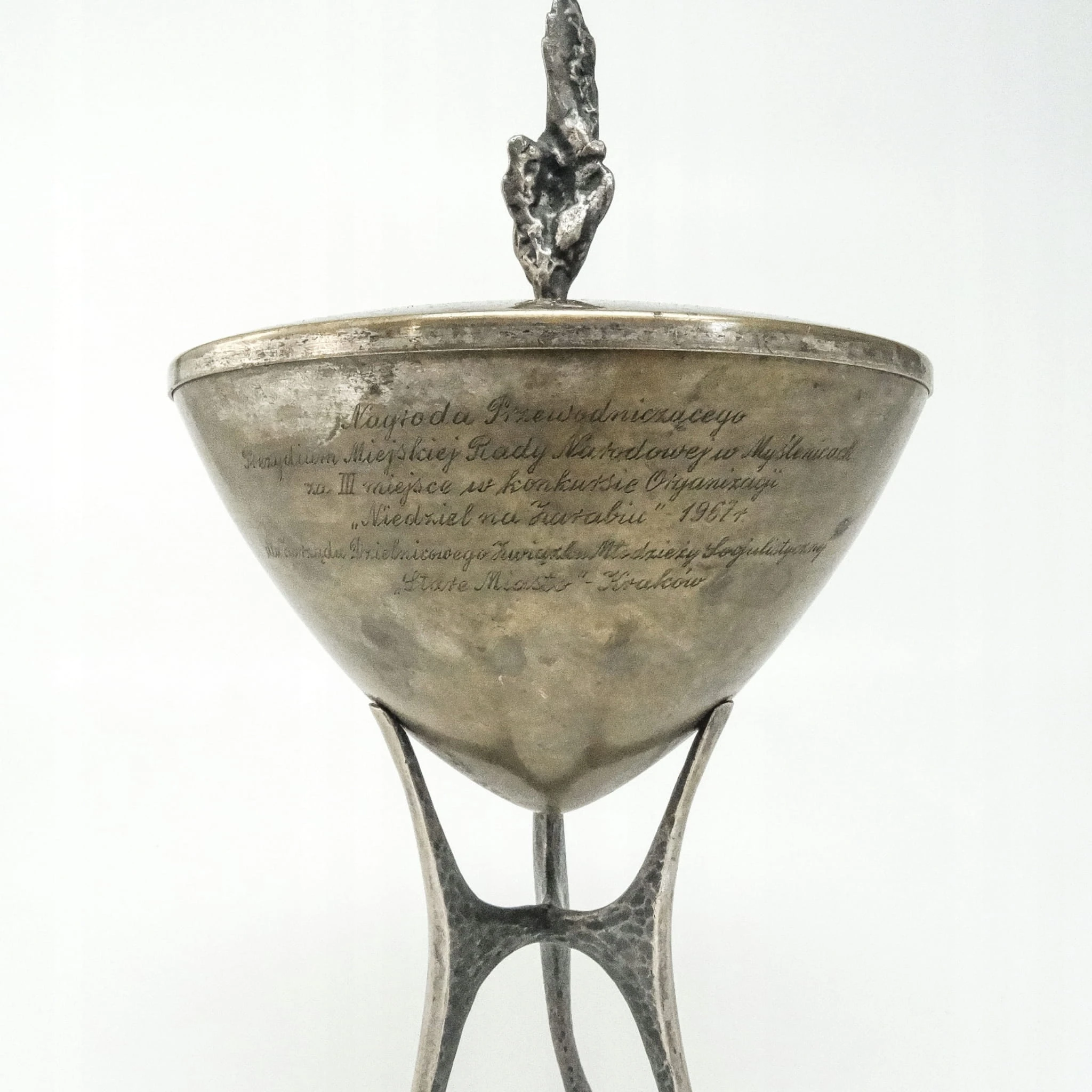 Puchar kształtem przypominający bombonierę na wysokich stopach wyprodukowany w Krakowie (najprawdopodobniej przez wytwórnię Imago Artis) w latach 60. Wykonany został z mosiądzu, platerowany. Stan dobry z widoczną patyną na elementach mosiężnych. Oznaczony jako: "Nagroda Przewodniczącego Prezydium Miejskiej Rady Narodowej w Myślenicach za III miejsce w konkursie Organizacji "Niedziel na Zarabiu" - 1967 r. dla Zarządu Dzielnicowego Związku Młodzieży Socjalistycznej "Stare Miasto" - Krakow". Zarabie stanowiło w latach 60. XX wieku luksusową dzielnicę rekreacyjną Myślenic, gdzie organizowano spotkania tematyczne oraz konkursy tematyczne dla młodzieży i dorosłych.
