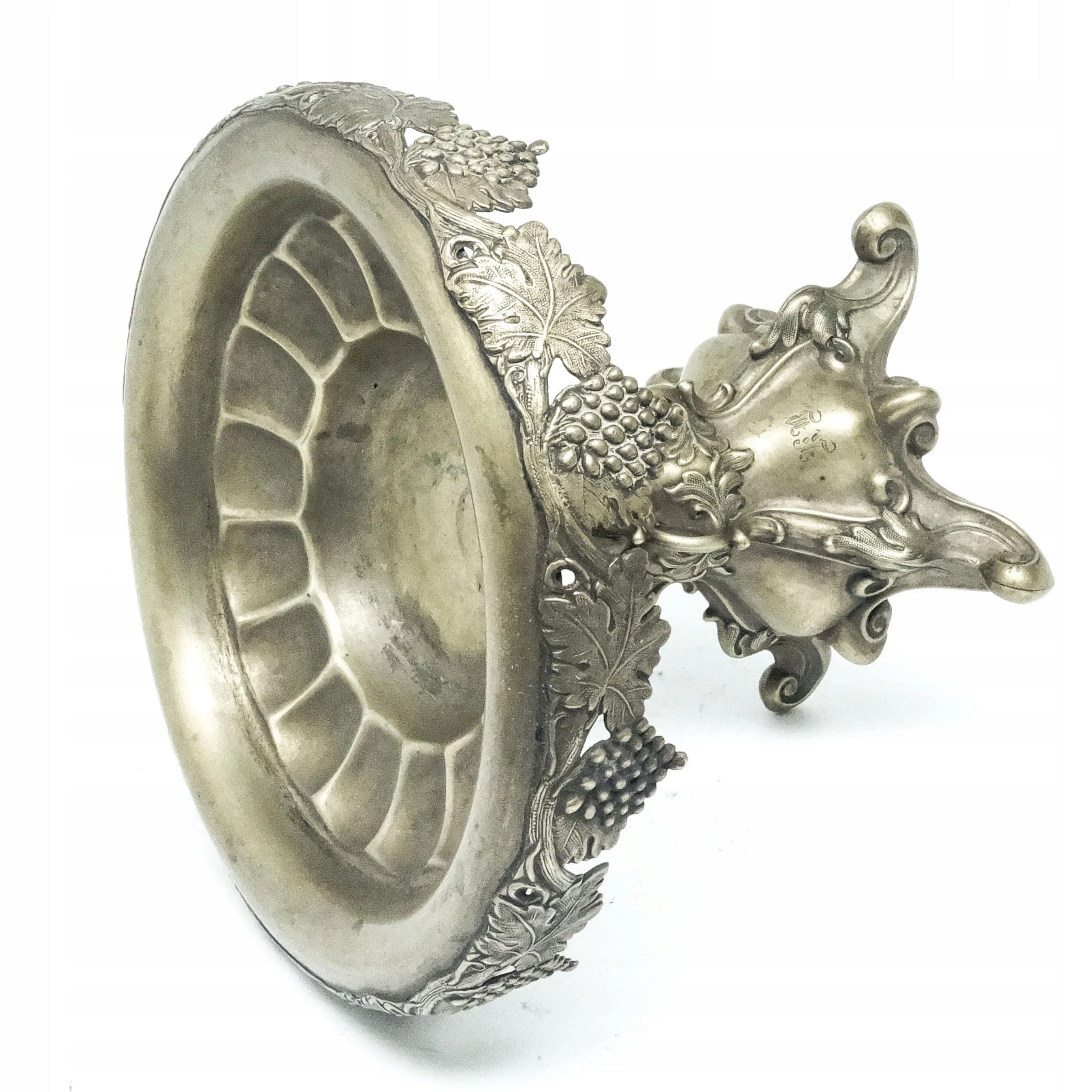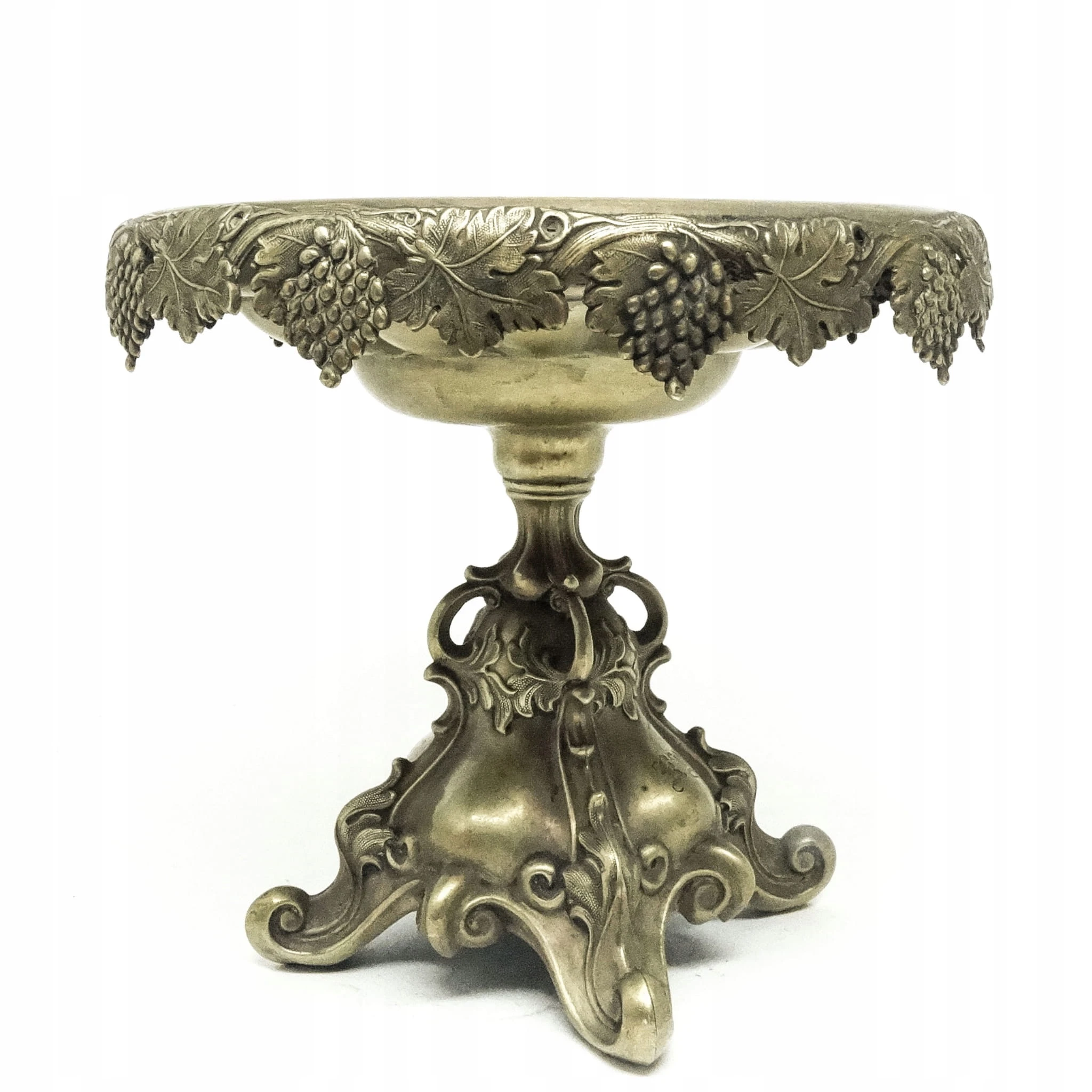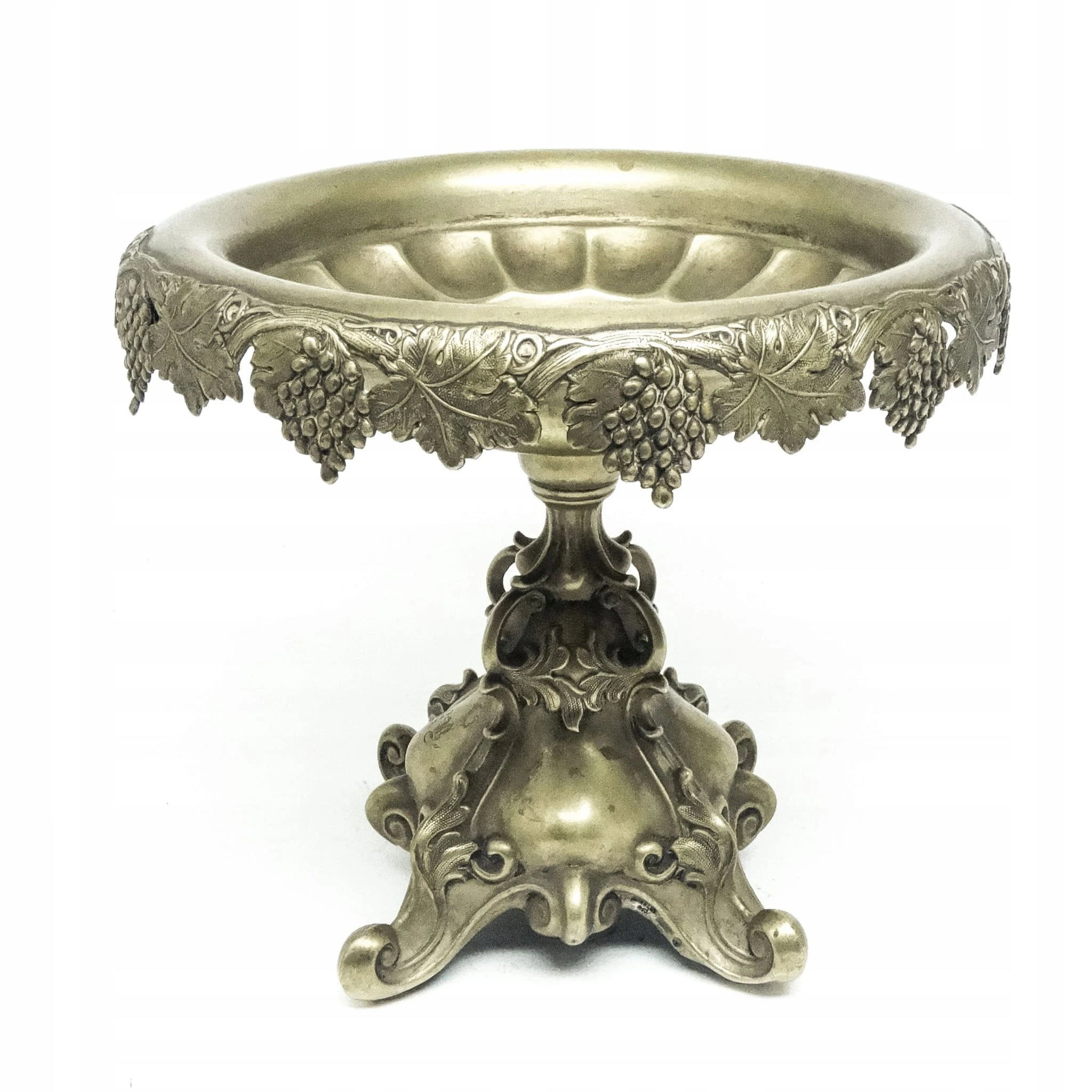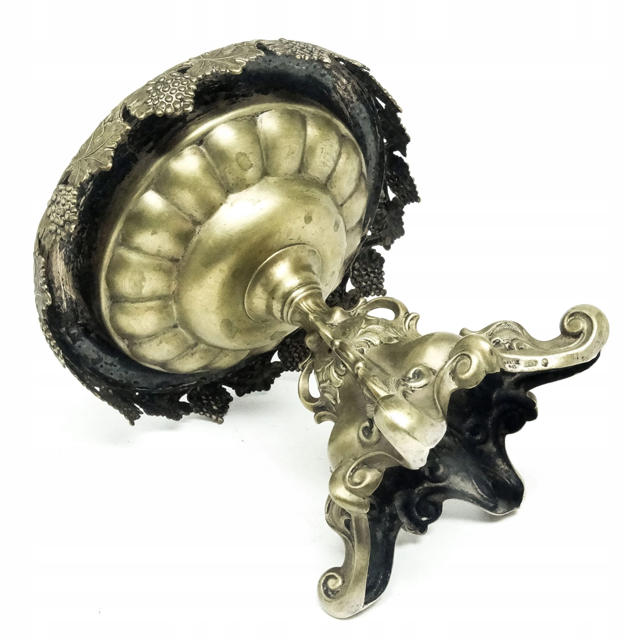 Patera eklektyczna wyprodukowana została w Polsce przez wytwórnię Norblin między 1870-1890. Wykonana jest z w stylu eklektycznym. Sygnowana. Zachowana jest w dobrym stanie. Monogram K(?) B na jednym z brzuśców na stopie. Platerowanie niemal całkowicie usunięte, ślady srebrzenia w rowkach i pod spodem talerza patery.