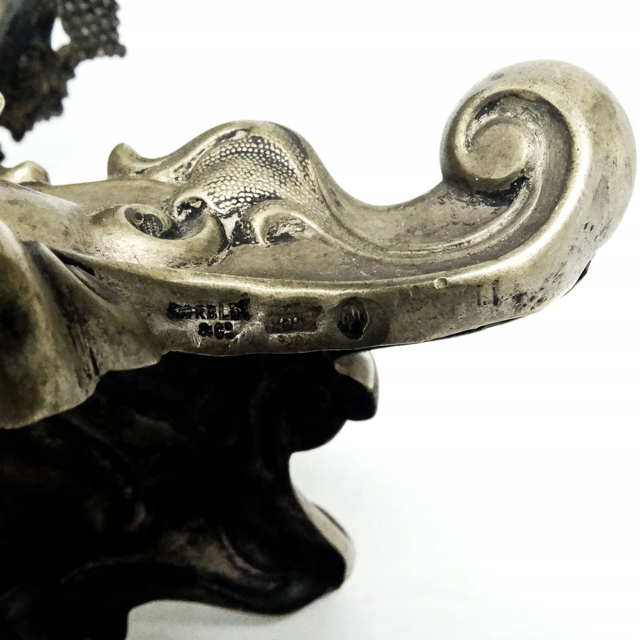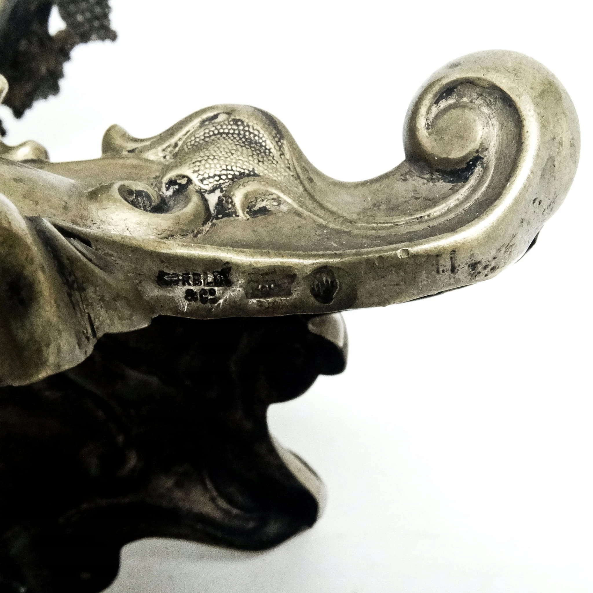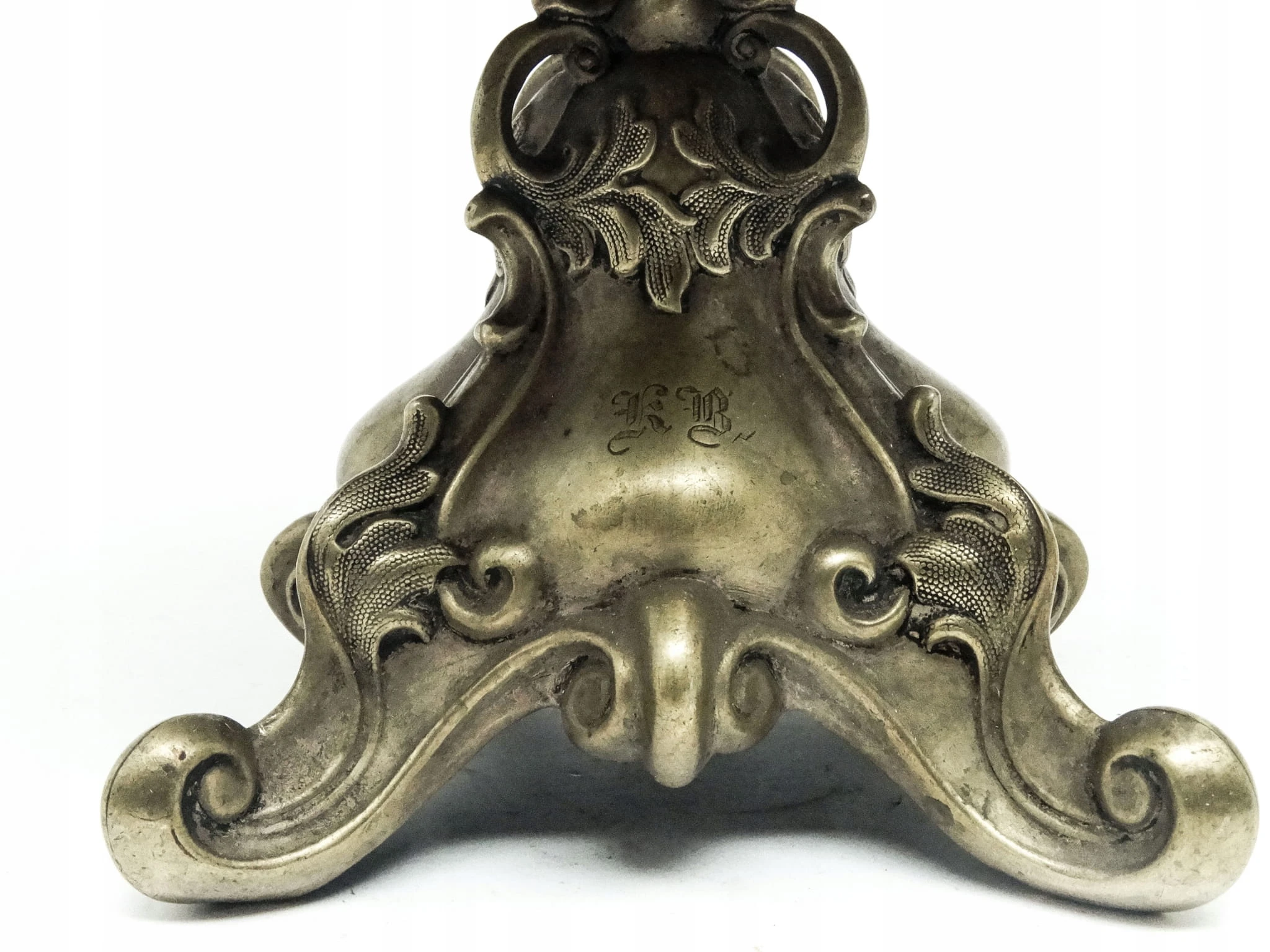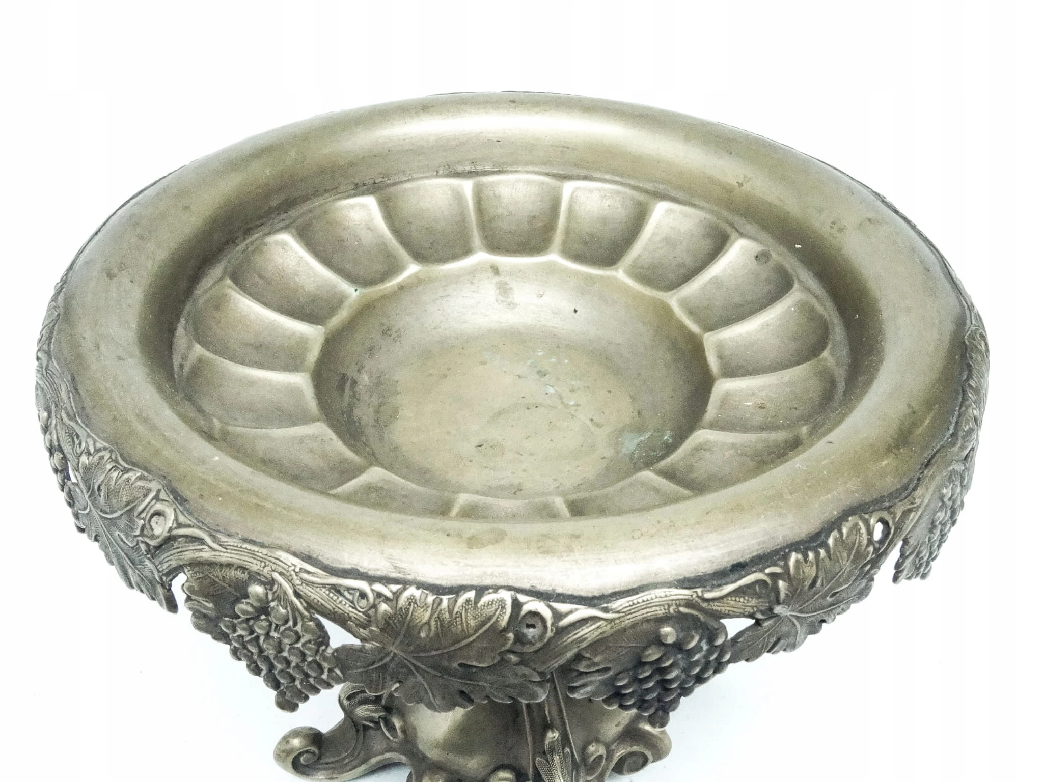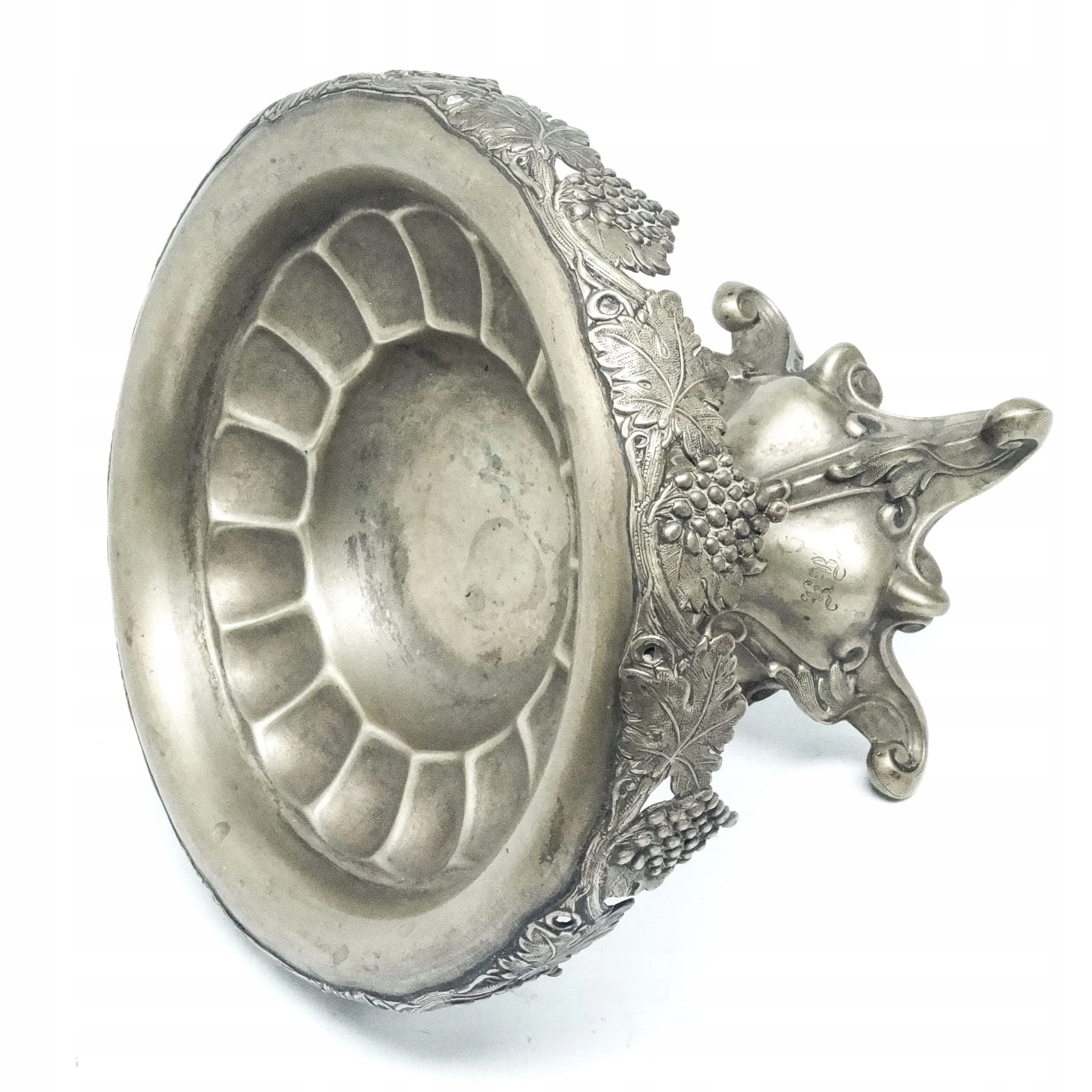 Patera eklektyczna wyprodukowana została w Polsce przez wytwórnię Norblin między 1870-1890. Wykonana jest z w stylu eklektycznym. Sygnowana. Zachowana jest w dobrym stanie. Monogram K(?) B na jednym z brzuśców na stopie. Platerowanie niemal całkowicie usunięte, ślady srebrzenia w rowkach i pod spodem talerza patery.