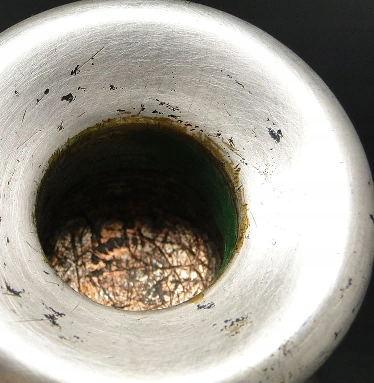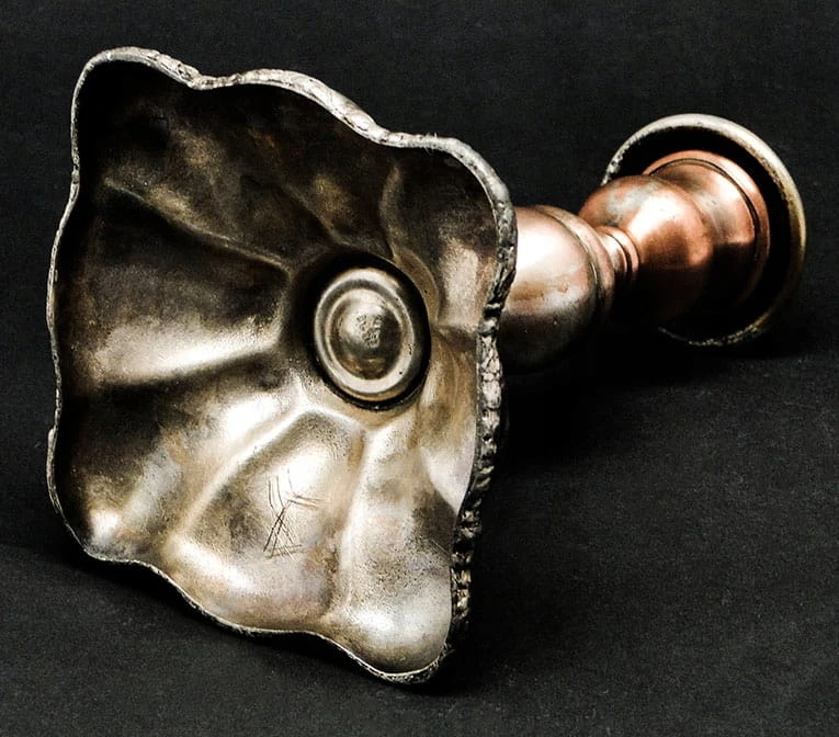 Posiada sygnaturę, która pomimo że mocno przetarta znajduje się pojemniku na świecę.