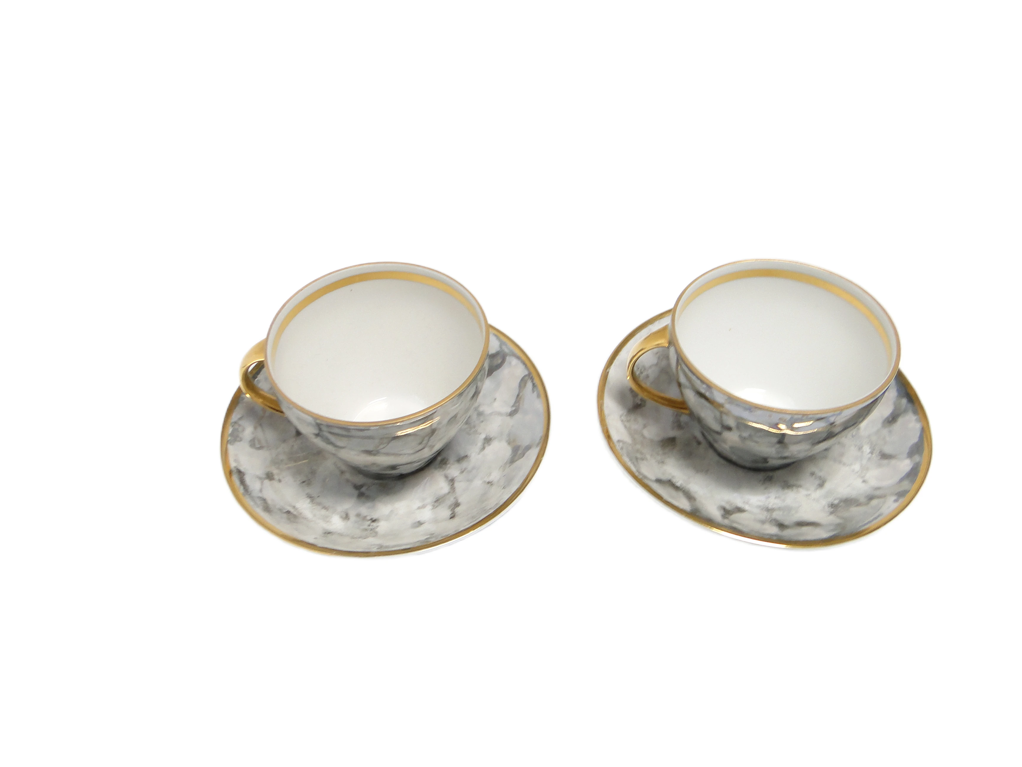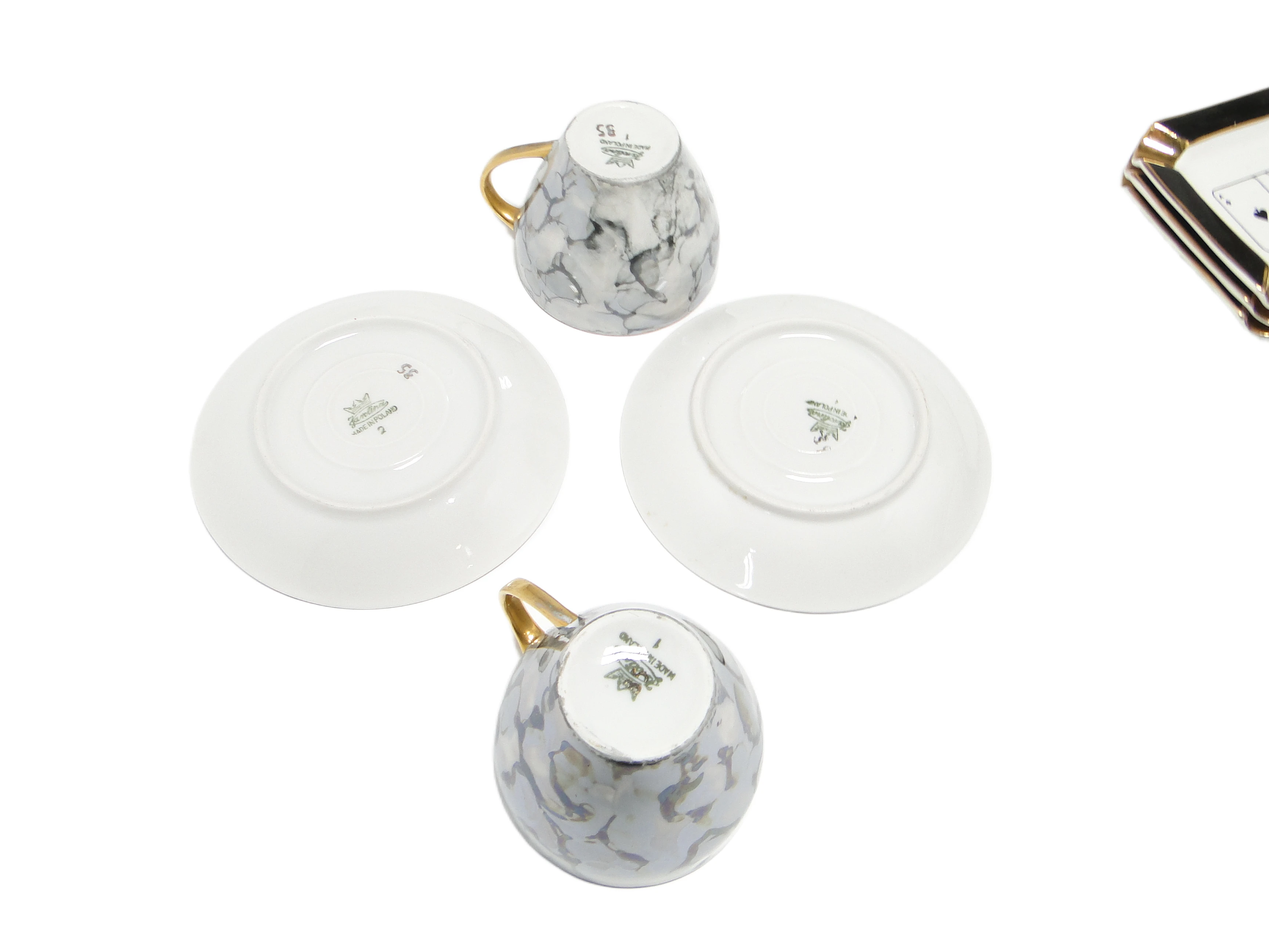 Para filiżanek ze spodkami z serii „Joanna”, wyprodukowana przez wytwórnię Wawel w Polsce w latach 70., to przykład porcelany użytkowej wpisującej się w nurt mid-century modern. Każdy element wykonano z cienkiej porcelany o jasnoszarej barwie z nieregularnym marmurkowym wzorem w odcieniach szarości oraz subtelnym błękitem. Ranty filiżanek, spodków oraz smukłe uchwyty podkreślają złocenia o lśniącym, metalicznym wykończeniu. Szkliwiona powierzchnia wzmacnia głębię wzoru i blask złotych akcentów. Klasyczne proporcje – delikatnie rozchylone ścianki filiżanek i szerokie, płytkie spodki – odwołują się do oszczędnej, lecz wyrafinowanej estetyki epoki. Zestaw zachowany w dobrym stanie vintage, z drobnymi śladami użytkowania typowymi dla lat 70.; jedna filiżanka posiada uszkodzenie i została dołączona jako gratis.W tych filiżankach odbija się duch polskich lat 70., czasów codziennej nowoczesności i poszukiwania subtelnych form wyrazu. Marmurkowy deseń przypomina rozmyte akwarele lub fragmenty pochmurnego nieba, a złote detale przywołują dawną tradycję eleganckiego serwowania kawy. Ich forma i wykończenie mówią o kompromisie pomiędzy funkcją a dekoracją – filiżanki te mogłyby opowiadać o porannych audycjach radiowych, popołudniowych spotkaniach i cichych domowych rytuałach, w których porcelana stawała się cichym towarzyszem.W aranżacji filiżanki z serii „Joanna” można zestawić z białą lub jasnoszarą zastawą, minimalistyczną tacą z drewna albo lnianym obrusem, by podkreślić stonowaną kolorystykę porcelany. Dobrze sprawdzą się na stole w salonie w stylu mid-century modern, wśród innych naczyń epoki lub jako subtelny akcent w nowoczesnym, neutralnym wnętrzu. Można połączyć je z ceramiką w grafitowym odcieniu lub szklanymi naczyniami, aby wydobyć chłodne tonacje marmurkowego wzoru i dodać ciepła poprzez naturalne materiały.