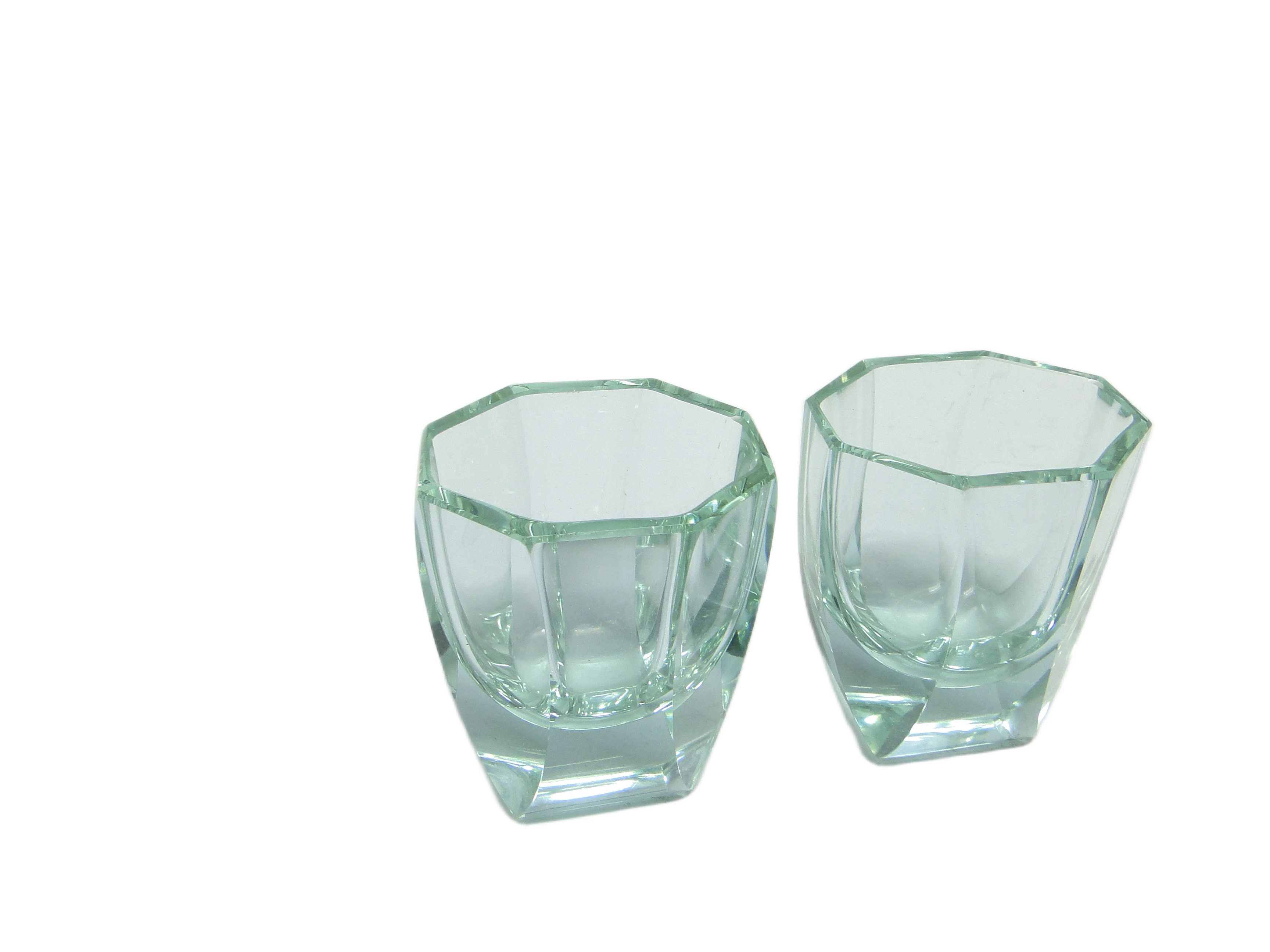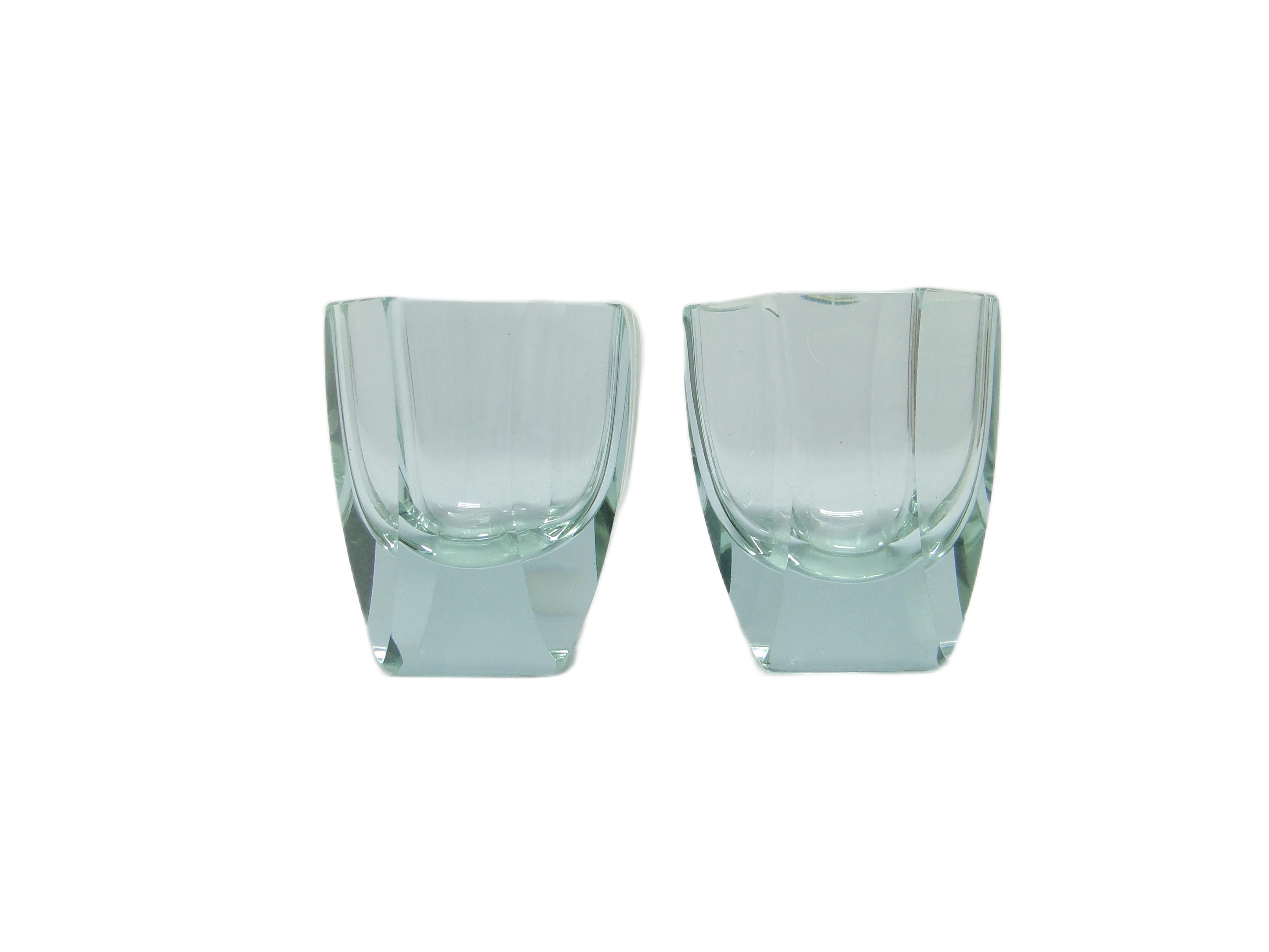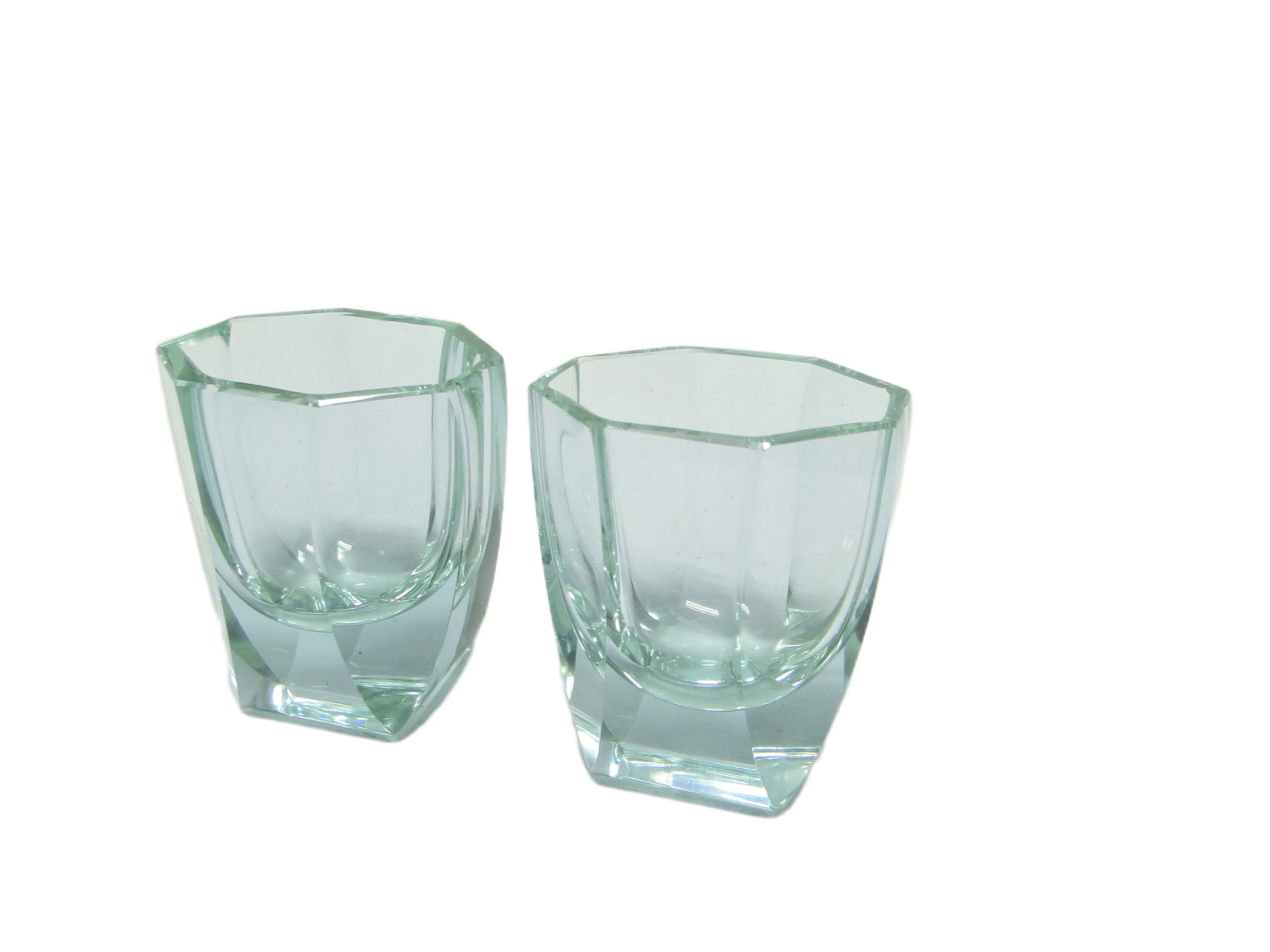 Para kieliszków z lat 30. XX wieku wykonana została w Czechosłowacji ze szkła aleksandretowego o chłodnym, jasnoturkusowym odcieniu z subtelną zielonkawo-niebieską nutą. Grube ścianki podkreślają solidność rzemiosła, a wyważona forma łączy masywną, kwadratową podstawę z zaokrągloną, lekko rozchyloną krawędzią. Fasetowane boki i ostre, czyste linie wpisują kieliszki w estetykę Art Deco, a wypolerowana, błyszcząca powierzchnia eksponuje przejrzystość i światłocień szkła. Szkło pozostaje gładkie, ciężkie w dłoni, z widocznymi śladami użytkowania: drobnymi rysami powierzchniowymi i niewielkimi wyszczerbieniami na krawędziach. Brak śladów renowacji, zachowana oryginalna patyna oraz wszystkie elementy, stan określony jako wysłużony, lecz autentyczny.W tych kieliszkach pobrzmiewa ton epoki, która celebruje harmonię formy i funkcji. Art Deco, z jego upodobaniem do symetrii i wyrazistego blasku materiału, odnajduje tu dyskretny wyraz – szkło odbija światło, jakby każdy toast miał być celebracją codzienności. Chłodny turkus przenosi myśl do salonów i kawiarni lat 30., gdzie ciężar szkła i geometryczna linia były równie ważne, jak przyjemność spotkania. Każda niewielka rysa czy wyszczerbienie niesie historię minionych dekad, przypominając o kruchości i trwałości przedmiotów służących przez pokolenia.Kieliszki można wykorzystać jako wyrazisty akcent w kolekcjonerskim kredensie lub na barku w salonie inspirowanym modernizmem bądź stylem Art Deco. Dobrze sprawdzą się w zestawieniu z lustrzanymi tacami, chromowanymi detalami czy grafikami o geometrycznych motywach. Warto połączyć je z ciemnym drewnem, marmurem lub szkłem w innych odcieniach, by podkreślić głębię koloru i połysk, a w minimalistycznej aranżacji wydobędą swoją wyrazistą linię i historyczny charakter.