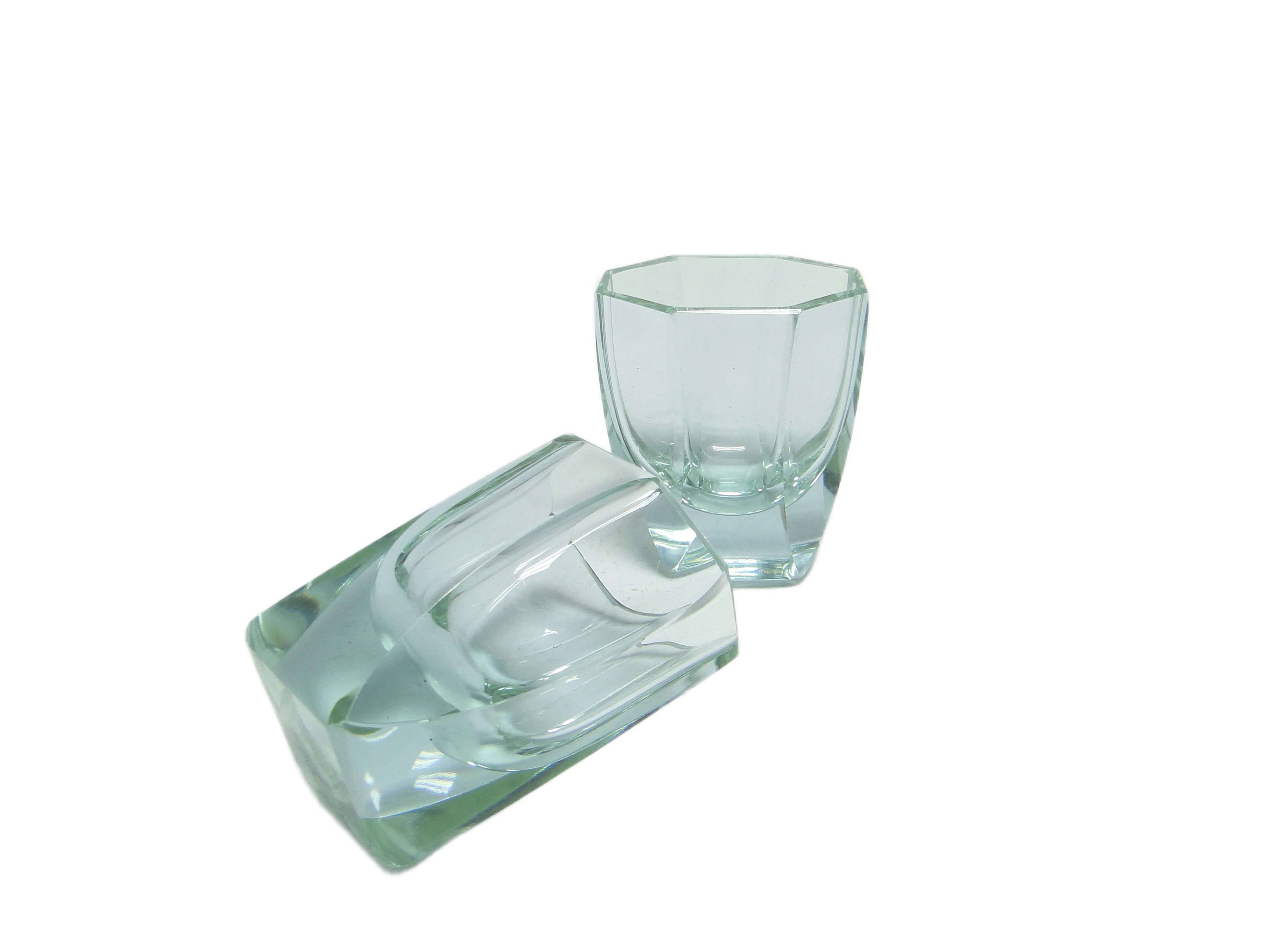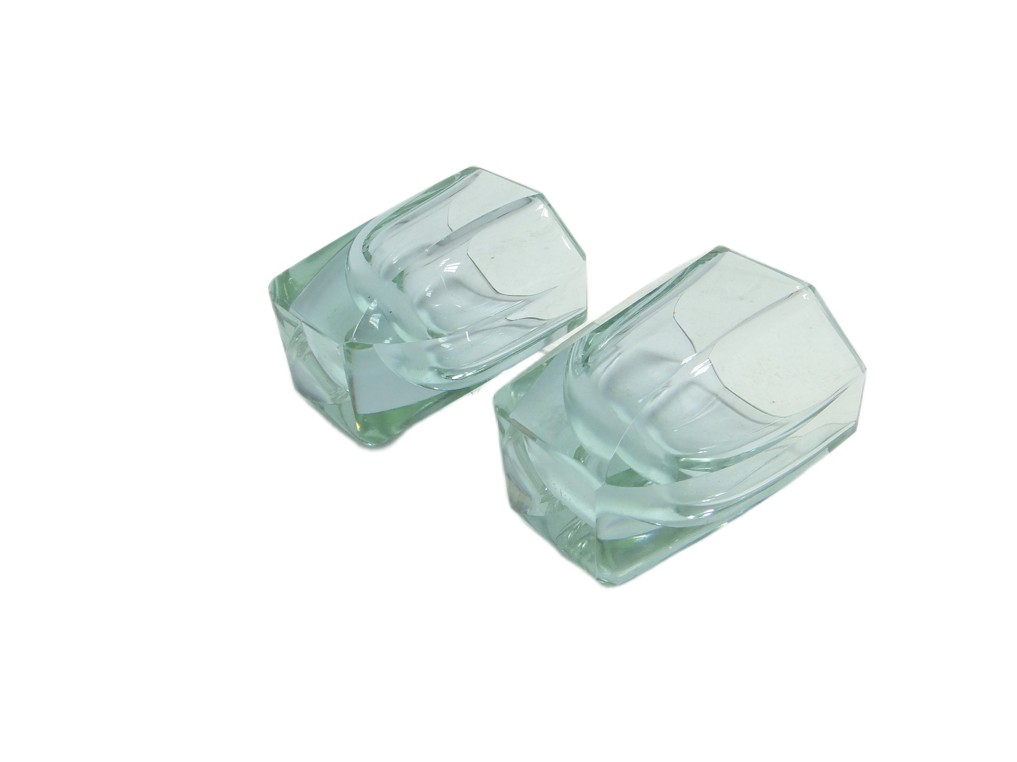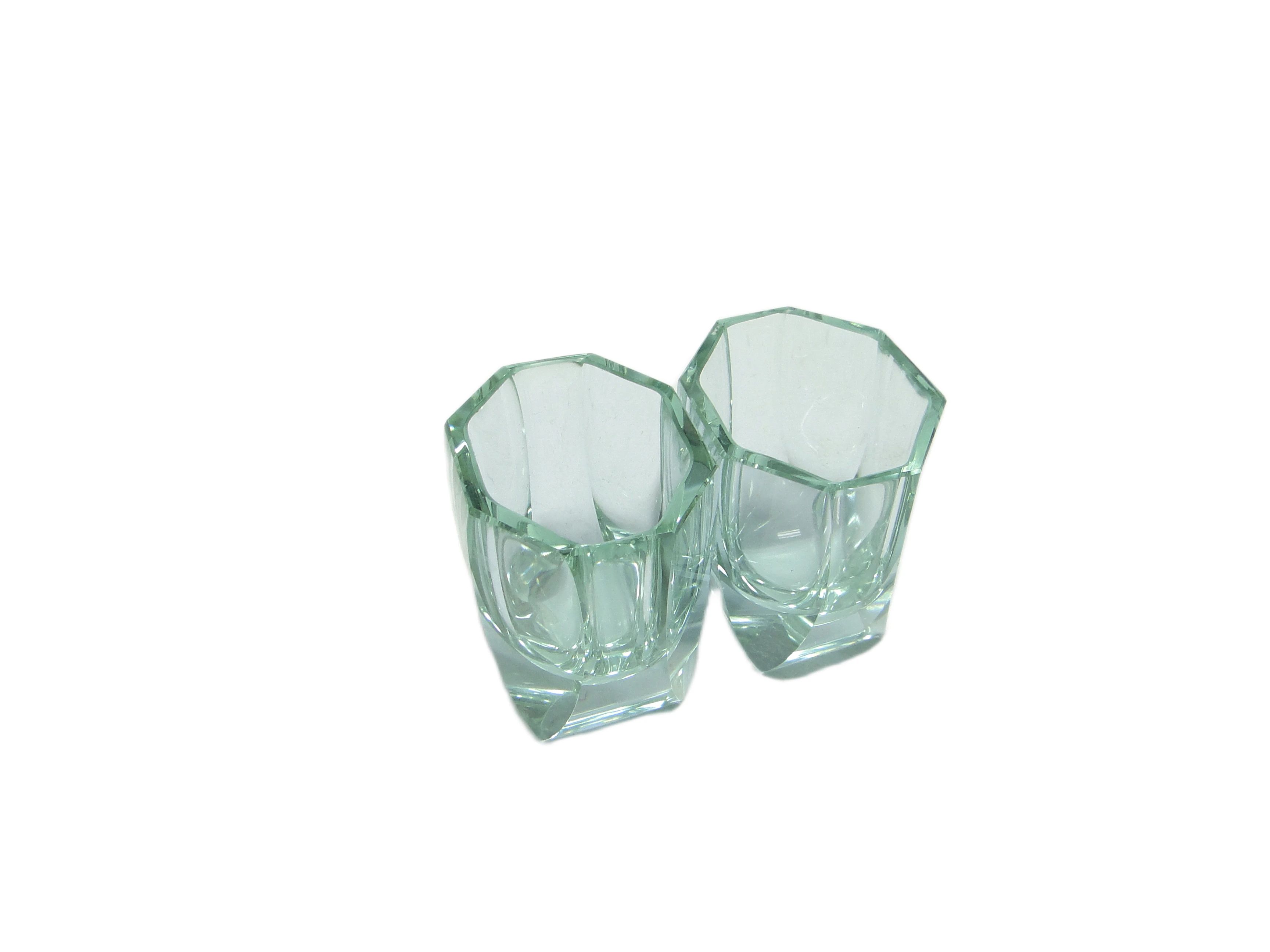 Para kieliszków z lat 30. XX wieku wykonana została w Czechosłowacji ze szkła aleksandretowego o chłodnym, jasnoturkusowym odcieniu z subtelną zielonkawo-niebieską nutą. Grube ścianki podkreślają solidność rzemiosła, a wyważona forma łączy masywną, kwadratową podstawę z zaokrągloną, lekko rozchyloną krawędzią. Fasetowane boki i ostre, czyste linie wpisują kieliszki w estetykę Art Deco, a wypolerowana, błyszcząca powierzchnia eksponuje przejrzystość i światłocień szkła. Szkło pozostaje gładkie, ciężkie w dłoni, z widocznymi śladami użytkowania: drobnymi rysami powierzchniowymi i niewielkimi wyszczerbieniami na krawędziach. Brak śladów renowacji, zachowana oryginalna patyna oraz wszystkie elementy, stan określony jako wysłużony, lecz autentyczny.W tych kieliszkach pobrzmiewa ton epoki, która celebruje harmonię formy i funkcji. Art Deco, z jego upodobaniem do symetrii i wyrazistego blasku materiału, odnajduje tu dyskretny wyraz – szkło odbija światło, jakby każdy toast miał być celebracją codzienności. Chłodny turkus przenosi myśl do salonów i kawiarni lat 30., gdzie ciężar szkła i geometryczna linia były równie ważne, jak przyjemność spotkania. Każda niewielka rysa czy wyszczerbienie niesie historię minionych dekad, przypominając o kruchości i trwałości przedmiotów służących przez pokolenia.Kieliszki można wykorzystać jako wyrazisty akcent w kolekcjonerskim kredensie lub na barku w salonie inspirowanym modernizmem bądź stylem Art Deco. Dobrze sprawdzą się w zestawieniu z lustrzanymi tacami, chromowanymi detalami czy grafikami o geometrycznych motywach. Warto połączyć je z ciemnym drewnem, marmurem lub szkłem w innych odcieniach, by podkreślić głębię koloru i połysk, a w minimalistycznej aranżacji wydobędą swoją wyrazistą linię i historyczny charakter.