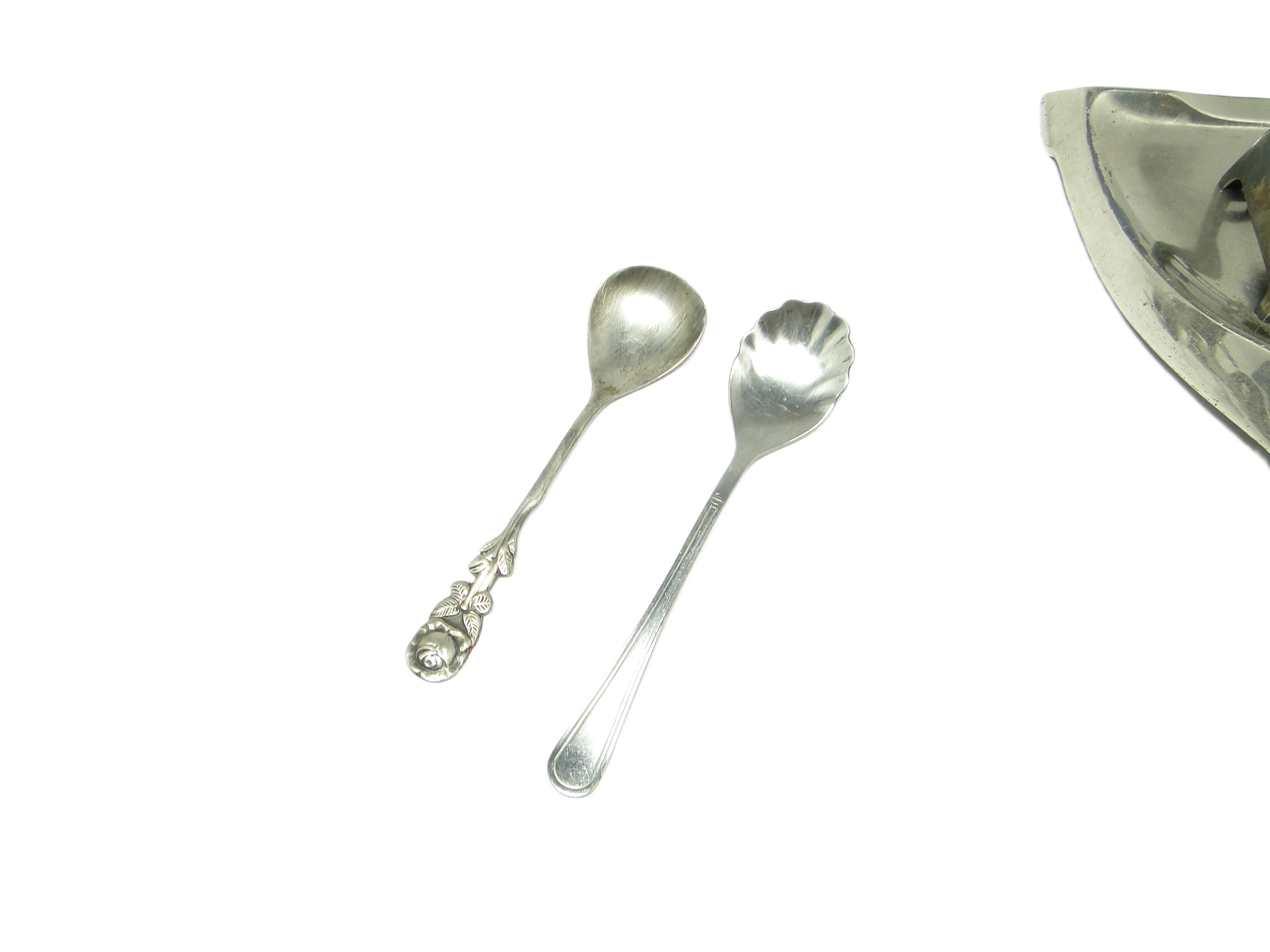 Para polskich łyżek do herbaty z lat 60. to zestaw, który łączy dwa różne podejścia do wzornictwa charakterystyczne dla tej epoki. Wykonane z mosiądzu srebrzonego, zachowały matową, srebrzystą powierzchnię – jedna z łyżek przyciąga wzrok wypukłym motywem róży na trzonku i nabierką w kształcie serca, druga prezentuje minimalistyczną formę z gładkim, smukłym trzonkiem i nabierką przypominającą muszlę. Obie cechuje wyraźna dbałość o detal: precyzyjne krawędzie, starannie opracowane zdobienia oraz subtelny, satynowy połysk powierzchni. Srebrzysty kolor oraz zróżnicowane faktury odzwierciedlają eklektyczne tendencje użytkowego designu polskich lat 60. W dłoni wyczuwalny jest niewielki, solidny ciężar, charakterystyczny dla przedmiotów wykonanych z metalu. Stan zachowania bardzo dobry: widoczne są jedynie drobne ślady użytkowania i delikatna patyna, bez uszkodzeń czy napraw.Obie łyżki opowiadają własną historię: ta z motywem róży i sercowatą nabierką przywołuje klimat romantycznych popołudniowych spotkań przy herbacie, kiedy to detal serwisu miał znaczenie niemal rytualne. Jej minimalistyczna towarzyszka mówi o powściągliwości i funkcjonalności, które zyskiwały popularność obok bardziej ozdobnych form. Razem tworzą dialog epoki, w którym ornament spotyka się z prostotą, a codzienny rytuał picia herbaty nabiera odświętnego charakteru.Zestaw tych łyżek można połączyć z porcelaną o stonowanych barwach lub filiżankami z geometrycznym wzorem z lat 60., by podkreślić ich kolekcjonerski wymiar. Dobrze sprawdzą się na klasycznej tacy z drewna lub metalu, w towarzystwie cukierniczki czy mlecznika o podobnej stylistyce. W eklektycznym wnętrzu warto zestawić je z innymi vintage’owymi dodatkami, takimi jak szklane patery czy tekstylia o wyrazistym wzorze, by wydobyć ich sentymentalny, a zarazem ponadczasowy charakter.