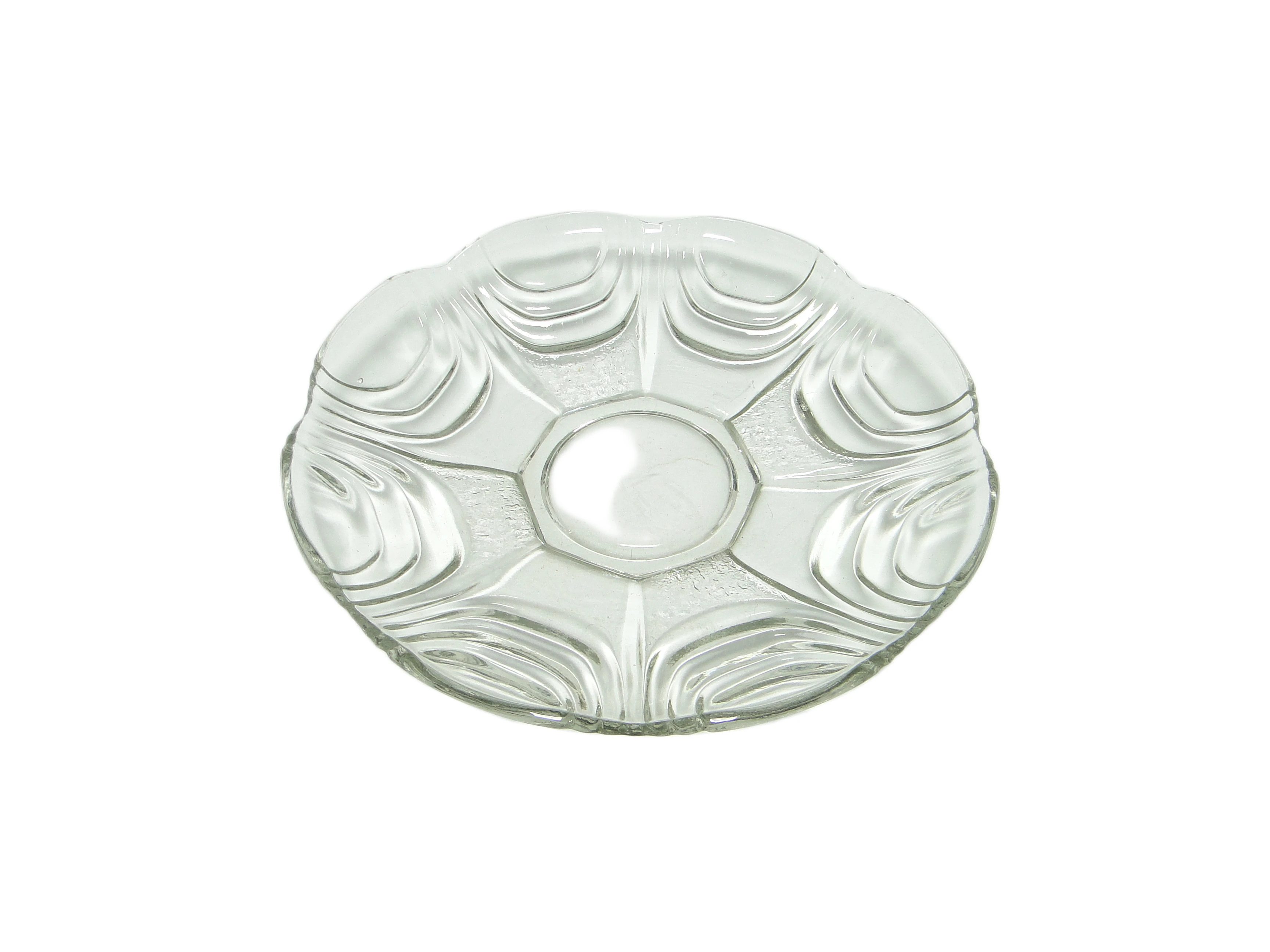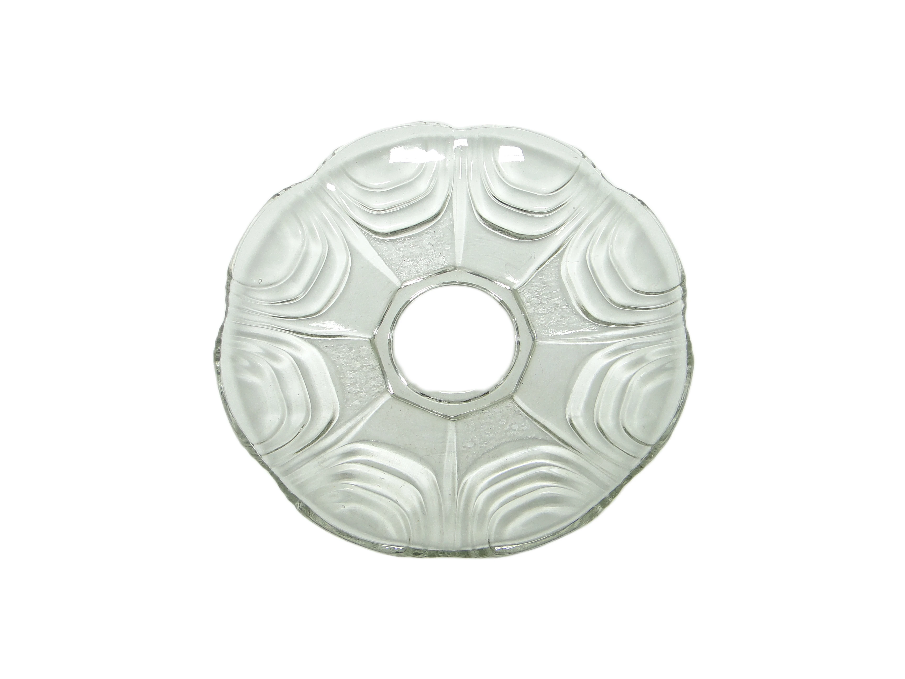Patera z lat 50., wytworzona przez Hutę Hortensja w Polsce, to przykład modernistycznego szkła prasowanego epoki powojennej. Całość wykonano z przezroczystego szkła o lekko zielonkawym odcieniu, charakterystycznym dla produkcji krajowej tego okresu. Forma opiera się na geometrycznej symetrii – centralny sześciokątny medalion otaczają segmenty przypominające płatki kwiatu, z wypukłymi, falistymi motywami. Powierzchnia patery jest naprzemiennie gładka i matowa, co podkreśla wyrazistość wzoru. Brzegi zostały łagodnie pofalowane, a grubość szkła oraz staranne wykonanie wskazują na solidność rzemiosła. Całość pozbawiona jest dodatków metalowych, a szkło pozostaje błyszczące i bardzo przejrzyste. Stan zachowania bardzo dobry – brak wyszczerbień, pęknięć czy widocznych uszkodzeń, jedynie minimalne ślady użytkowania typowe dla lat 50.W tej paterze wybrzmiewa głos powojennego modernizmu: projektanci i rzemieślnicy Huty Hortensja sięgali po inspiracje naturą oraz nowoczesnością, szukając harmonii między geometrycznym porządkiem a organiczną miękkością linii. Szkło o subtelnym, chłodnym odcieniu przypomina światło poranka odbite od stołu w rodzinnej jadalni, a wyrafinowany wzór – kwiat otwierający się powoli na wiosennym słońcu. Grubość i transparentność materiału mówią o czasach, gdy trwałość i oszczędność środków szły w parze z ambicją dekoracyjną.Patera dobrze odnajdzie się zarówno w aranżacjach inspirowanych stylem mid-century, gdzie można zestawić ją z ceramiką i drewnem z epoki, jak i w surowych, nowoczesnych przestrzeniach, gdzie stanie się wyrazistym, lecz subtelnym akcentem. Można użyć jej jako naczynia do serwowania owoców, wypieków lub cukierków, ale równie dobrze wyeksponować na matowej komodzie czy stoliku kawowym, gdzie gra światła na szkle podkreśli industrialny rodowód przedmiotu i wydobędzie jego historyczną głębię.