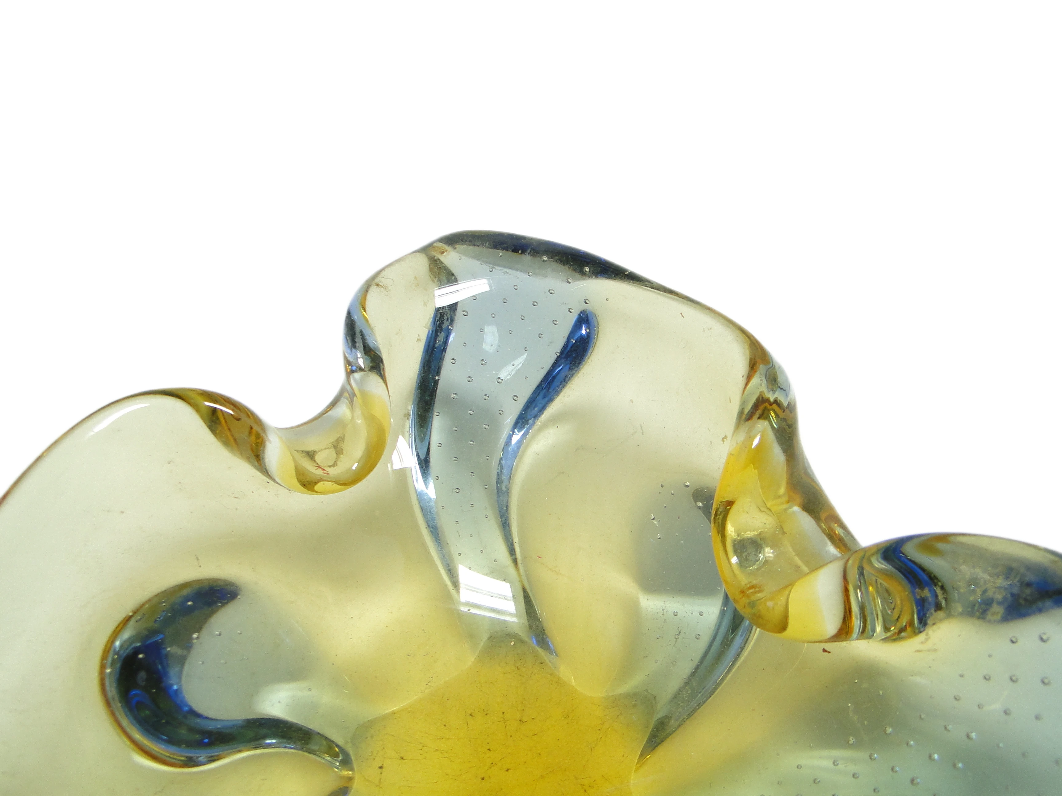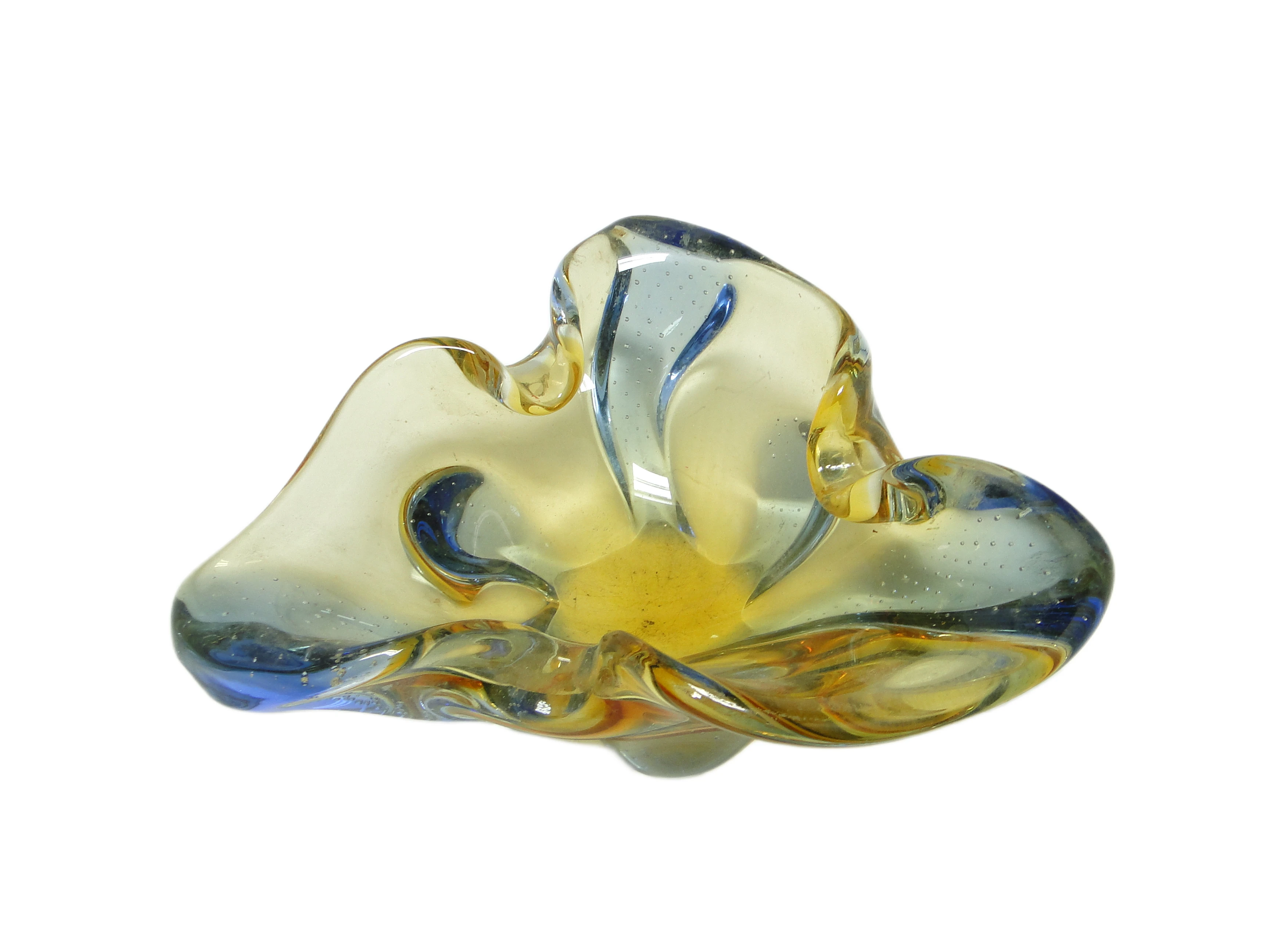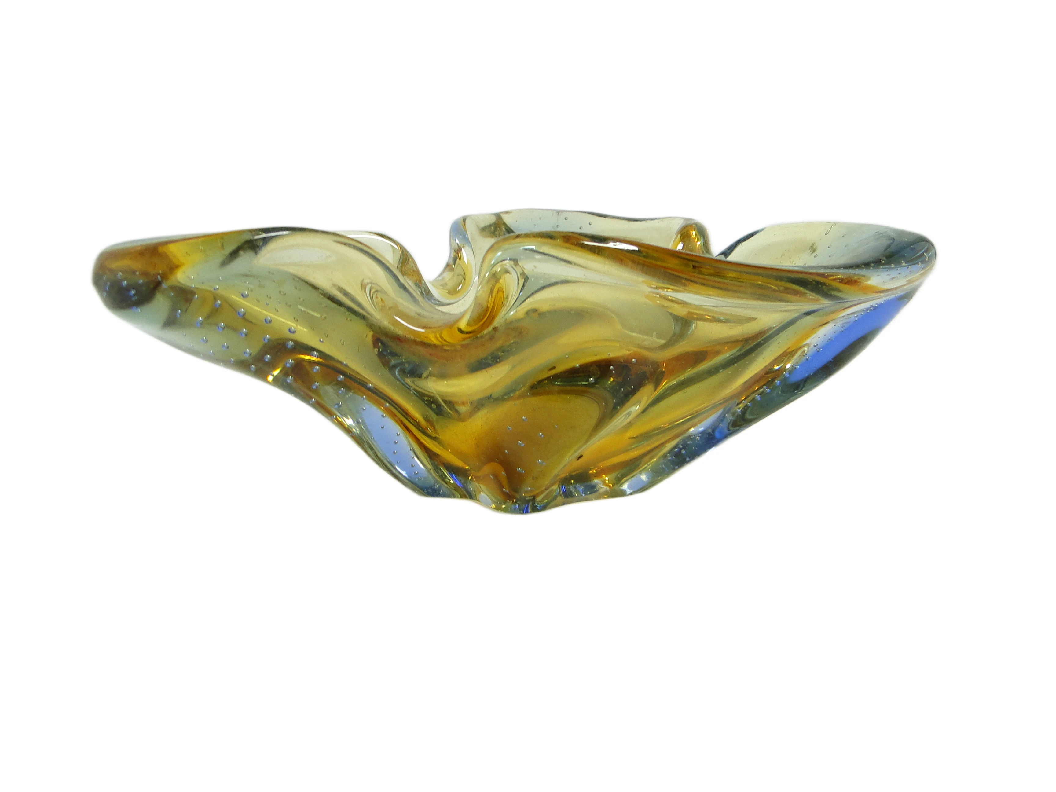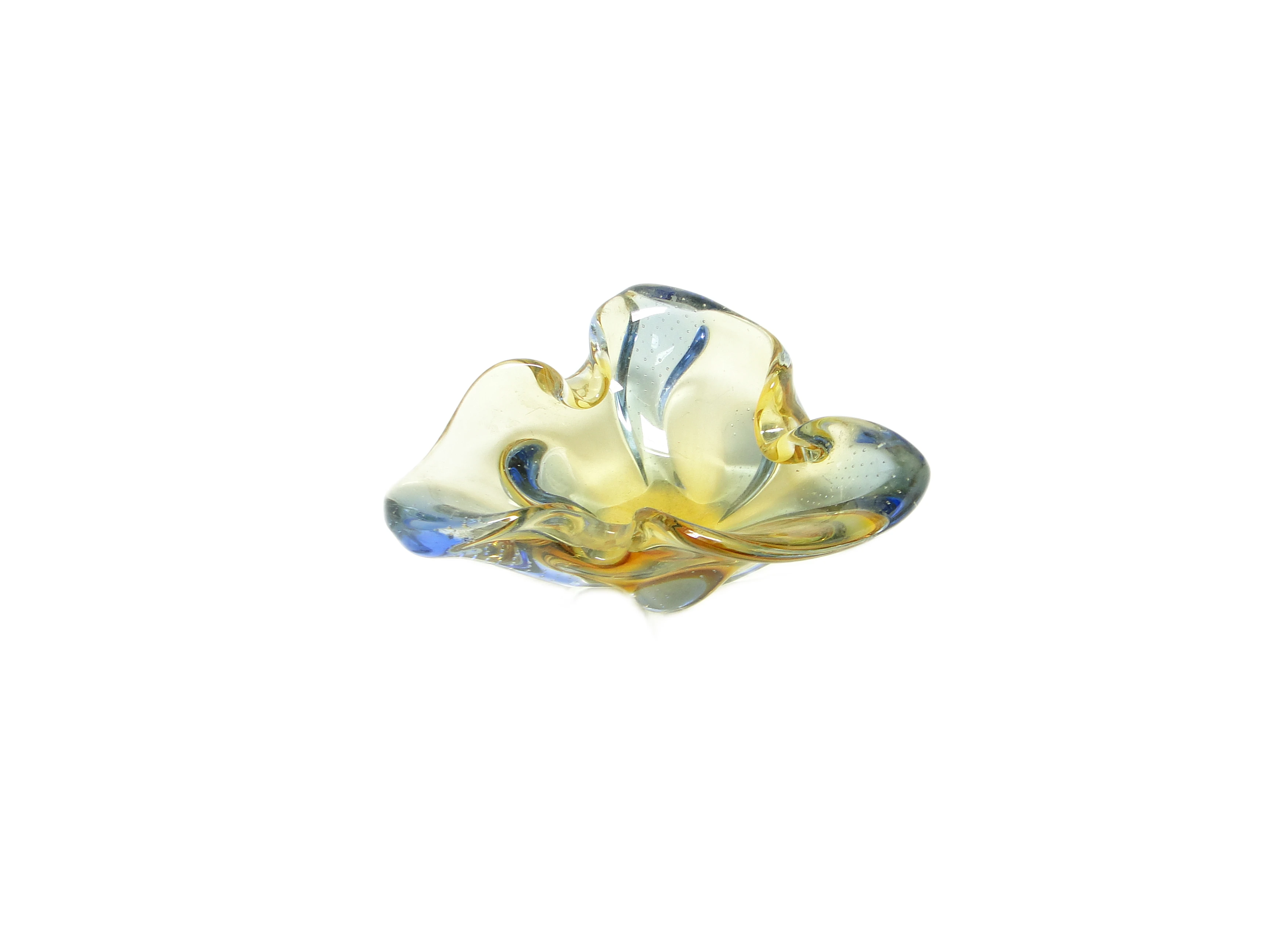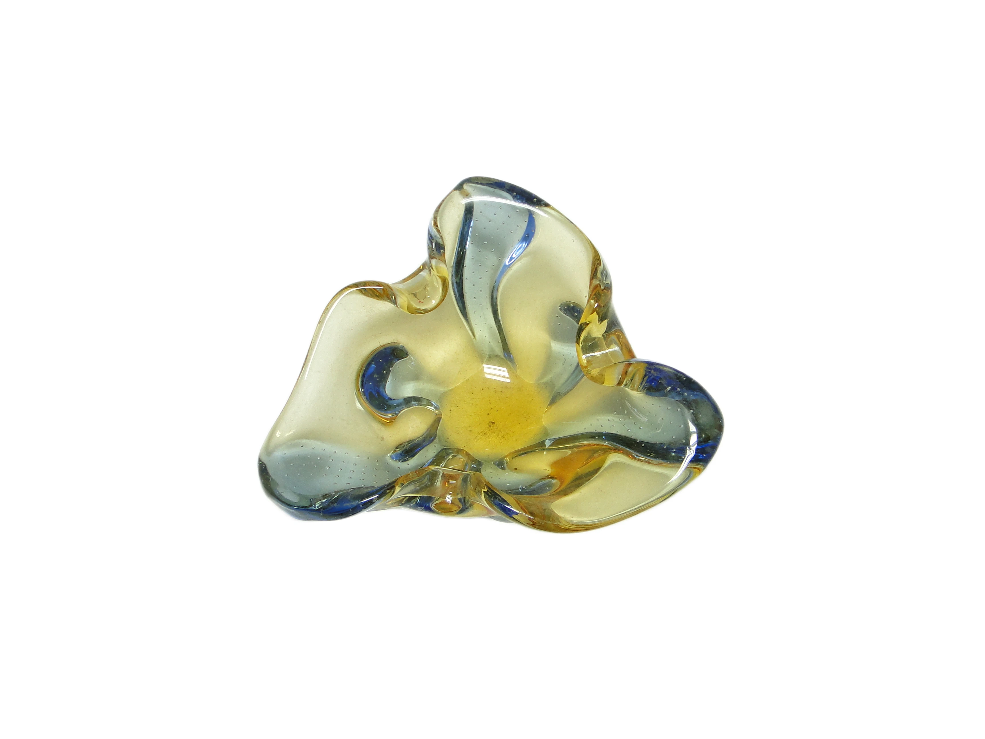 Patera zaprojektowana przez Hannę Machanowską dla Huty Szkła Mstisov w Czechosłowacji w latach 60. XX wieku stanowi przykład organicznego wzornictwa mid-century modern, wyróżniającego się swobodnie uformowaną bryłą o falujących, asymetrycznych krawędziach. Szkło, ręcznie dmuchane, ukazuje subtelne bąbelki powietrza w masie, a jego powierzchnia została wypolerowana na wysoki połysk. Dominującymi barwami są transparentny bursztyn płynnie przechodzący w głęboki kobalt, z zielonkawymi tonami widocznymi w miejscach styku kolorów. Całość opiera się na zintegrowanej, przezroczystej podstawie, która zapewnia stabilność i nie zakłóca płynności formy. Charakterystyczne jest przenikanie barw oraz brak widocznych łączeń w szkle. Stan zachowania bardzo dobry – patera nie posiada wyszczerbień, pęknięć ani innych uszkodzeń, widoczne są jedynie minimalne oznaki upływu czasu.Ta patera opowiada językiem czechosłowackiego modernizmu lat 60., kiedy artyści szkła eksperymentowali z płynną, naturalną linią i swobodą barwy, odchodząc od geometrycznej symetrii na rzecz organicznej ekspresji. Forma naczynia przywodzi na myśl rozkwitający kwiat lub miękko drapowaną tkaninę, a przechodzące przez siebie tonacje bursztynu i kobaltu przypominają zmierzch zamknięty w szklanej tafli. Każde załamanie światła na powierzchni szkła wydaje się opowiadać o wolności twórczej epoki i jej fascynacji naturą.Współcześnie paterę można ustawić na jasnej konsoli lub stole jadalnianym, gdzie jej kolorystyka i gra światła zostaną w pełni wyeksponowane. Dobrze zaprezentuje się w zestawieniu z ceramicznymi naczyniami w stonowanych odcieniach, szklanymi wazonami lub geometrycznymi świecznikami. W aranżacjach minimalistycznych czy kolekcjonerskich mid-century modern może być prezentowana solo jako centralny akcent, pozwalając bryle i kolorycie odgrywać główną rolę.Brak dodatkowych informacji technicznych i zaleceń pielęgnacyjnych.