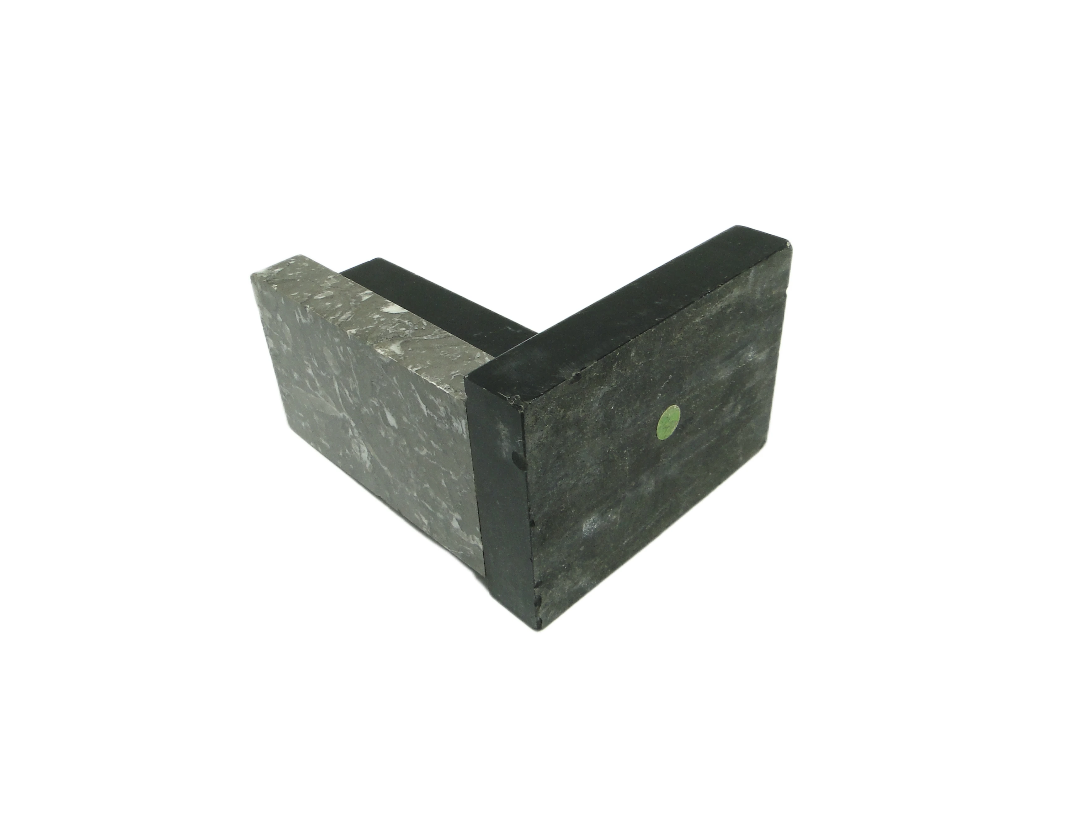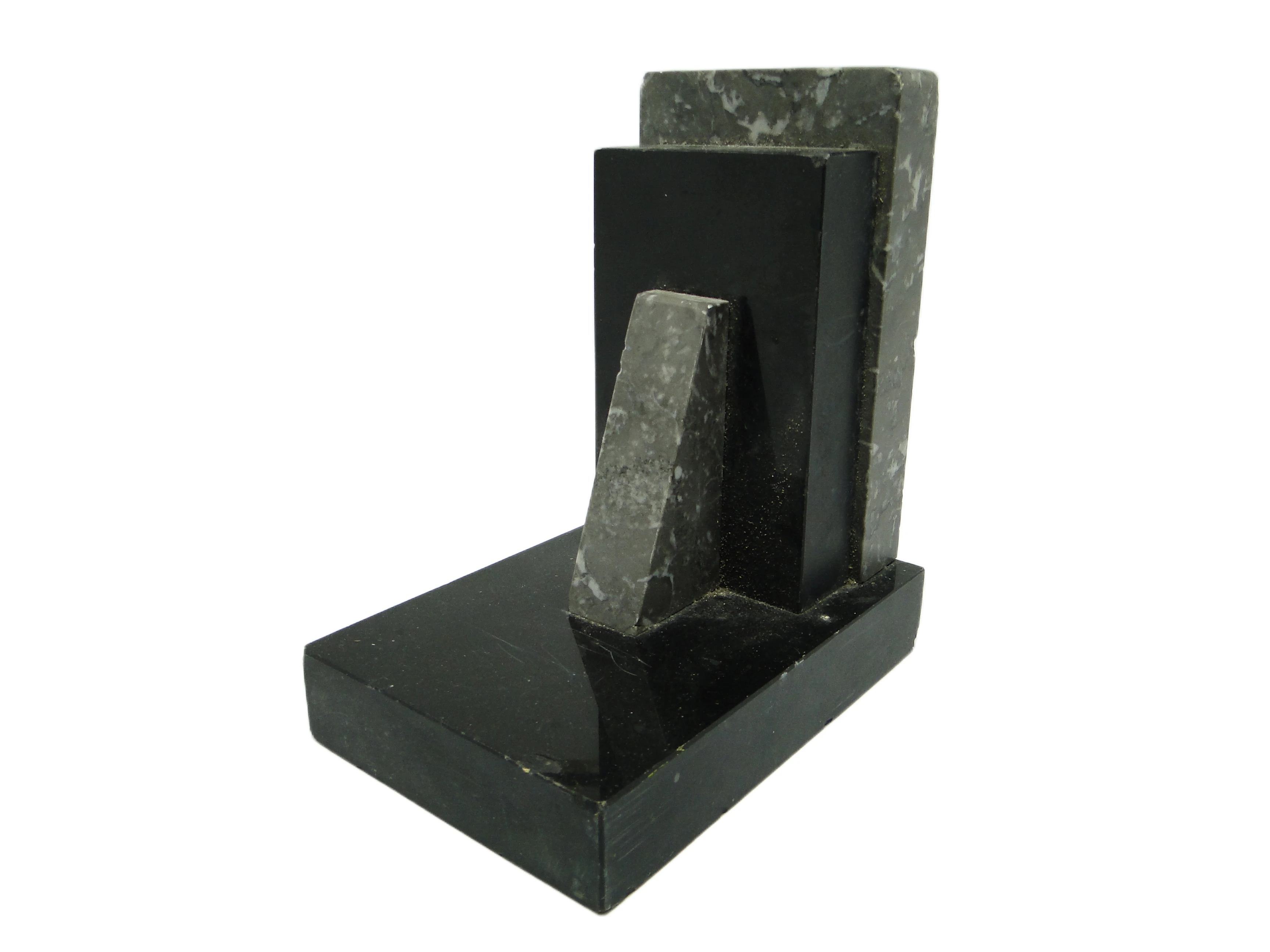 Podpórka do książek z Belgii z lat 30. XX wieku powstała z dwóch rodzajów marmuru: głęboko czarnego, o lustrzanym połysku, oraz chłodnego, średnioszarego z wyrazistym, białym użyleniem. Kompozycja opiera się na architektonicznej geometrii – prostokątne i trapezowe bloki zestawiono w asymetryczną, stopniowaną formę typową dla stylu Art Deco. Mocno wypolerowane powierzchnie czarnego marmuru odbijają światło, podczas gdy szary marmur wnosi subtelny, organiczny rysunek i delikatną fakturę. Konstrukcja jest precyzyjna, z ostrymi krawędziami i starannie dopasowanymi łączeniami. Podpórka jest masywna, stabilna i funkcjonalna, a jej ciężar zapewnia skuteczne podparcie książek. Widoczne są jedynie drobne ślady użytkowania – niewielkie ryski i minimalne przetarcia na krawędziach, bez odprysków czy poważnych uszkodzeń, co potwierdza bardzo dobry stan zachowania.W tej marmurowej bryle wybrzmiewa głos lat 30., gdy Art Deco sięgało po śmiałą geometrię i luksusowe materiały. Podpórka zdaje się opowiadać o epoce, w której nawet drobny przedmiot miał ambicję, by wyznaczać rytm nowoczesnego wnętrza. Ostre linie i kontrast czerni ze szarością przywodzą na myśl architekturę wieżowców, a odbijające światło powierzchnie sugerują atmosferę eleganckich salonów i bibliotek sprzed niemal wieku. To detal, który cicho przypomina o uporządkowanej energii i aspiracjach epoki.We wnętrzu można ją zestawić z regałem z ciemnego dębu lub orzecha, gdzie kontrast marmuru podkreśli kolekcję oprawionych książek. Dobrze sprawdzi się obok geometrycznych wazonów z grubego szkła lub chromowanych akcentów – lampy o prostych liniach czy nowoczesnej ramki na zdjęcia. W aranżacji inspirowanej Art Deco lub w eklektycznych przestrzeniach warto połączyć podpórkę z polerowanym metalem i szlachetnymi tkaninami, tworząc uporządkowaną, lecz wyrazistą kompozycję. Można także wykorzystać ją pojedynczo jako rzeźbiarski akcent na komodzie lub konsoli.