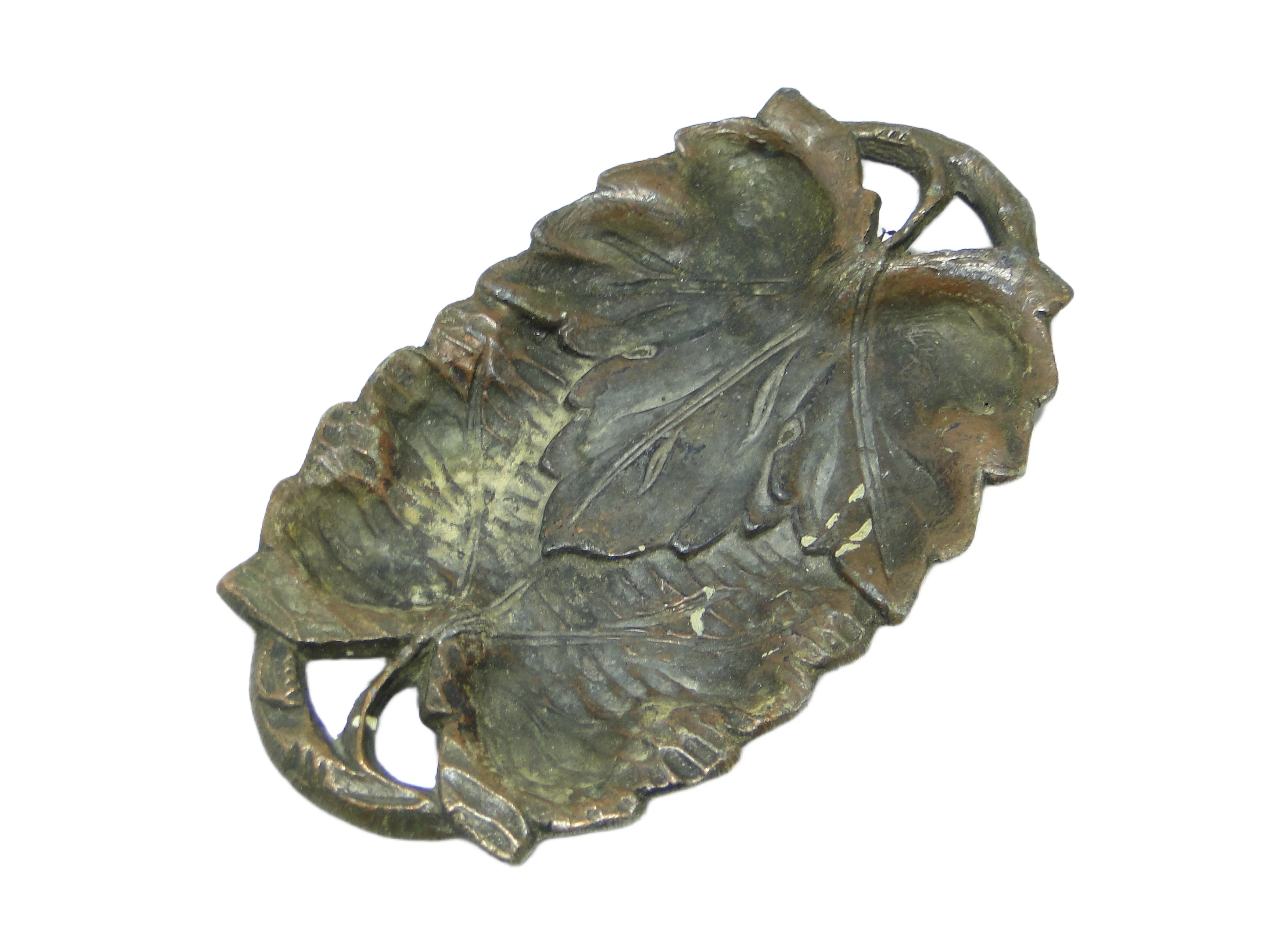 Podstawka pod klucze z początku XX wieku, wykonana w Polsce, stanowi przykład secesyjnego rzemiosła metalowego. Została uformowana z cyny pokrytej cienką warstwą mosiądzu, przyjmując kształt rozbudowanego liścia o wyraźnie odwzorowanych żyłkach, falujących krawędziach i nieregularnych konturach. Dominującą barwą jest przygaszony, spatynowany brąz z subtelnymi przebarwieniami w tonach zieleni i ciepłego brązu, typowymi dla naturalnie starzejącego się metalu. W miejscach najbardziej wypukłych powłoka mosiężna jest przetarta, odsłaniając chłodniejszy odcień cyny, co wprowadza głębię i akcentuje organiczność formy. Matowa powierzchnia z delikatnym połyskiem na wyższych partiach podkreśla rzeźbiarską fakturę przedmiotu. Struktura metalu, wyczuwalna pod palcami, dokładnie oddaje fakturę prawdziwego liścia. Obie strony zakończone są otwartymi, ażurowymi uchwytami naturalnie wpisanymi w żyłkowanie. Widoczne są drobne ślady patyny, przetarcia i naturalne przebarwienia, lecz brak poważnych uszkodzeń czy napraw. Stan zachowania: bardzo dobry, z typowymi dla wieku, subtelnymi oznakami użytkowania.W tej podstawce zapisany jest głos secesji – epoki, która z entuzjazmem czerpała inspiracje z natury, asymetrii i płynności linii. Metalowa tafla, miejscami matowa, miejscami lekko połyskująca, zatrzymuje efemeryczność liścia w codziennym przedmiocie. Patyna i przebarwienia mówią o minionych dekadach, kiedy to przedmiot towarzyszył kolejnym pokoleniom, stając się niemym świadkiem zmieniających się wnętrz i obyczajów – jakby szeptał o harmonii z przyrodą i subtelnym pięknie w gestach dnia codziennego.Podstawka może znaleźć miejsce na konsoli w przedpokoju, stoliku w salonie czy biurku, gdzie posłuży do przechowywania kluczy, drobnych monet lub biżuterii. Zestawienie jej z innymi secesyjnymi lub roślinnymi detalami – szkłem artystycznym, ceramiką z początku XX wieku, a także współczesnymi, minimalistycznymi formami – pozwoli wydobyć kontrast pomiędzy historią a nowoczesnością. Dobrze sprawdzi się w aranżacjach inspirowanych Art Nouveau, eklektycznych kolekcjach lub wnętrzach, gdzie obecne są ciepłe metale i naturalne materiały, wprowadzając dyskretny, historyczny akcent.