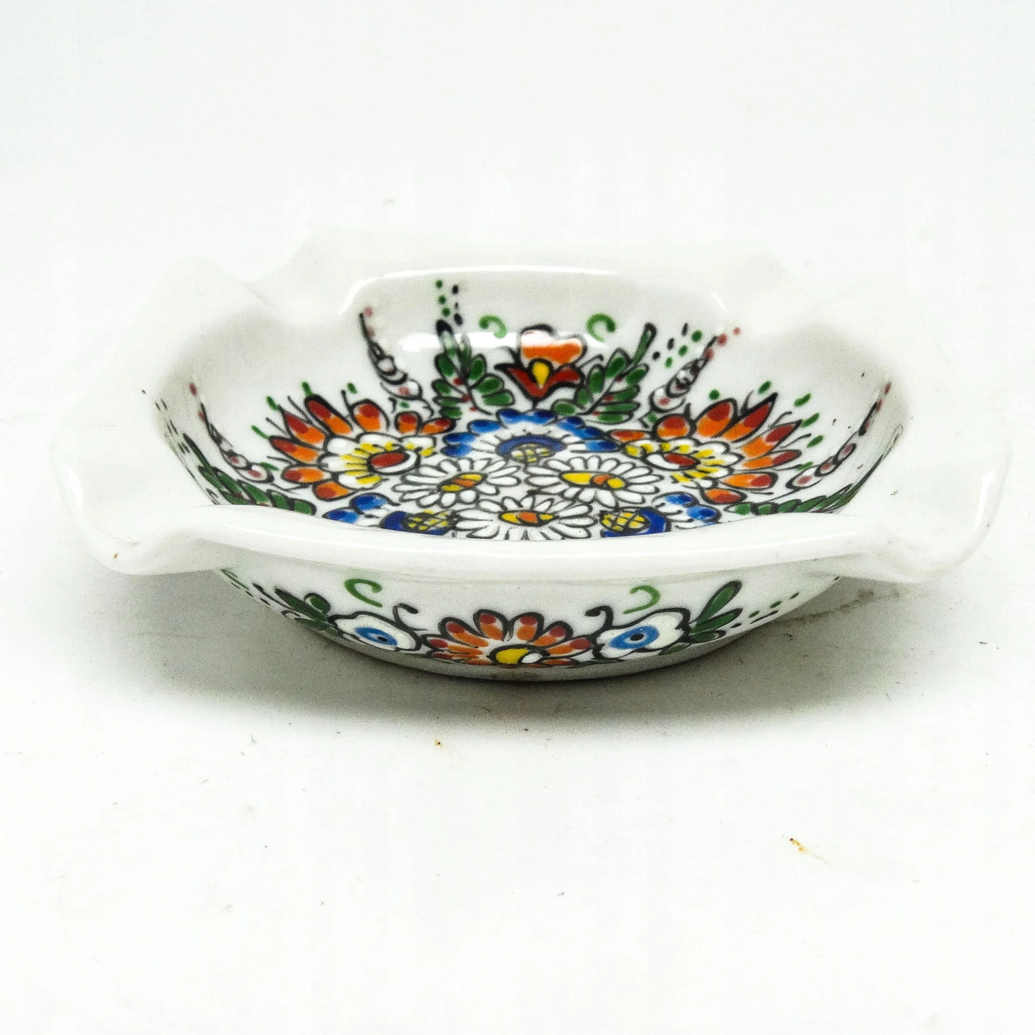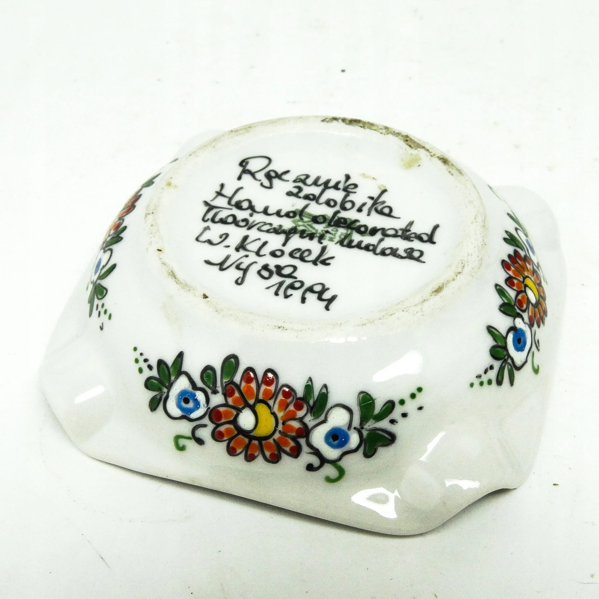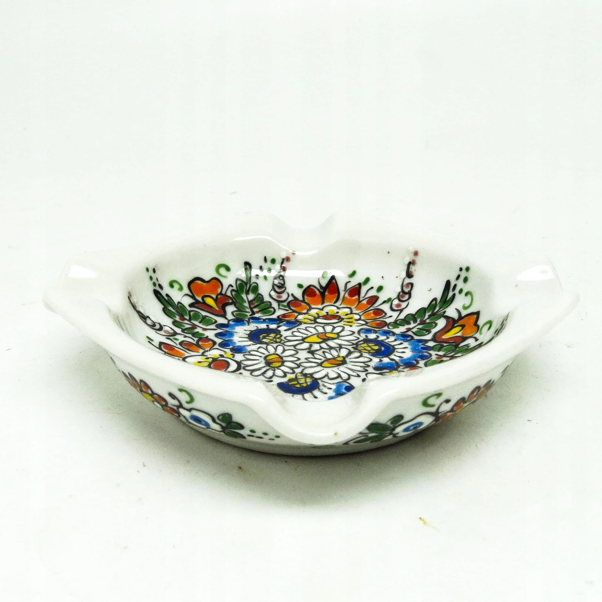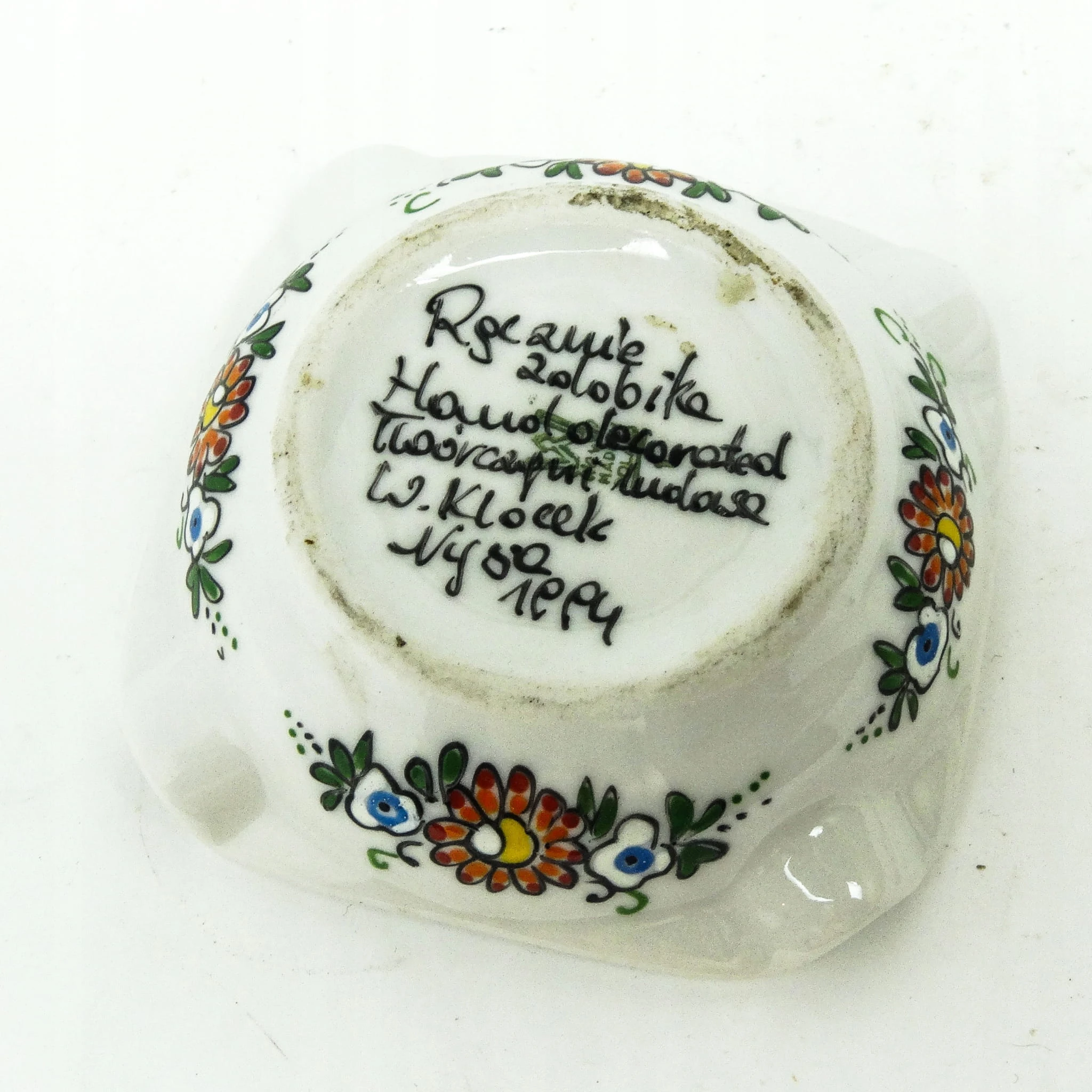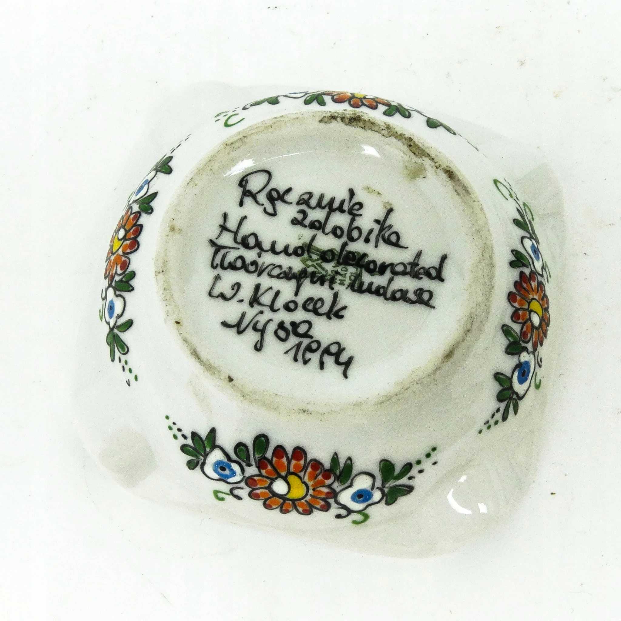 Popielnica została wyprodukowana w wytwórni Wawel w latach 90. Stan bardzo dobry. Przedmiot został następnie dostarczony do Opola gdzie zatrudnione artystki ludowe zdobiły w unikatowe wzory kwiatowe. Wzory nie są powtarzalne. Każdy z przedmiotów był przygotowany przez inną artystkę. Następne porcelana dystrybuowana była przez sieć sklepów Cepelia.