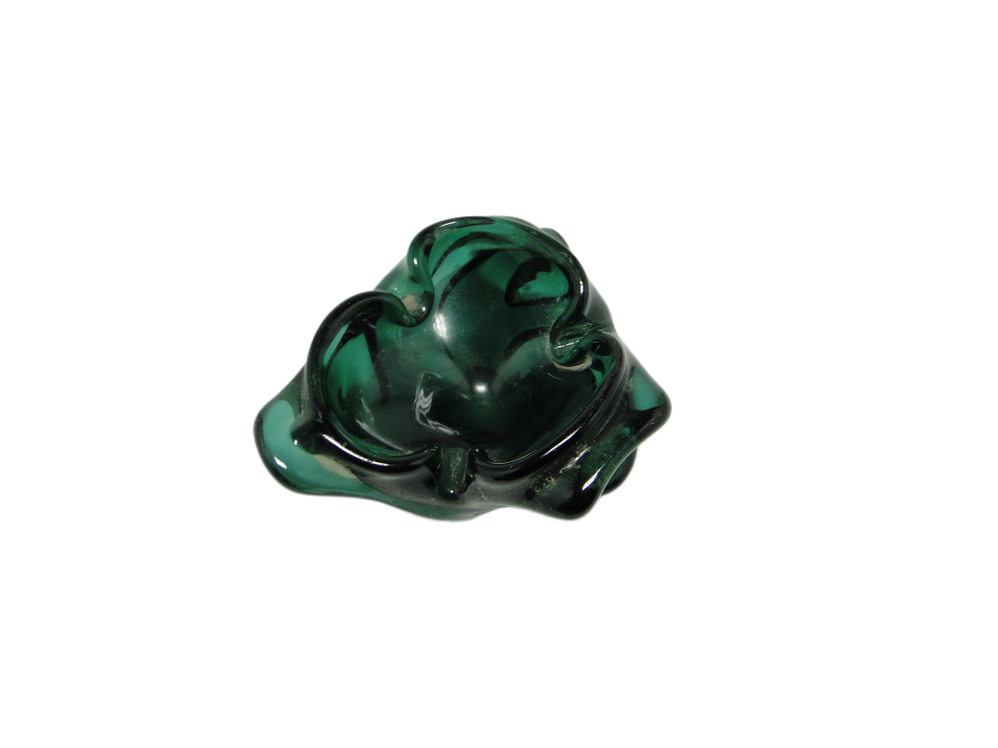 Popielnica mid-century modern z Polski, powstała w latach 70., została wykonana z grubego, ręcznie formowanego szkła w intensywnym, szmaragdowozielonym odcieniu o chłodnym tonie. Monochromatyczna forma podkreśla głębię koloru i pozwala światłu swobodnie odbijać się od lustrzanej, wysoko wypolerowanej powierzchni. Nieregularne, faliste krawędzie oraz organiczne fałdy szkła świadczą o rzemieślniczej technice wykonania, a płynne, bezszwowe przejścia między partiami bryły potęgują wrażenie naturalności. Całość zachowuje stabilność dzięki lekko spłaszczonej podstawie, nie posiada żadnych dodatkowych zdobień, grawerunków czy kolorystycznych akcentów. Stan zachowania bardzo dobry – brak widocznych uszkodzeń, pęknięć czy odprysków, jedynie minimalne ślady użytkowania zgodne z wiekiem przedmiotu.Ten przedmiot opowiada historię polskiego szkła artystycznego późnego PRL-u, kiedy rzemieślnicy eksperymentowali z wolną formą i ekspresją koloru. Jego dynamiczna linia wydaje się naśladować ruch fal lub płatków, jakby szkło zatrzymało się na moment w płynnym przejściu między stanami skupienia. Szmaragdowa tafla przypomina spokojną powierzchnię jeziora, odbijając światło i sugerując inspirację naturą oraz fascynację organicznymi kształtami, która definiowała estetykę lat 70.Popielnica odnajdzie się zarówno w salonie urządzonym w duchu mid-century modern, jak i w eklektycznym, kolekcjonerskim wnętrzu. Można ją zestawić z prostymi, jasnymi meblami drewnianymi, szklaną lub metalową konsolą i ceramiką w neutralnych barwach. Warto połączyć ją z naturalnym światłem lub ustawić pod punktem świetlnym, by wydobyć głębię zieleni i połysk szkła. Może służyć jako pojedynczy akcent na stole, komodzie czy regale – zarówno z delikatną gałązką, jak i solo, podkreślając swoją rzeźbiarską formę.