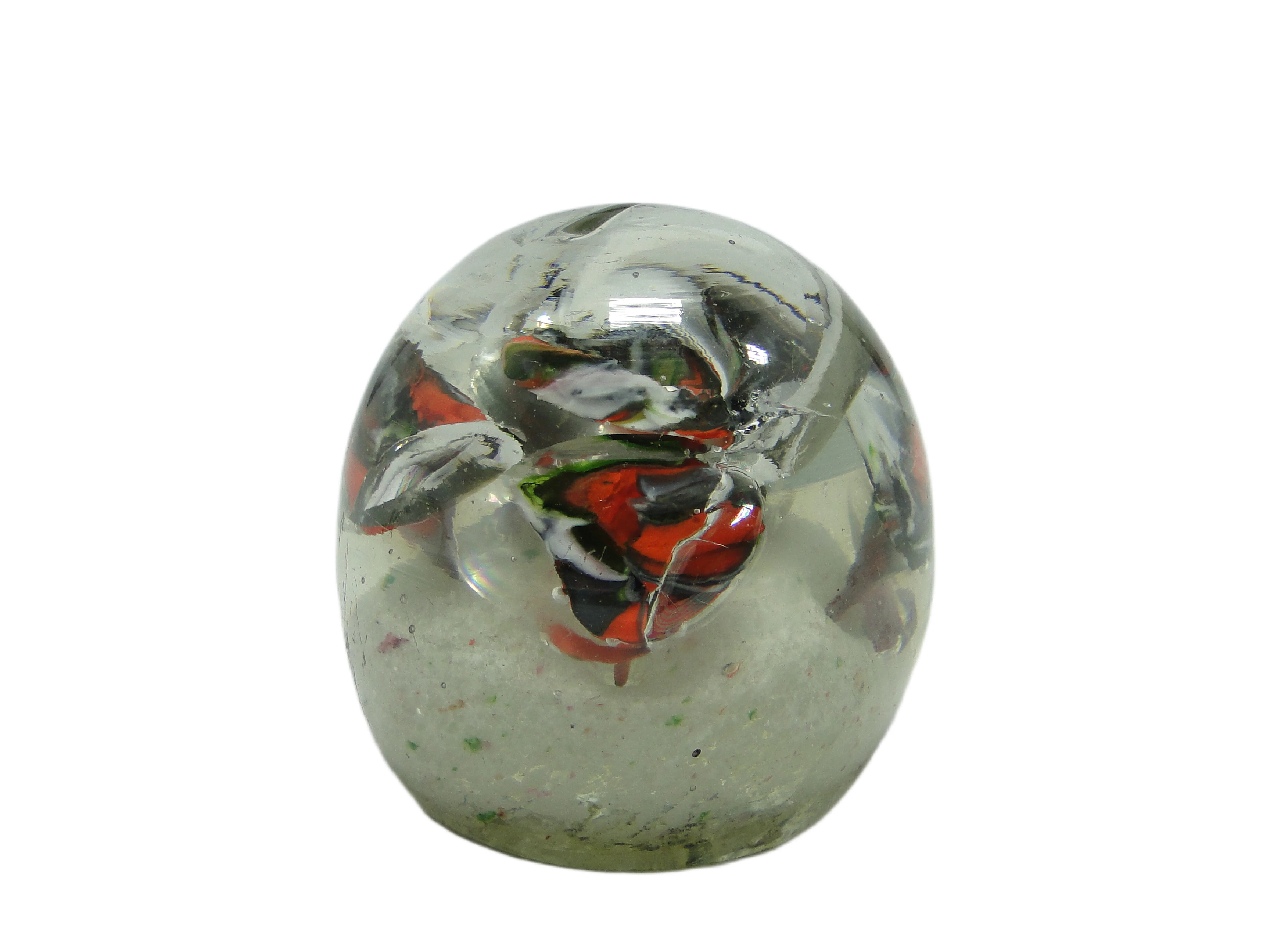 Przycisk do papieru z lat 50., wykonany ze szkła przez polskich rzemieślników, reprezentuje nurt mid-century modern. Gładka, wypolerowana powierzchnia wydobywa przezroczystość materiału, eksponując dynamiczne plamy koloru – głęboki pomarańcz, czerń oraz drobne akcenty zieleni i różu zatopione w szklanej masie. Organiczny, wydłużony kształt z zaokrągloną górą i płaską podstawą zapewnia stabilność i funkcjonalność, odwołując się do prostoty i zamiłowania do naturalnych form typowych dla epoki. Grubość szkła nadaje przedmiotowi solidności, a każda sztuka zyskuje indywidualny charakter dzięki ręcznemu wykonaniu i unikatowej kompozycji wewnętrznej. Na powierzchni widoczne są drobne pęcherzyki powietrza i delikatne przetarcia, które potwierdzają wiek oraz oryginalność obiektu. Zachowany w dobrym stanie vintage, bez wyszczerbień i pęknięć, z subtelnymi śladami użytkowania.W szklanym przycisku odczytać można atmosferę lat 50., kiedy polskie huty szkła sięgały po nowe techniki barwienia i formowania, poszukując nowoczesnej ekspresji w przedmiotach codziennego użytku. Zatrzymane w ruchu barwne plamy przywodzą na myśl fragment świata przyrody – jakby kawałek roślinnej materii został zamknięty pod grubą taflą szkła. Każdy egzemplarz, z niepowtarzalnym układem kolorów, opowiada o twórczym eksperymencie epoki, w której sztuka przenikała do codzienności, nadając jej szlachetności i wyrazistości.Przycisk można wyeksponować na biurku w gabinecie, gdzie gra światła i koloru będzie subtelnie zmieniać się w zależności od pory dnia. Dobrze sprawdzi się w otoczeniu mebli i dekoracji inspirowanych mid-century modern lub minimalistycznych akcentów – na konsoli w salonie, wśród przezroczystych i ceramicznych bibelotów, a także obok prostych, jasnych form z drewna. Można go zestawić z kolekcją vintage’owych drobiazgów lub minimalistyczną grafiką, by wydobyć jego kolekcjonerski charakter i podkreślić organiczną kompozycję kolorystyczną.