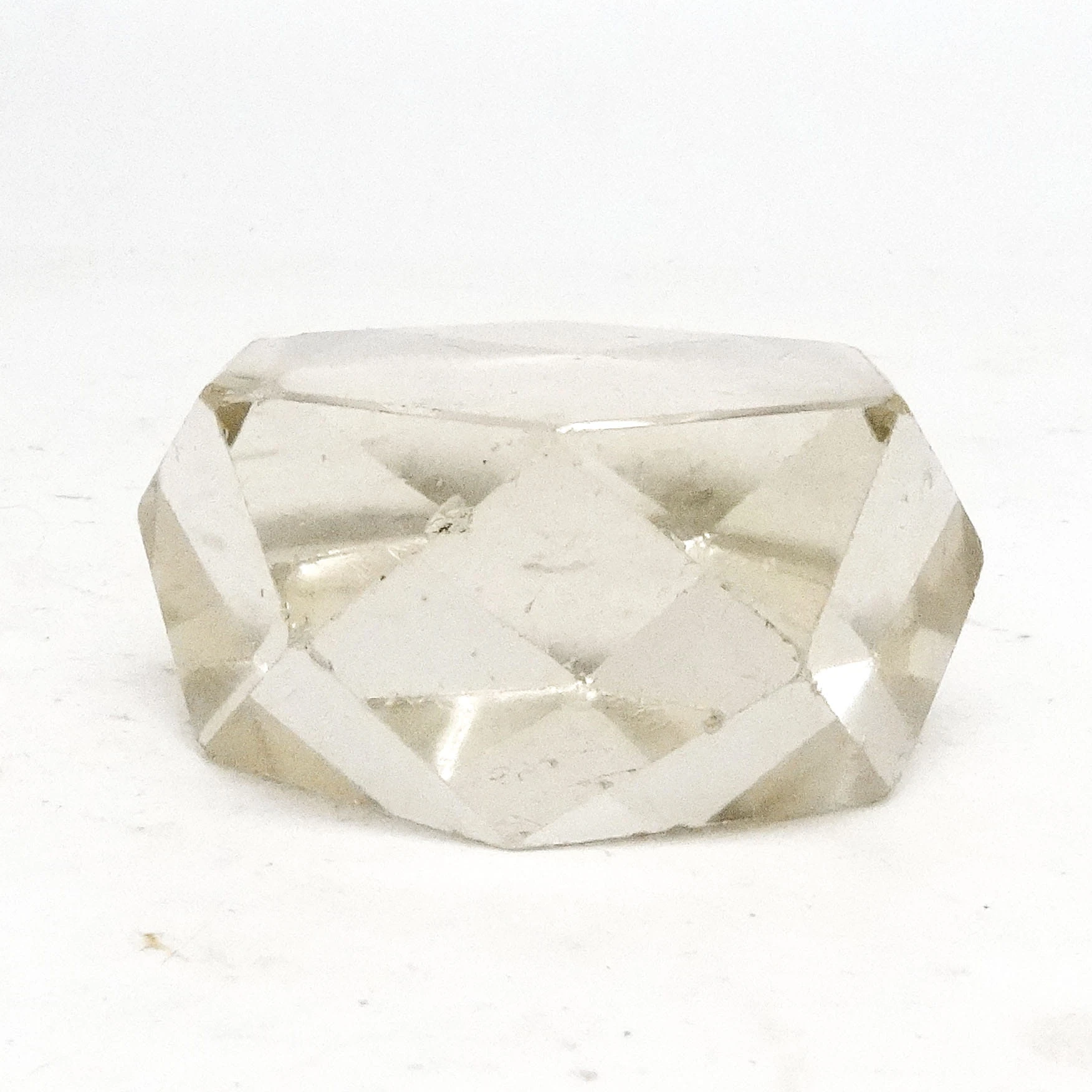 Przycisk do papieru wyprodukowany został w Polsce około 1950 roku. Powierzchnia jest wykonana ze szkła. Nosi ślady użytkowania w postaci odprysków.