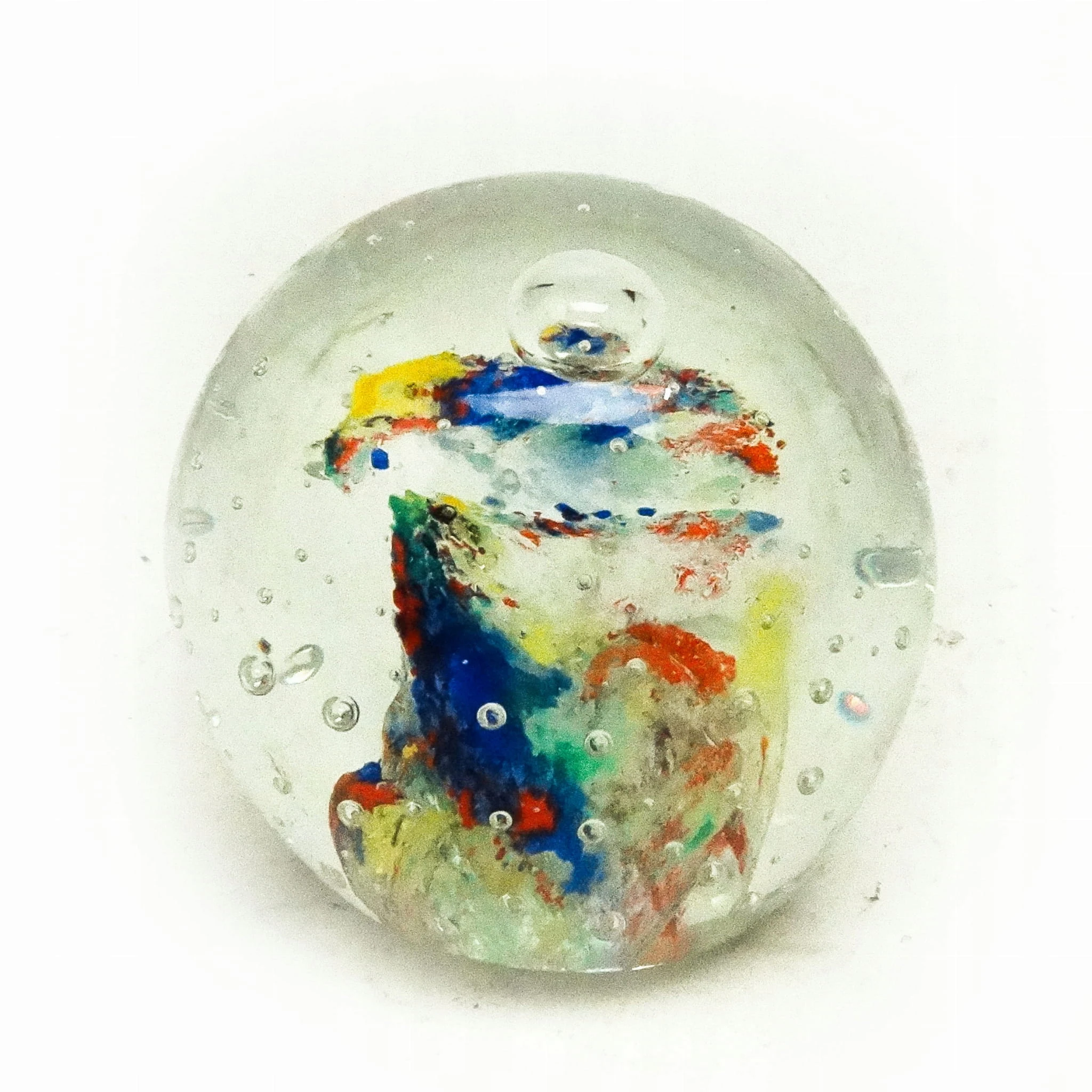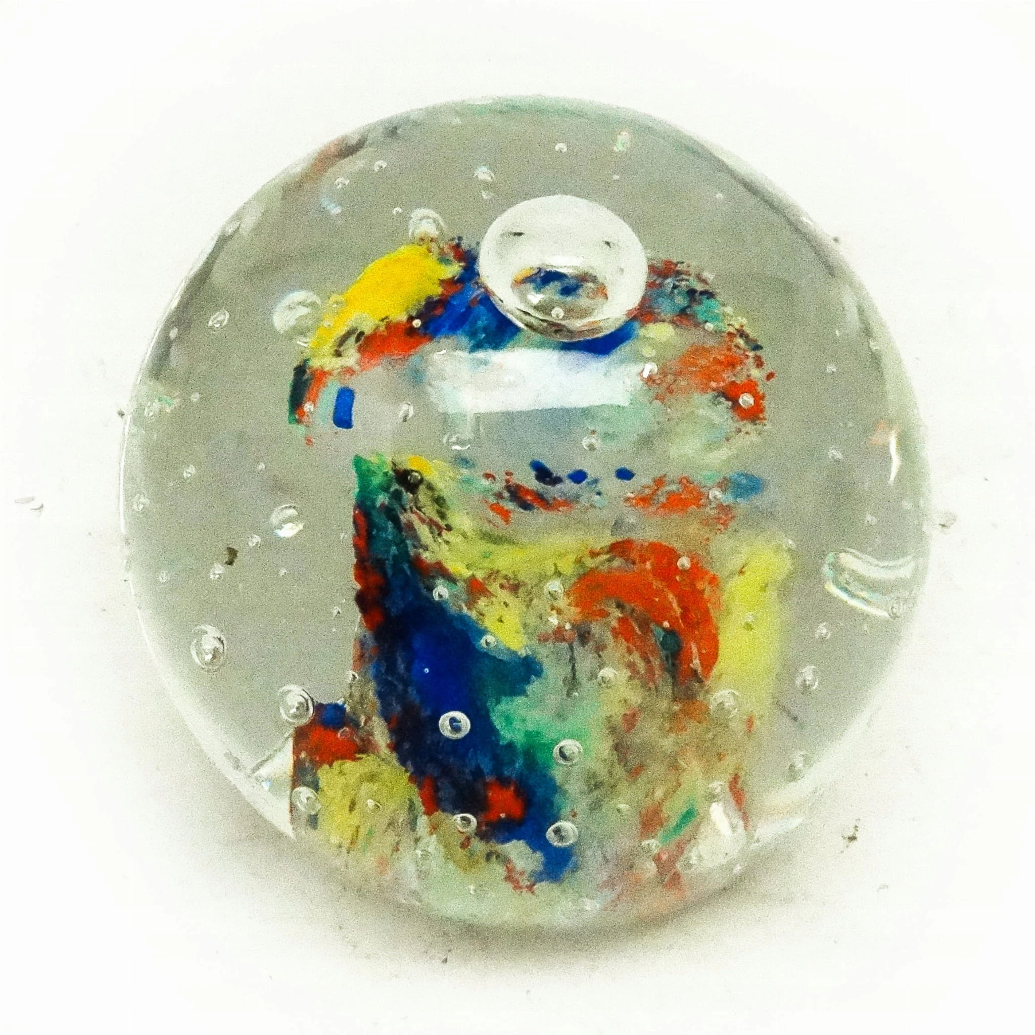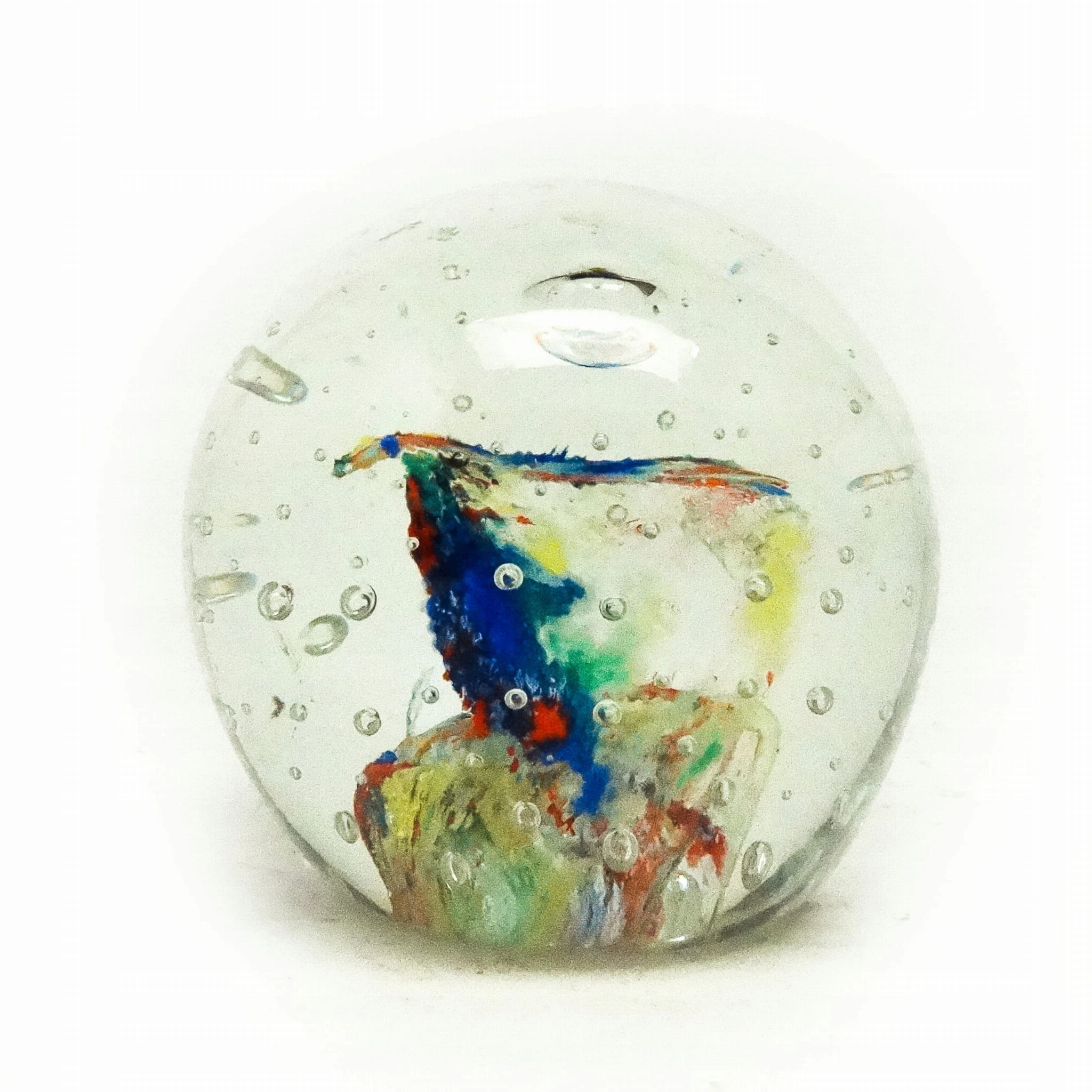 Przycisk do papieru wyprodukowany został w Niemczech około 1950 roku. Powierzchnia jest wykonana ze szkła. Zachowany jest w bardzo dobrym stanie.