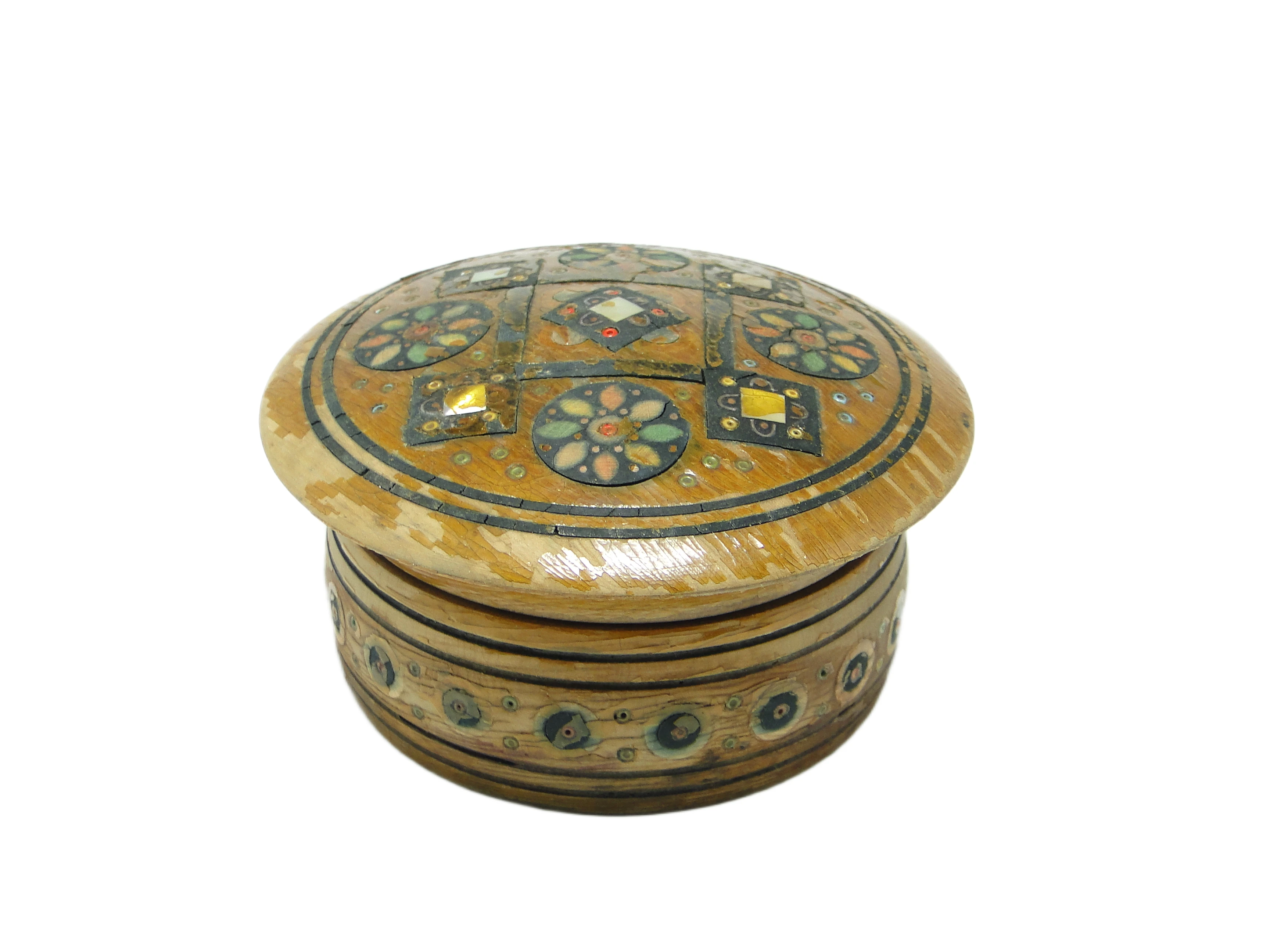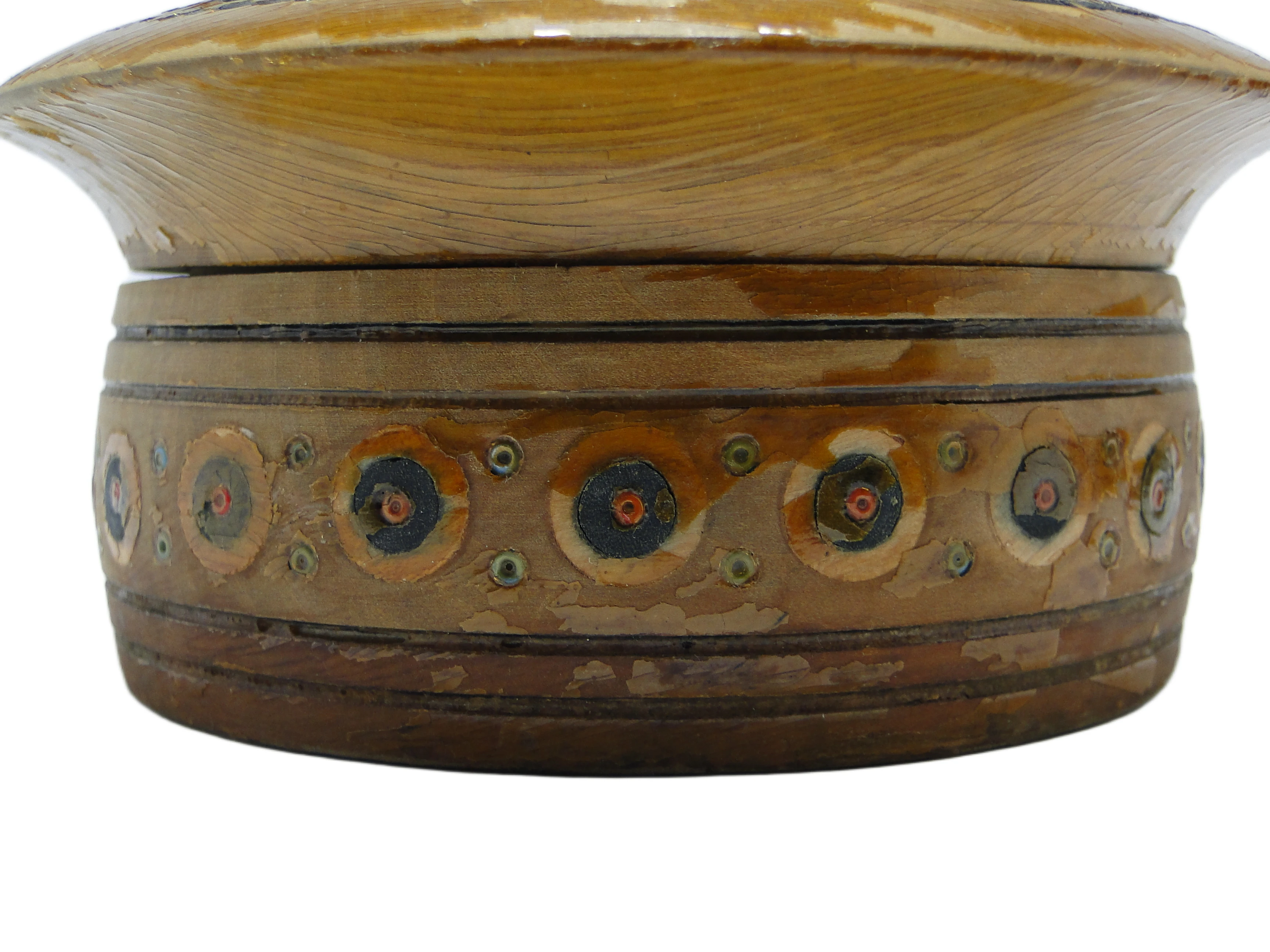 Okrągłe pudełko w stylu huculskim, wykonane z toczonego drewna bukowego, pochodzi z Polski z lat 30. XX wieku. Wykończone lakierem w ciepłym, miodowym odcieniu, eksponuje naturalne usłojenie drewna i lekko błyszczącą powierzchnię. Wieczko i korpus ozdobione są ręcznie malowanymi motywami ludowymi: geometrycznymi okręgami, rombami oraz stylizowanymi kwiatami w odcieniach zieleni, czerwieni, żółci, niebieskiego i czerni. Wzory układają się symetrycznie, podkreślone cienkimi czarnymi liniami i kolorowymi kropkami, co nadaje całości wyrazistą, a jednocześnie zharmonizowaną kompozycję. Charakterystyczny dla regionu huculskiego styl dekoracji łączy rustykalną prostotę z misternym detalem. Konstrukcja zapewnia szczelne zamknięcie, a proporcje i ornamentyka odzwierciedlają międzywojenną fascynację sztuką ludową Karpat. Na powierzchni widoczne są drobne rysy, lokalne przetarcia lakieru oraz delikatna patyna, typowe dla wieku przedmiotu. Zachowany w dobrym stanie, bez poważniejszych uszkodzeń czy napraw.To pudełko niesie w sobie opowieść pogranicza Karpat, gdzie codzienność przenikała się z rytuałem, a sztuka użytkowa stawała się świadectwem lokalnej tożsamości. Jego forma i dekoracja przypominają świat, w którym motywy roślinne symbolizowały dostatek, a geometryczne ornamenty – porządek i harmonię cyklicznie zmieniających się pór roku. Lekko wypolerowana przez czas powierzchnia zdaje się szeptać o rodzinnych domach, w których takie przedmioty gromadziły drobiazgi i pamiątki, będąc zarówno ozdobą, jak i nieodłączną częścią domowych rytuałów.Pudełko można wyeksponować na komodzie lub półce w salonie, gdzie jego kolorystyka i dekoracyjny detal będą współgrać z dodatkami z naturalnych materiałów, jak drewno czy ceramika. Warto zestawić je z tekstyliami o surowej fakturze – lnem, wełną – by podkreślić etniczny lub rustykalny charakter wnętrza. Można również połączyć je z innymi przedmiotami polskiej sztuki ludowej albo zestawić z nowoczesnymi akcentami, wydobywając kontrast między tradycją a współczesnością.