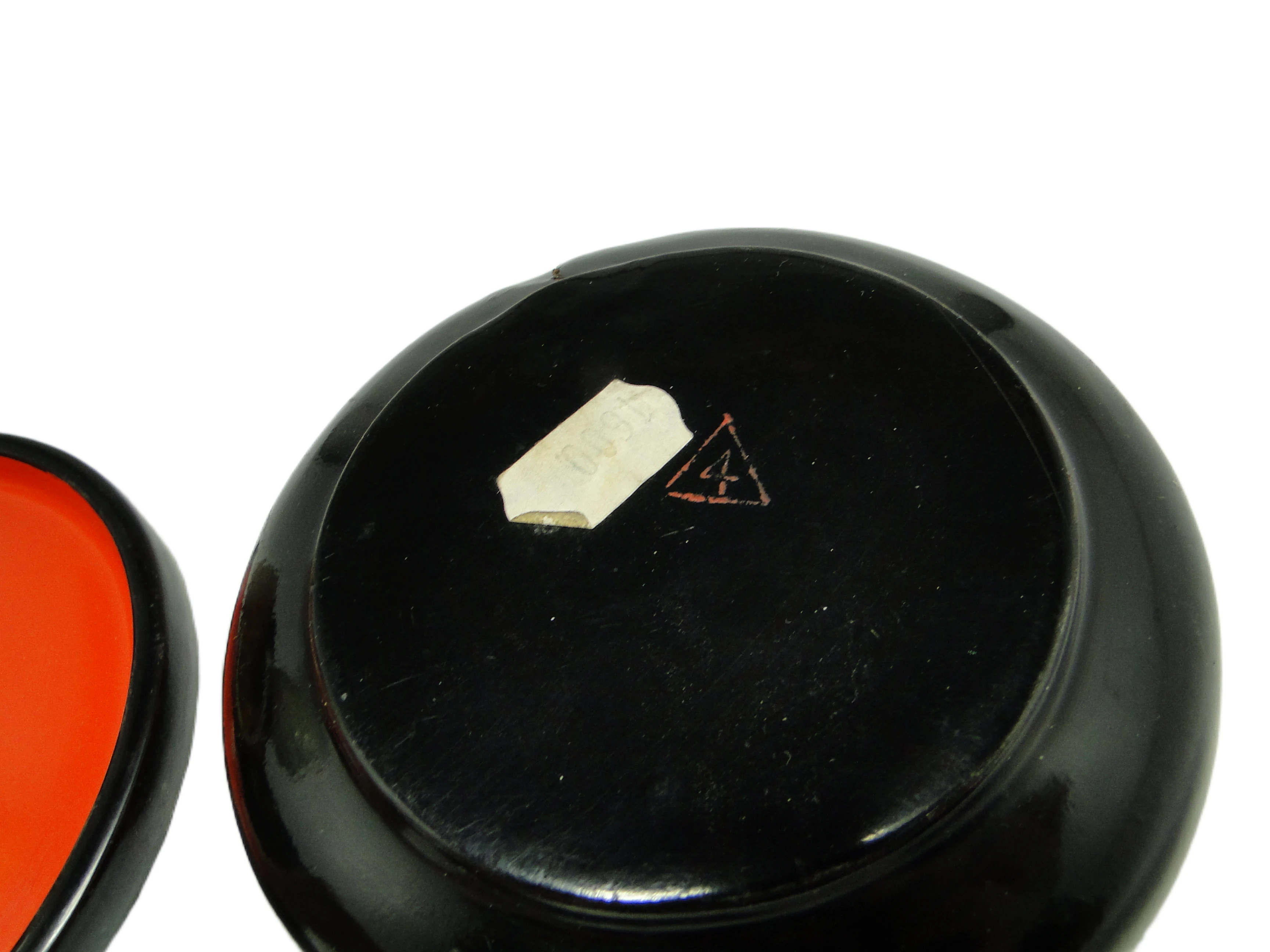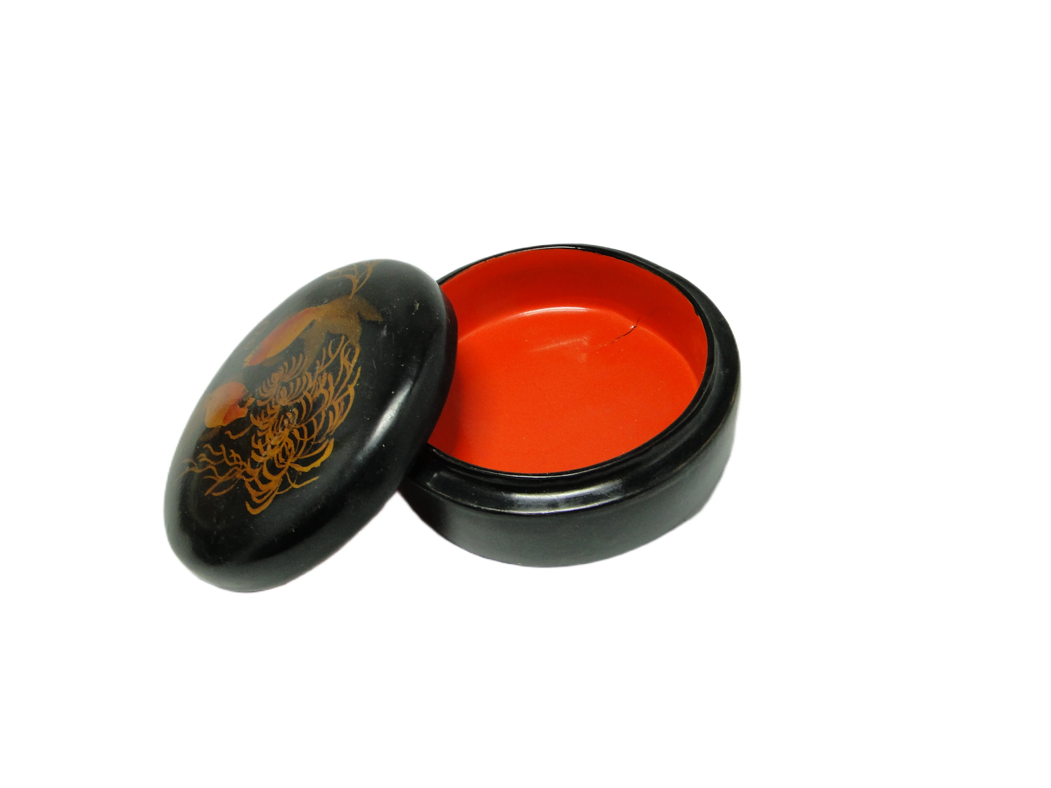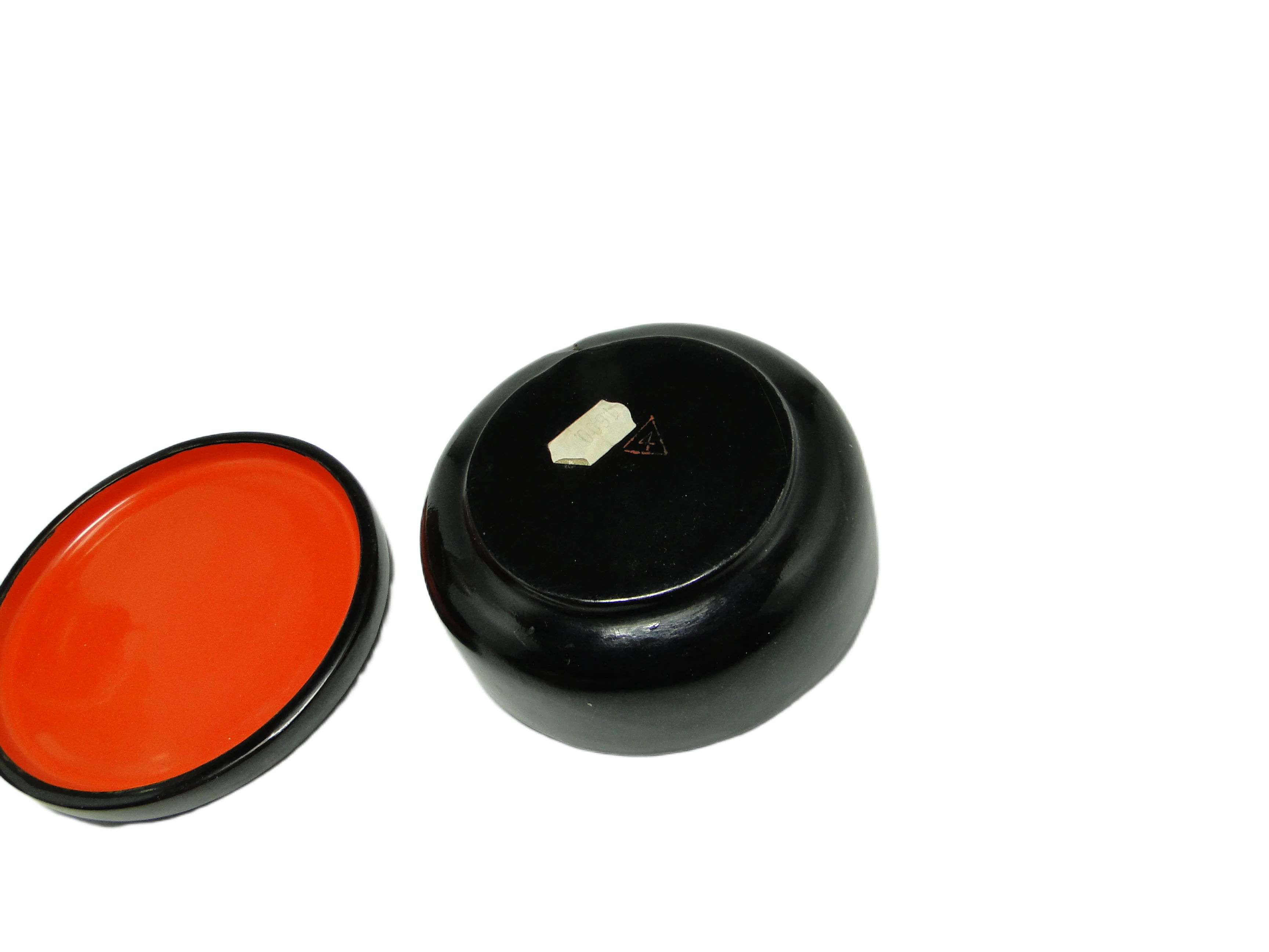 Japońskie pudełko z laki z lat 50. to przykład kunsztownego rzemiosła, które łączy tradycyjne motywy z minimalistyczną formą połowy XX wieku. Okrągła, kopulasta bryła z gładkimi, subtelnie wyoblonymi bokami pokryta jest głęboką, lśniącą czernią, charakterystyczną dla japońskiej sztuki lakierniczej. Wieczko zdobi ręcznie malowany dekor w ciepłych tonach złota i czerwieni, przedstawiający stylizowane złote rybki wśród wodnych roślin. Dekoracja została wykonana z precyzją, a metaliczny połysk farby podkreśla szlachetność kompozycji. Pudełko cechuje się idealnie dopasowaną pokrywką i niewidocznymi łączeniami, a całość zachowana jest w bardzo dobrym stanie – widoczne są jedynie drobne, powierzchniowe ślady użytkowania typowe dla tej epoki, bez odprysków czy ingerencji renowacyjnych.Ten przedmiot wyraża estetykę japońskiego powojennego modernizmu, w którym powaga tradycji spotyka się z nową lekkością. Gładka powierzchnia czarnej laki odbija światło niczym spokojna tafla wody, a złote rybki – symbol szczęścia w japońskiej kulturze – zdają się płynąć pośród refleksów, przywołując atmosferę domowego spokoju. Pudełko mogłoby opowiedzieć historię o codziennych rytuałach, przemyślanych gestach i zamiłowaniu do piękna ukrytego w detalach, którymi cieszy się sięgająca po nie dłoń.Można je wyeksponować na niskiej konsoli z jasnego drewna lub w towarzystwie ceramiki z epoki, by podkreślić kontrast barw i wyrazistą formę. Dobrze sprawdzi się także w minimalistycznych, kolekcjonerskich aranżacjach, gdzie każdy przedmiot ma swoje miejsce – zestawione z tkaniną w naturalnej tonacji lub szklanym wazonem z pojedynczą gałązką. Warto połączyć je z innymi akcentami inspirowanymi Dalekim Wschodem lub neutralnym, nowoczesnym tłem, które pozwoli wybrzmieć subtelnej dekoracji i szlachetnej czerni laki.