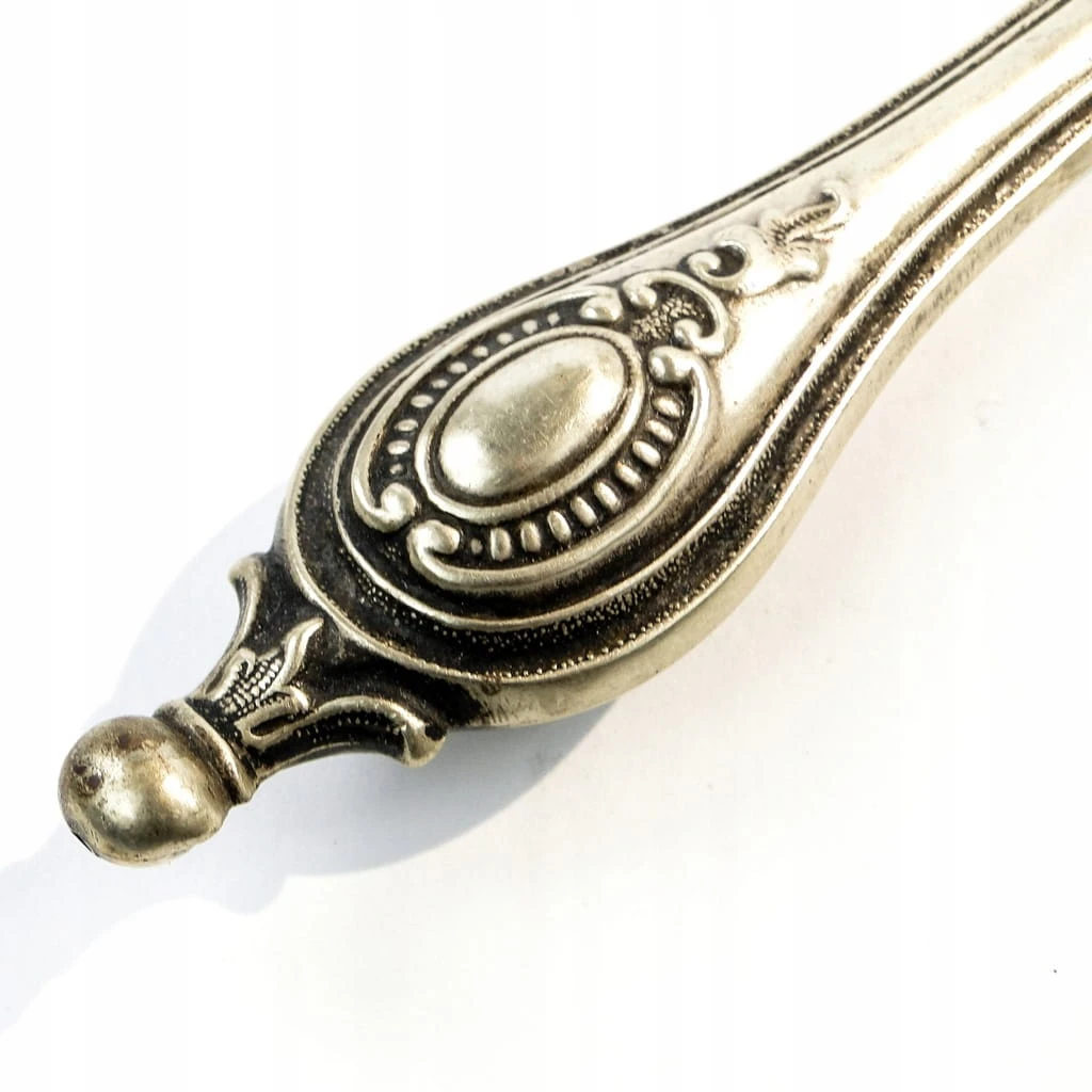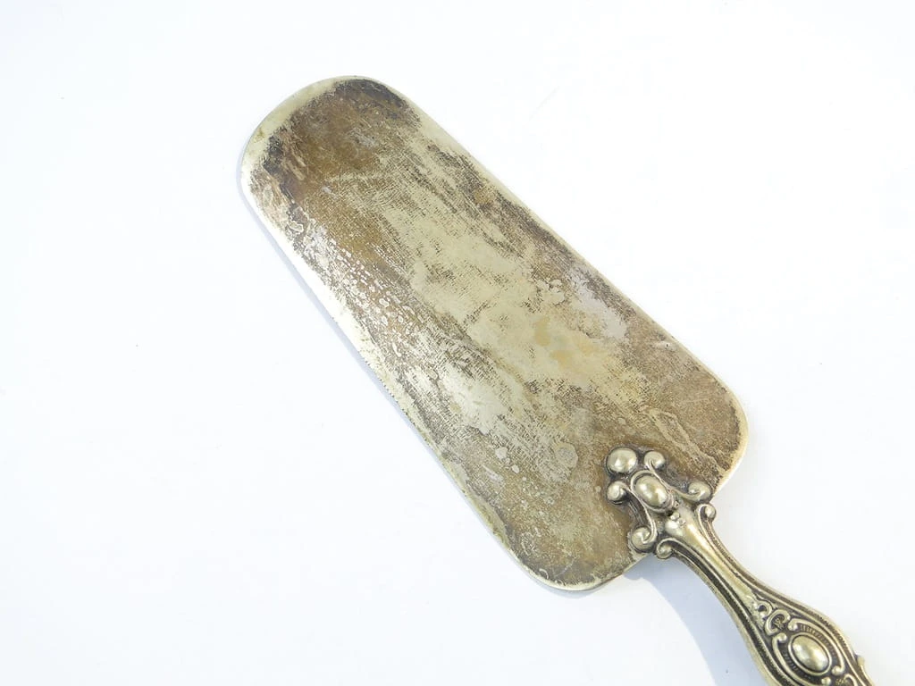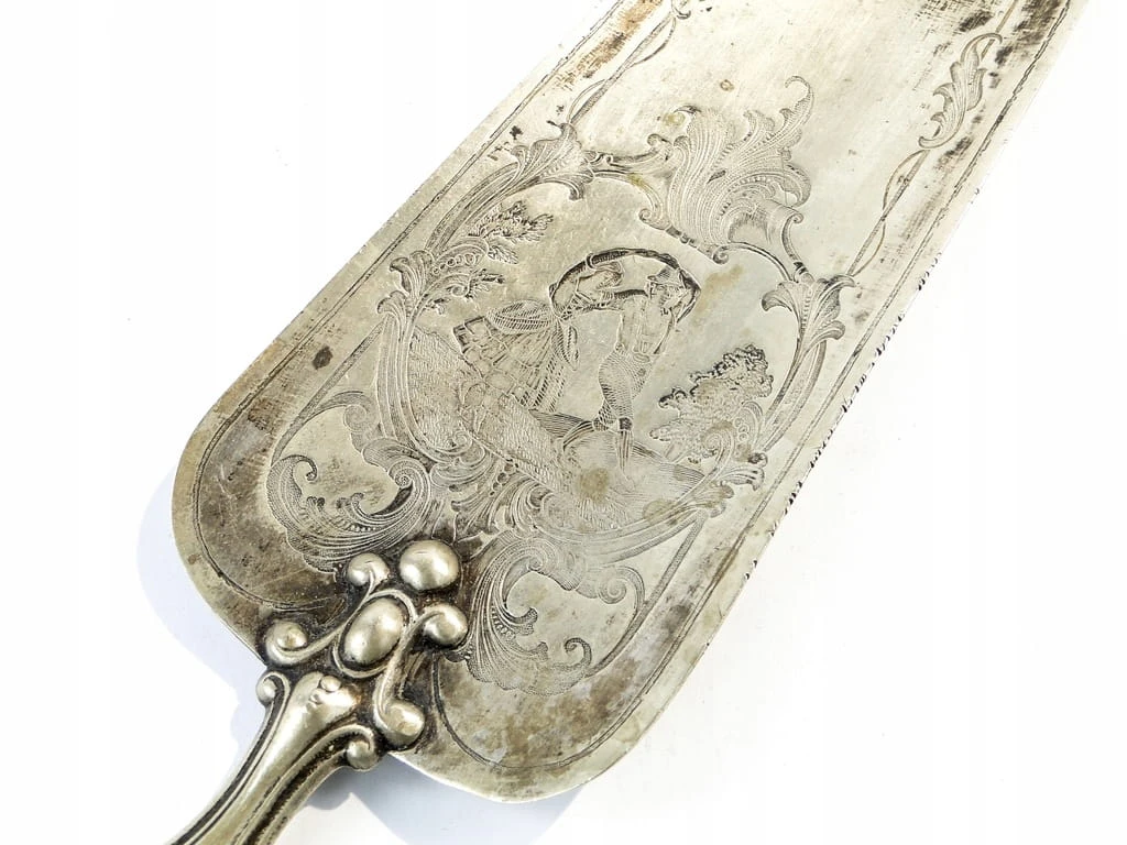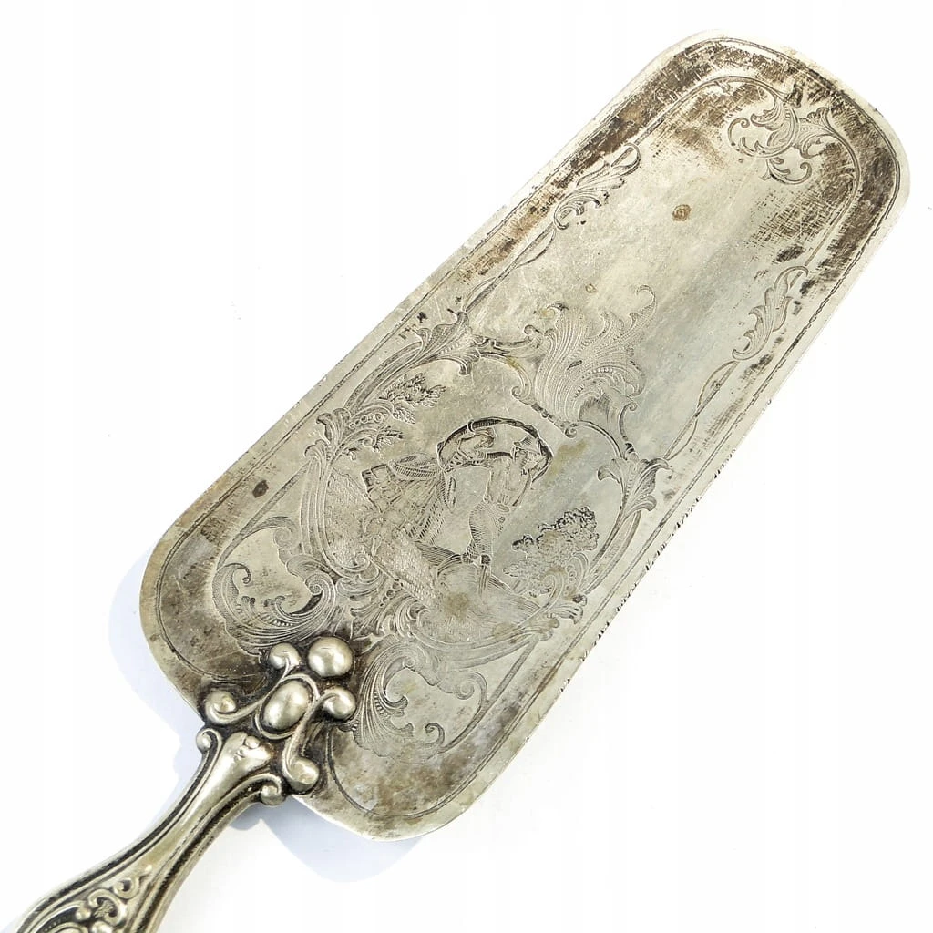 Łopatka do tortu wykonana na terenie Francji około 1900-1910. Charakteryzuje się przepięknymi wzorami secesyjnymi oraz scenką rodzajową, zachowana w dobrym stanie. Wykonana jest z alpacci i mosiądzu.