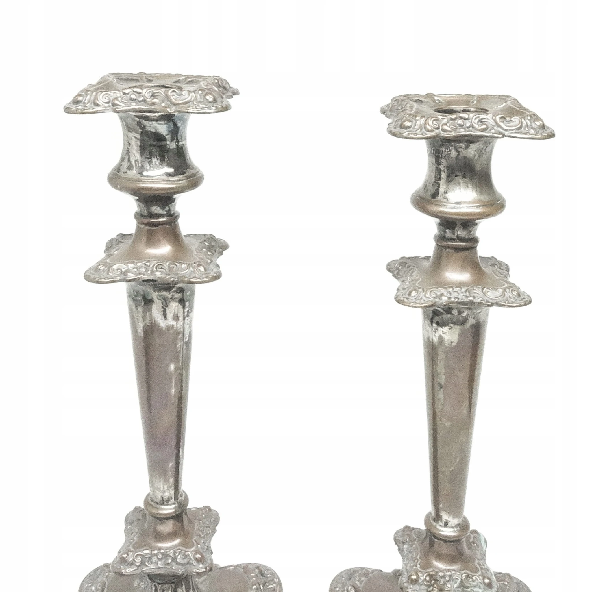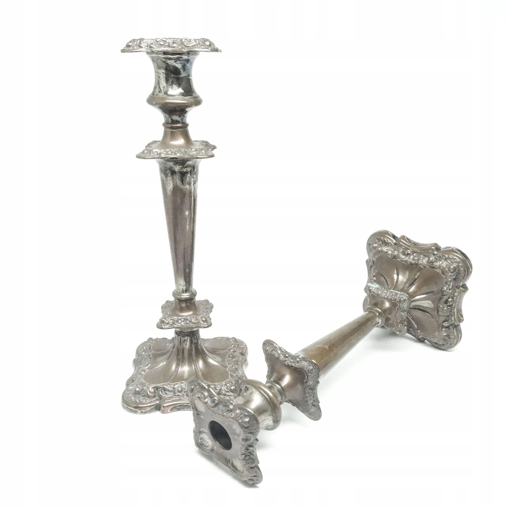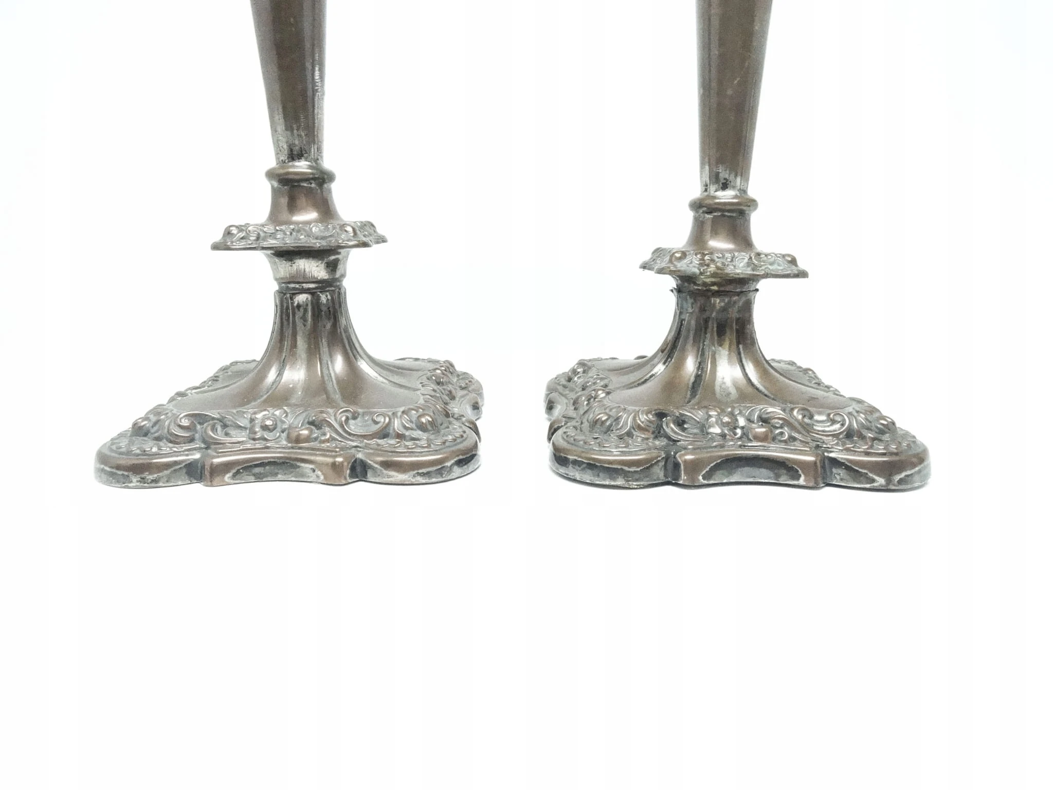 Para świeczników wykonanych z platerowanego mosiądzu i wypełnionych kalafonią, we Wiedniu w II połowie XIX w. Stan jest dobry.