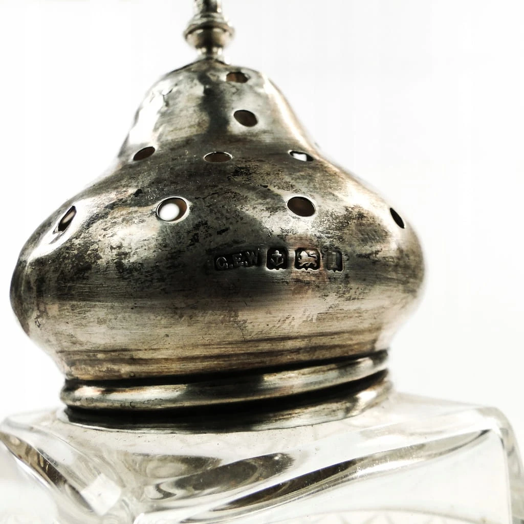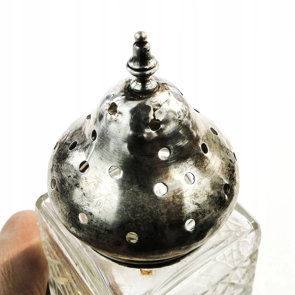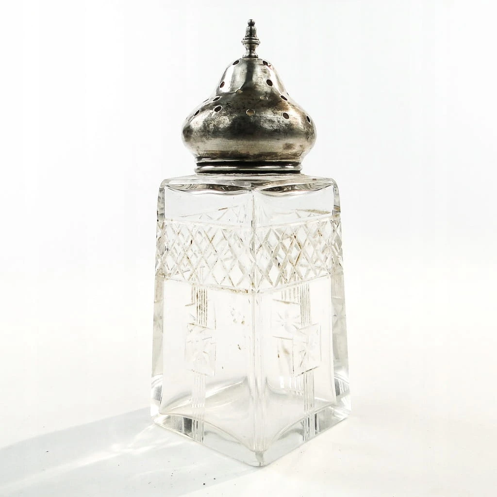 Cukiernica do cukru pudru wykonana została w Wielkiej Brytanii około 1900-1910 za szkła kryształowego. Stan dobry - ślady po naprawie (wyklepaniu kopuły zostały wyraźnie pokazane na zdjęciach). Przedmiot funkcjonalny, próba 925.