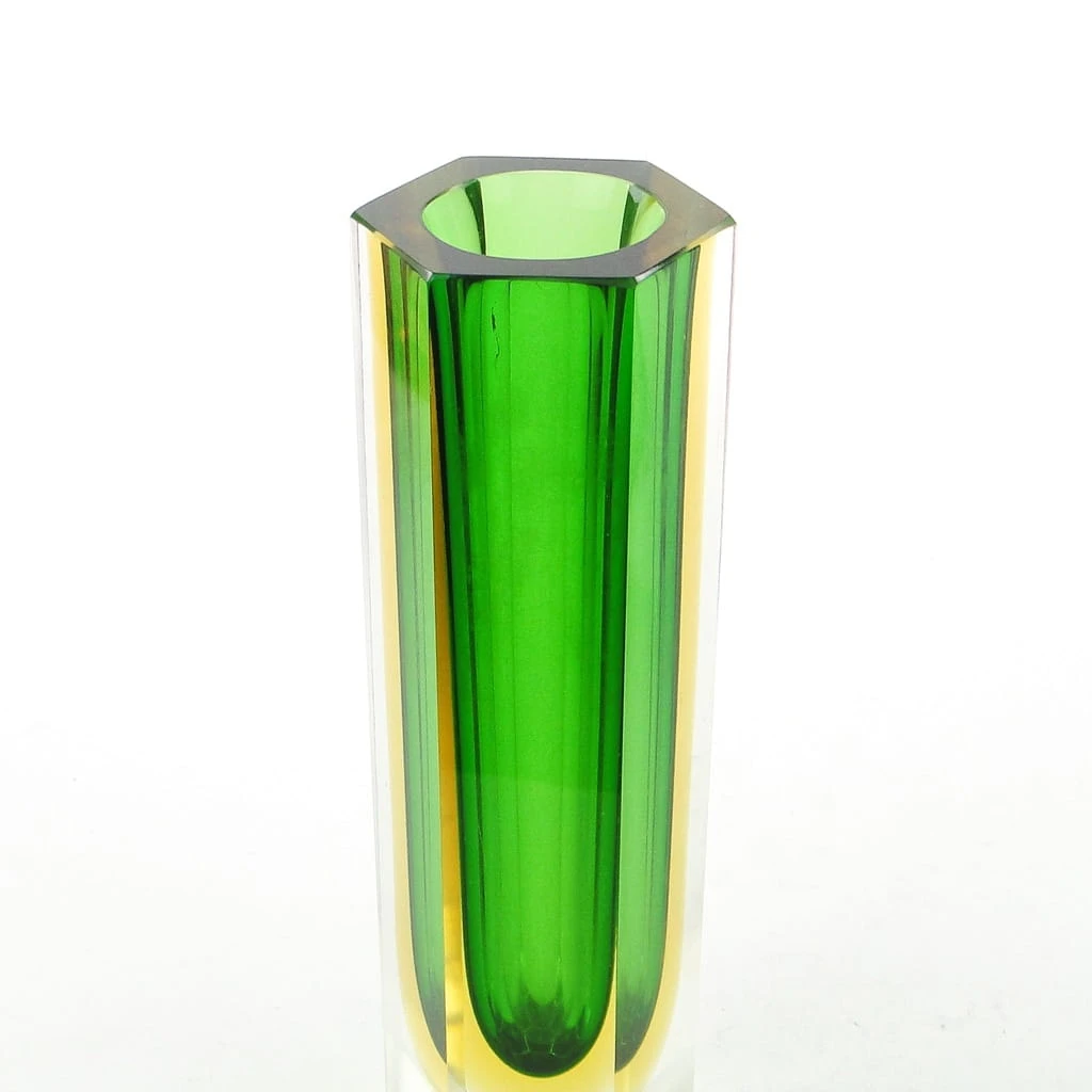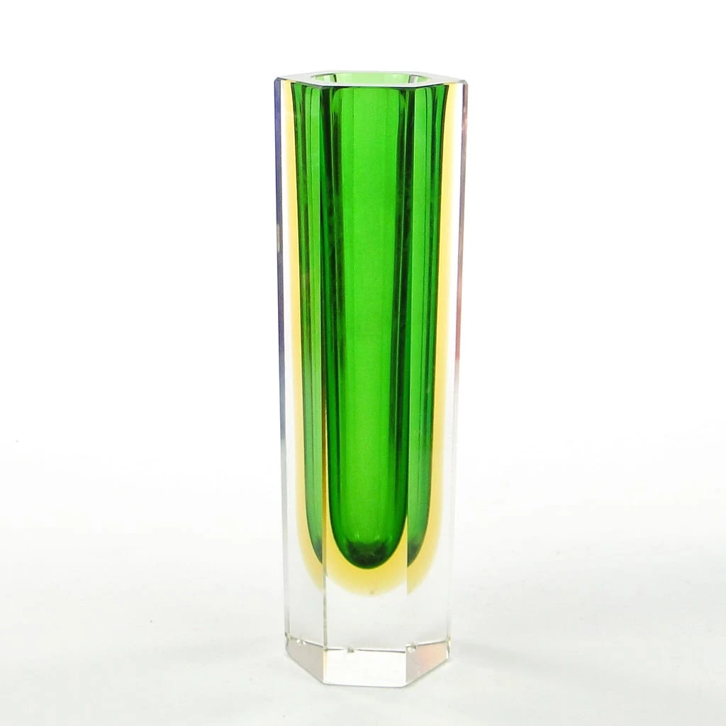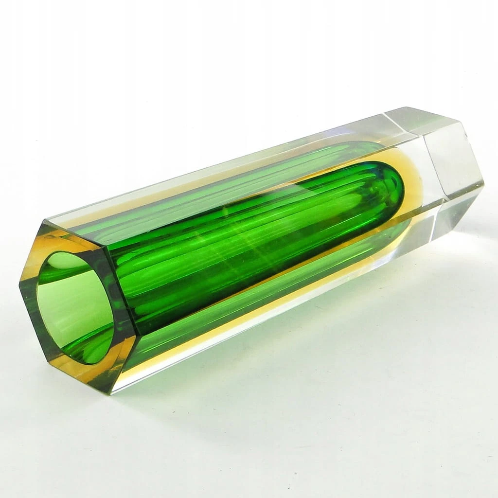 Zaprojektowane przez Flavio Poli dla Seguso Vetri d'Arte. Szkło warstwowe, kryształowe bezbarwne, żłóte i czerwone - szlifowane szlifem płaszczyznowym.