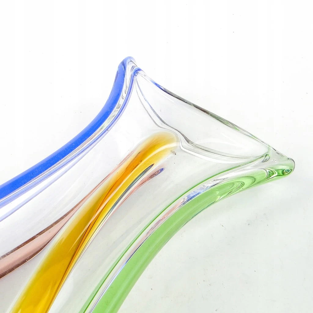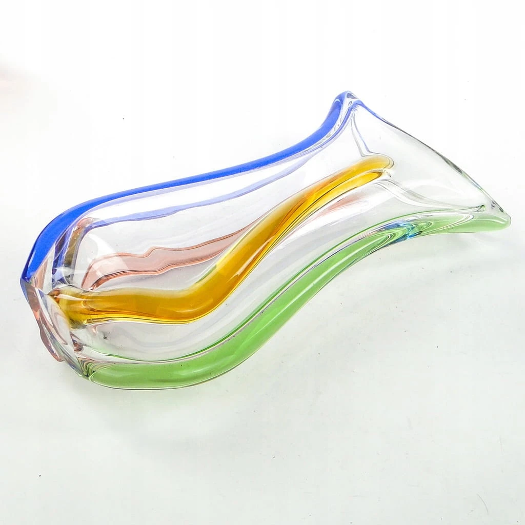 Wykonany jest ze szkła wielobarwnego, formowanego ręcznie, szlifowany na spodzie.