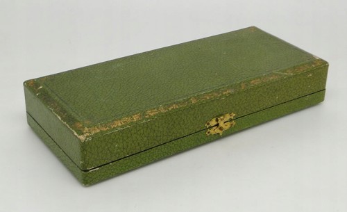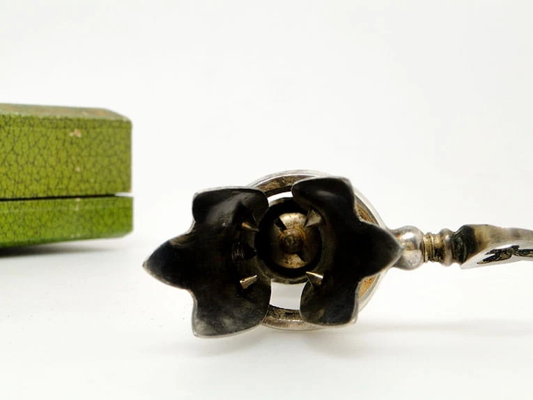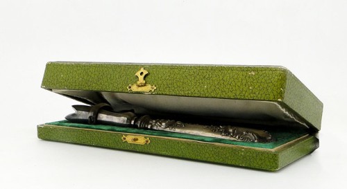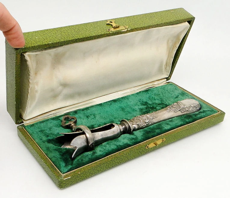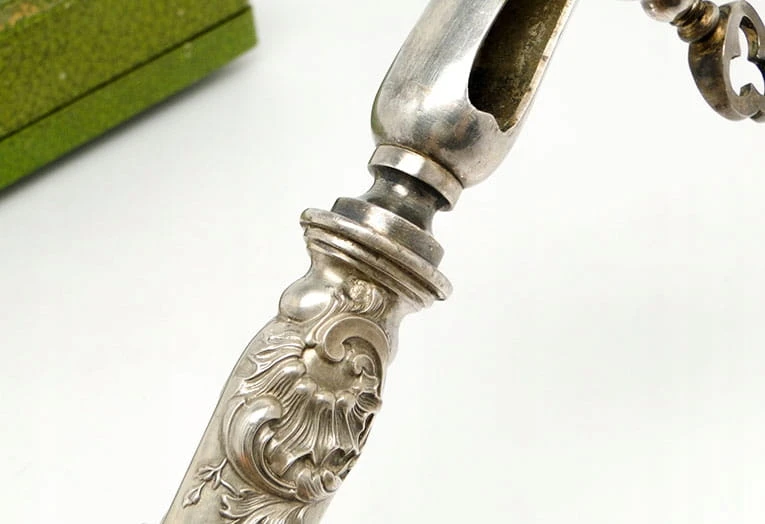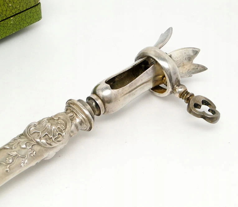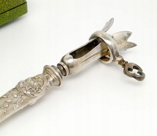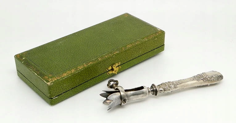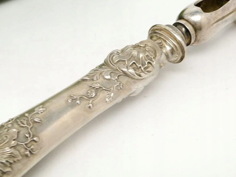 Przedmiotem aukcji jest niezwykle interesujący secesyjny chwytak do pieczeni z futerałem .