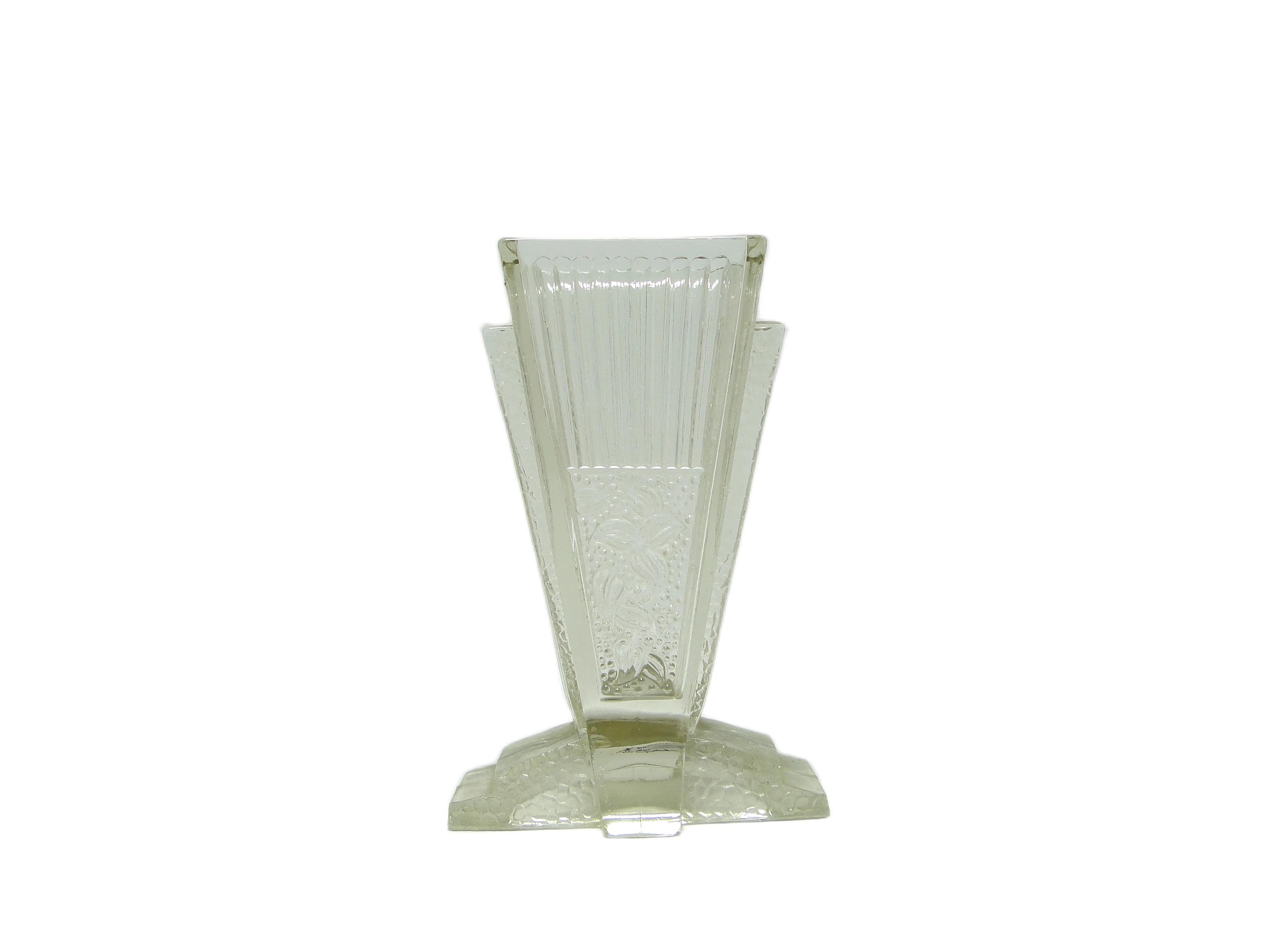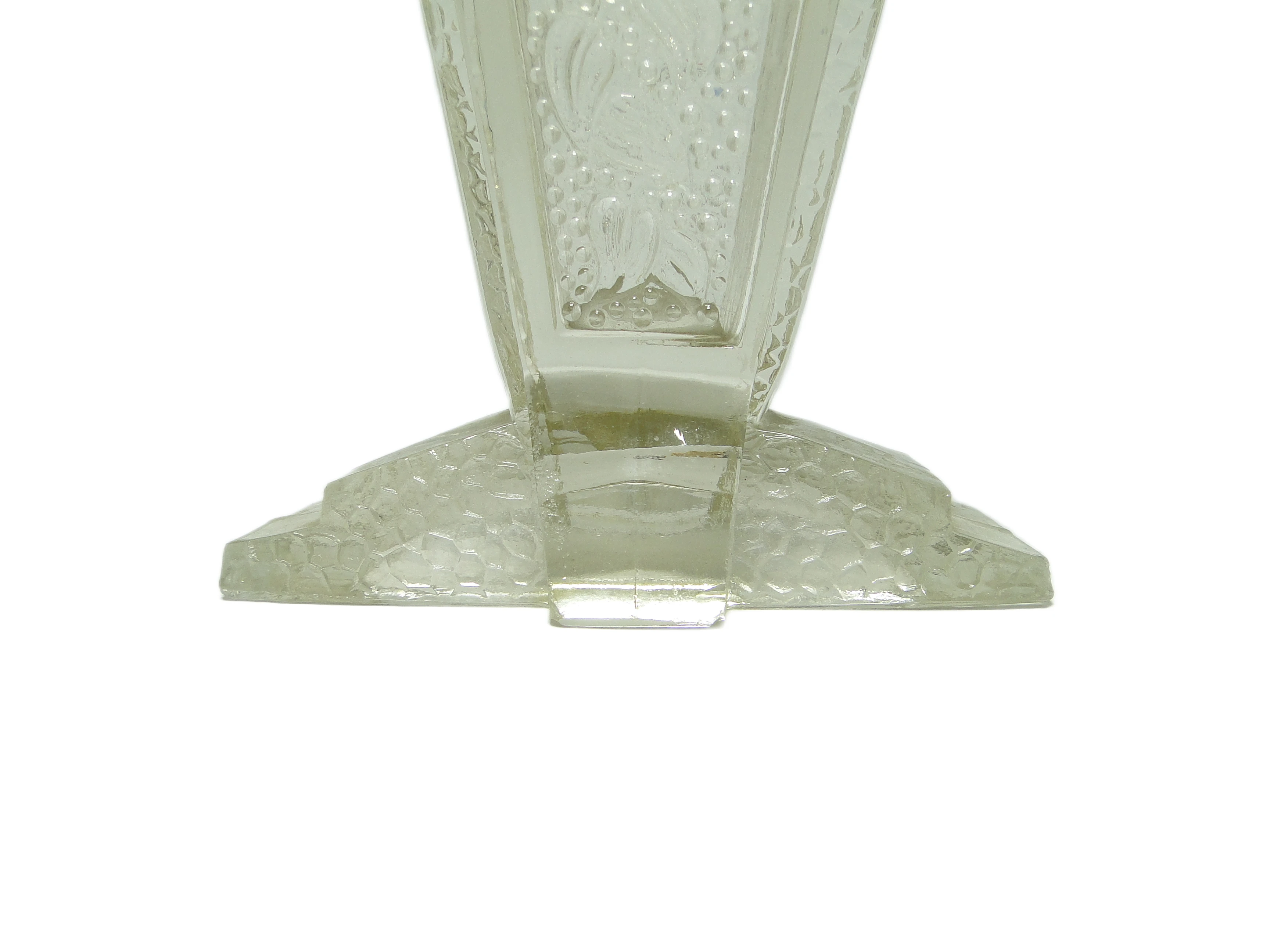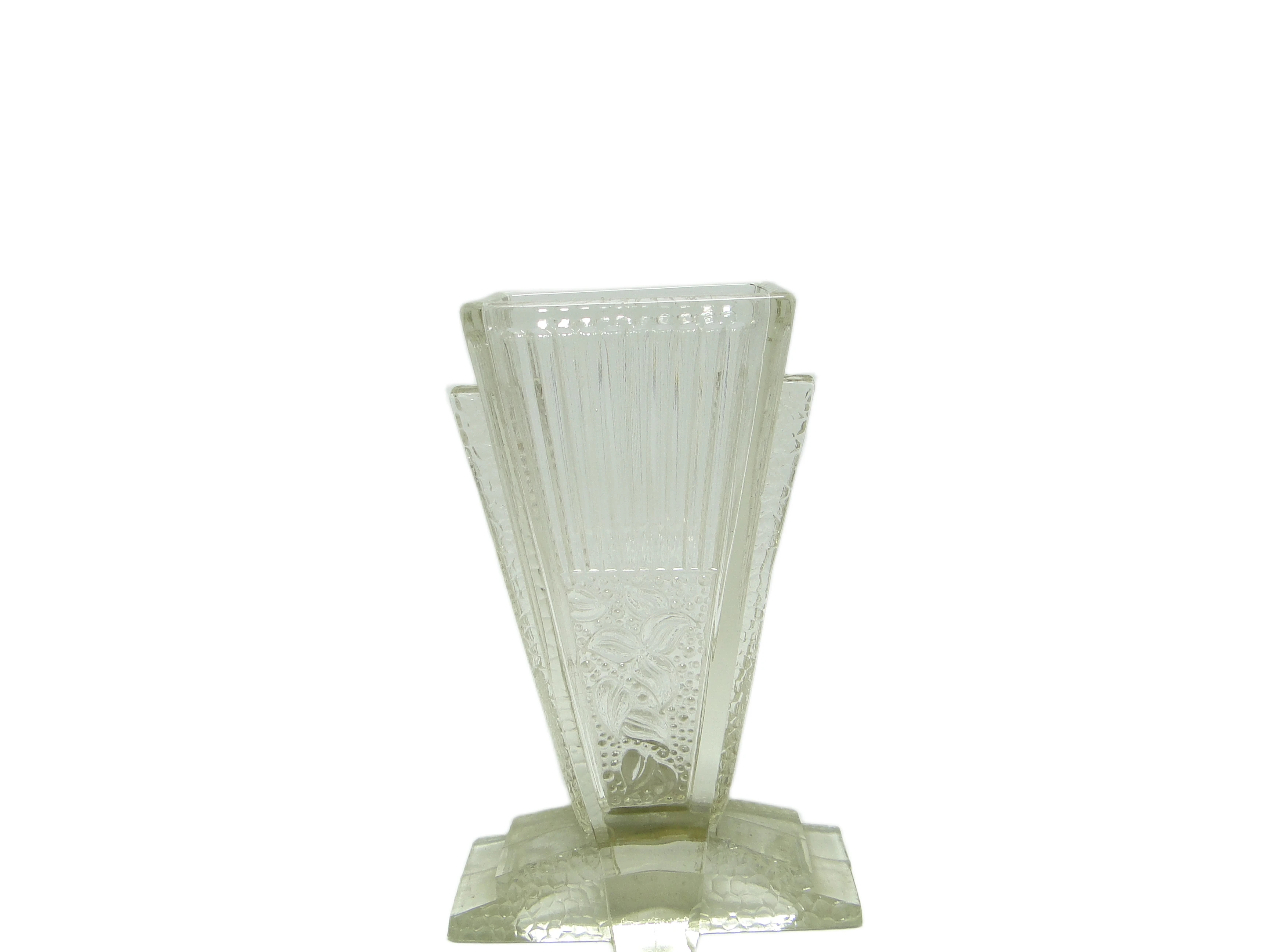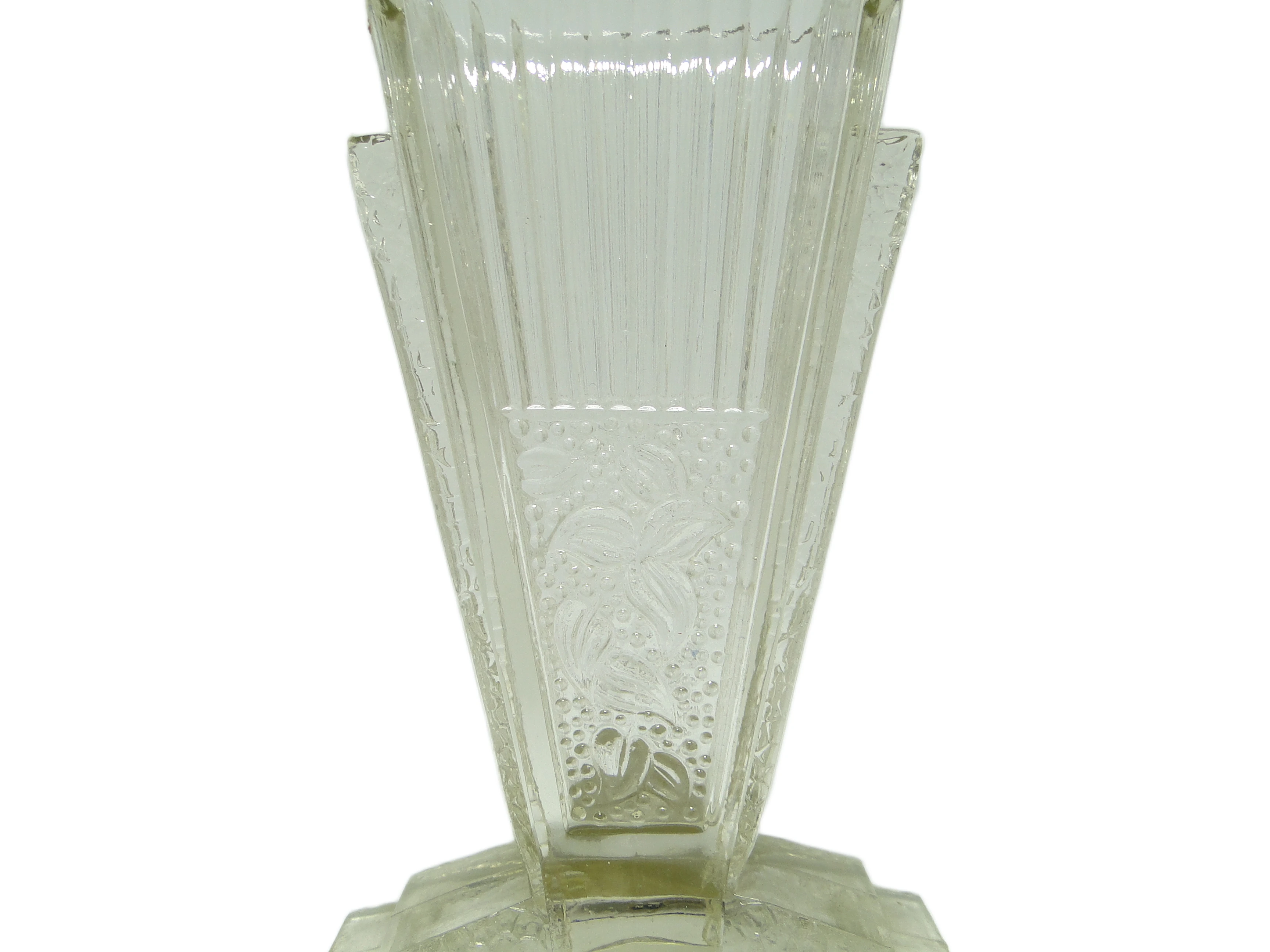 Serwetnik w stylu Art Deco, wyprodukowany w Polsce przez Hutę Hortensja w latach 50., wykonany jest ze szkła prasowanego o przezroczystym, lekko ciepłym, żółtawym odcieniu. Wachlarzowata sylwetka z kaskadowo stopniowanymi, geometrycznymi krawędziami podkreśla pionowy rytm projektu, a szeroka, stabilna podstawa harmonizuje z całością. Front i boki zdobią precyzyjnie tłoczone, kwiatowe motywy i linearne wzory, które tworzą bogatą fakturę kontrastującą z gładkimi, lśniącymi partiami szkła. Powierzchnia jest gładka i błyszcząca, wypukłe elementy wyczuwalne pod palcami. Brak widocznych uszkodzeń, wyszczerbień czy pęknięć; stan zachowania bardzo dobry, z jedynie minimalnymi, naturalnymi śladami czasu w postaci delikatnych przetarć powierzchni.W tej niewielkiej formie wybrzmiewa głos polskiego mid-century: geometryczna precyzja i tłoczone wzory odnoszą się do optymizmu powojennego Art Deco, który przenikał do codziennych przedmiotów użytkowych. Szkło odbijające światło przywołuje atmosferę jasnych salonów lat 50., gdzie funkcjonalność splatała się ze staranną dekoracyjnością. Fakturowane powierzchnie opowiadają historię o dążeniu do harmonii między wyrafinowanym rzemiosłem a masową produkcją – serwetnik staje się świadkiem epoki, balansującym pomiędzy ozdobnością a praktycznością.Taki serwetnik można zestawić z porcelaną z tego samego okresu lub ustawić na dębowym kredensie, gdzie geometryczne linie podkreślą charakter mebla. Dobrze sprawdzi się jako akcent na klasycznym stole, obok szklanych mis z epoki lub w otoczeniu innych transparentnych dekoracji. Wnętrze inspirowane stylem Art Deco, z dodatkami o prostych formach i metalicznymi detalami, pozwoli wydobyć walory tej szklanej miniatury, ale serwetnik odnajdzie się także w bardziej eklektycznych, kolekcjonerskich aranżacjach.