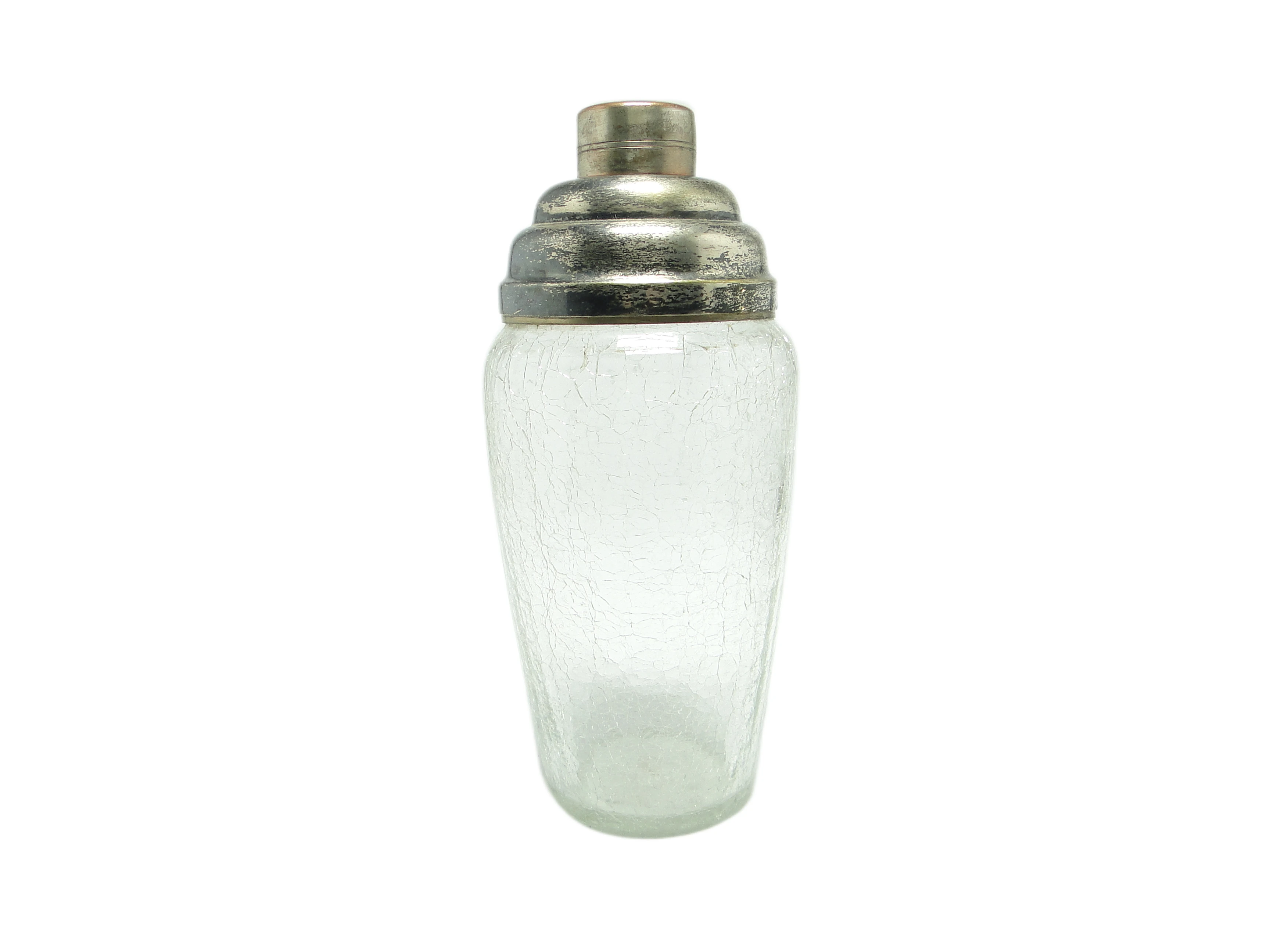 Shaker w stylu Art Deco, wykonany w Belgii w latach 50., łączy mrożone szkło z efektem spękań oraz srebrzony mosiądz. Korpus, utrzymany w chłodnym, mlecznobiałym odcieniu, cechuje matowa, satynowa powierzchnia i gęsta siatka drobnych spękań charakterystycznych dla techniki crackle glass. Górna część, obejmująca kaskadowy, geometryczny korek i kołnierz, wykonana jest z mosiądzu pokrytego srebrem i prezentuje subtelną patynę oraz ślady użytkowania, typowe dla przedmiotów z połowy XX wieku. Konstrukcja jest solidna, proporcje lekko zwężające się ku górze, z zaokrąglonymi ramionami i stabilną, płaską podstawą. Shaker zachowany jest w bardzo dobrym stanie – szkło pozbawione jest wyszczerbień, a metalowe elementy wykazują jedynie niewielkie oznaki czasu, charakterystyczne dla oryginalnych przedmiotów vintage.W tej formie pobrzmiewa duch powojennej Europy, kiedy elegancja spotykała się z pragmatyzmem codziennych rytuałów. Mrożone szkło z siatką spękań przywołuje nastrój zadymionych barów i salonów lat 50., gdzie każdy koktajl stawał się małym świętem. Srebrzony mosiądz, z miękkim połyskiem i śladami dawnych gestów, zdaje się opowiadać o wieczorach, w których liczyły się detale i powolność ruchu – shaker mógłby szeptać o dawnych rozmowach i subtelnych toastach, w których odbijała się nowoczesność epoki.Ten shaker można wykorzystać jako praktyczny element domowego barku lub dekoracyjny akcent na konsoli w salonie. Dobrze sprawdzi się w towarzystwie innych dodatków z epoki mid-century, szklanych karafek czy metalowych tacyków. Warto połączyć go z minimalistycznym szkłem, chromowanymi detalami lub geometrycznymi formami, by podkreślić zarówno jego charakterystyczną linię Art Deco, jak i miękką fakturę mrożonego szkła. Najlepiej odnajdzie się w aranżacjach inspirowanych stylem Art Deco, modernistycznych lub eklektycznych kolekcjach.