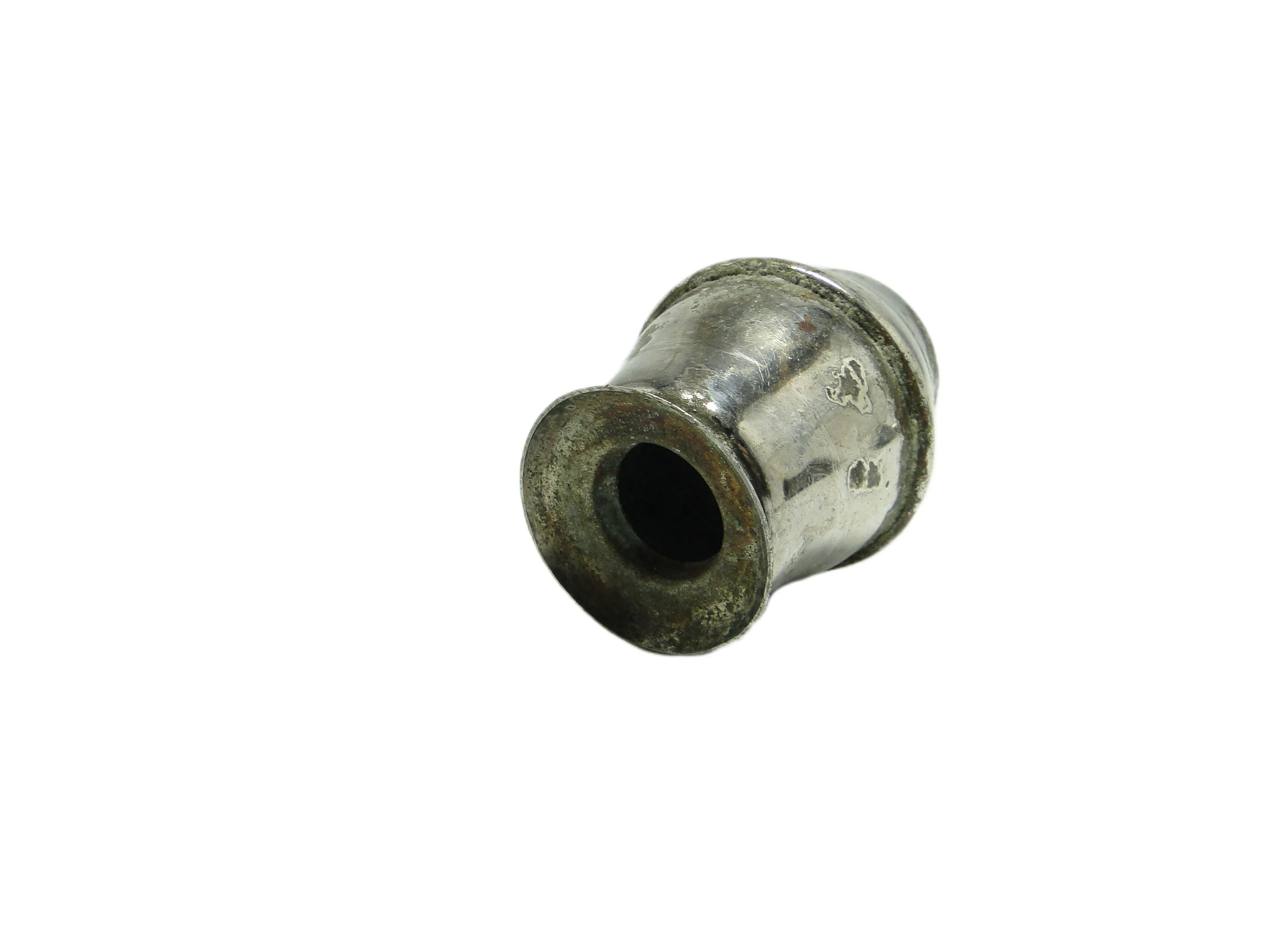 Solniczka z lat 30. XX wieku, wykonana w Belgii z mosiądzu platerowanego srebrem, reprezentuje czyste założenia epoki Art Deco. Jej forma jest zwarta, geometryczna i symetryczna – przypomina niewielką beczułkę z poziomym pierścieniem dzielącym korpus na dwie sekcje. Powierzchnia matowo-satynowa, utrzymana w chłodnym odcieniu srebra, zdradza subtelne ślady wieku: drobne rysy, miejscowe przebarwienia i ciemniejsze plamy oksydacji, zwłaszcza w okolicach pierścienia oraz podstawy. Brak dodatkowych zdobień czy kolorowych akcentów podkreśla minimalistyczny, funkcjonalny charakter, a lekko rozszerzona podstawa zapewnia stabilność. Widoczne łączenia i podział korpusu potwierdzają rzetelność konstrukcji. Przedmiot zachowany w dobrym stanie, z naturalnymi śladami użytkowania i autentyczną patyną, bez poważnych uszkodzeń strukturalnych.W tej solniczce pobrzmiewa głos belgijskiej moderny lat 30., gdy codzienne przedmioty niosły w sobie szlachetność prostych materiałów i rygorystycznych form. Chłodne srebro z subtelną patyną opowiada o czasach, w których luksus wyrażał się przez funkcjonalność i skrupulatny detal. Każdy ślad na powierzchni przywołuje atmosferę elegancko zastawionych stołów w miejskich kamienicach Antwerpii — momenty, gdy światło lamp odbijało się od metalowych akcesoriów, tworząc wyważony, nowoczesny nastrój.Solniczka może stać się subtelnym akcentem na stole w jadalni urządzonej w duchu Art Deco, zwłaszcza w zestawieniu z porcelaną o geometrycznych wzorach, szklanymi karafkami lub niklowanymi sztućcami. Równie dobrze odnajdzie się w kolekcjonerskiej witrynie lub w eklektycznej aranżacji, gdzie jej oszczędna, geometryczna forma stworzy spokojny kontrapunkt dla bardziej dekoracyjnych elementów. Warto połączyć ją z innymi przedmiotami vintage z różnych dekad, by wydobyć jej modernistyczny rodowód.