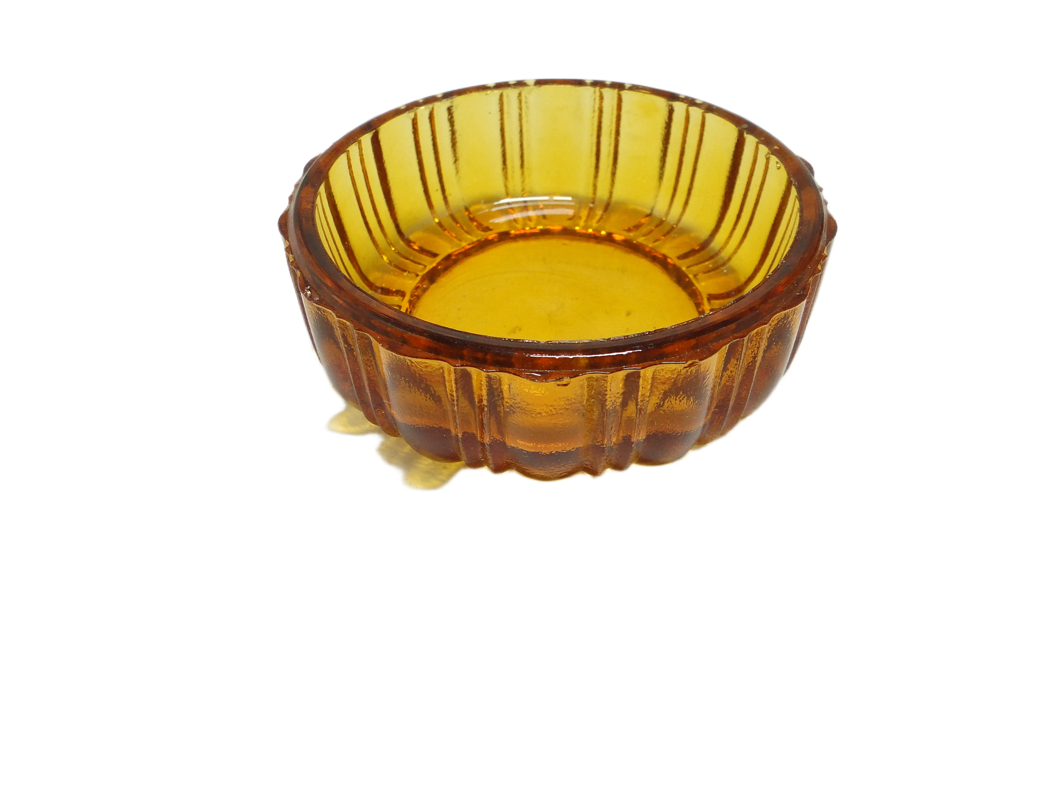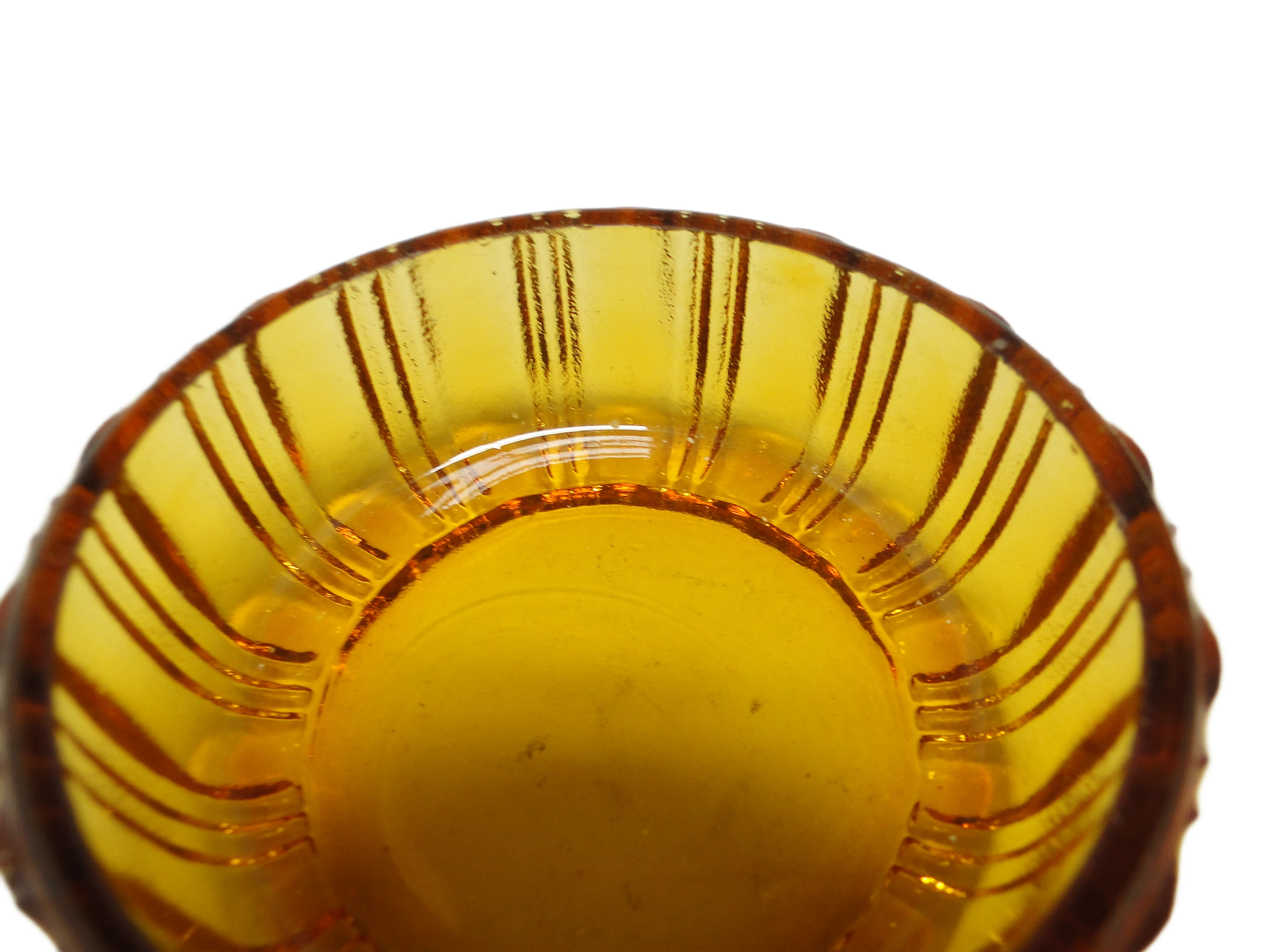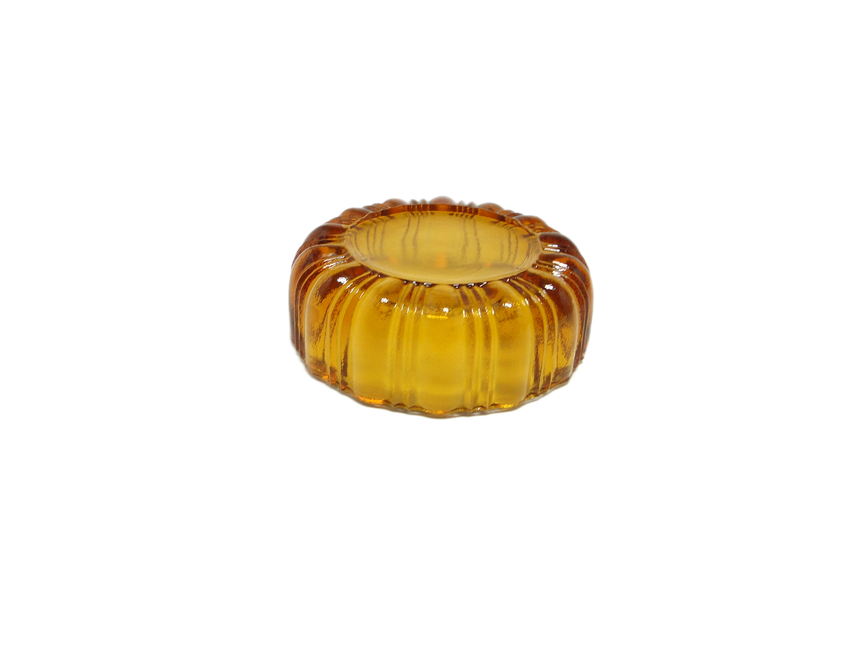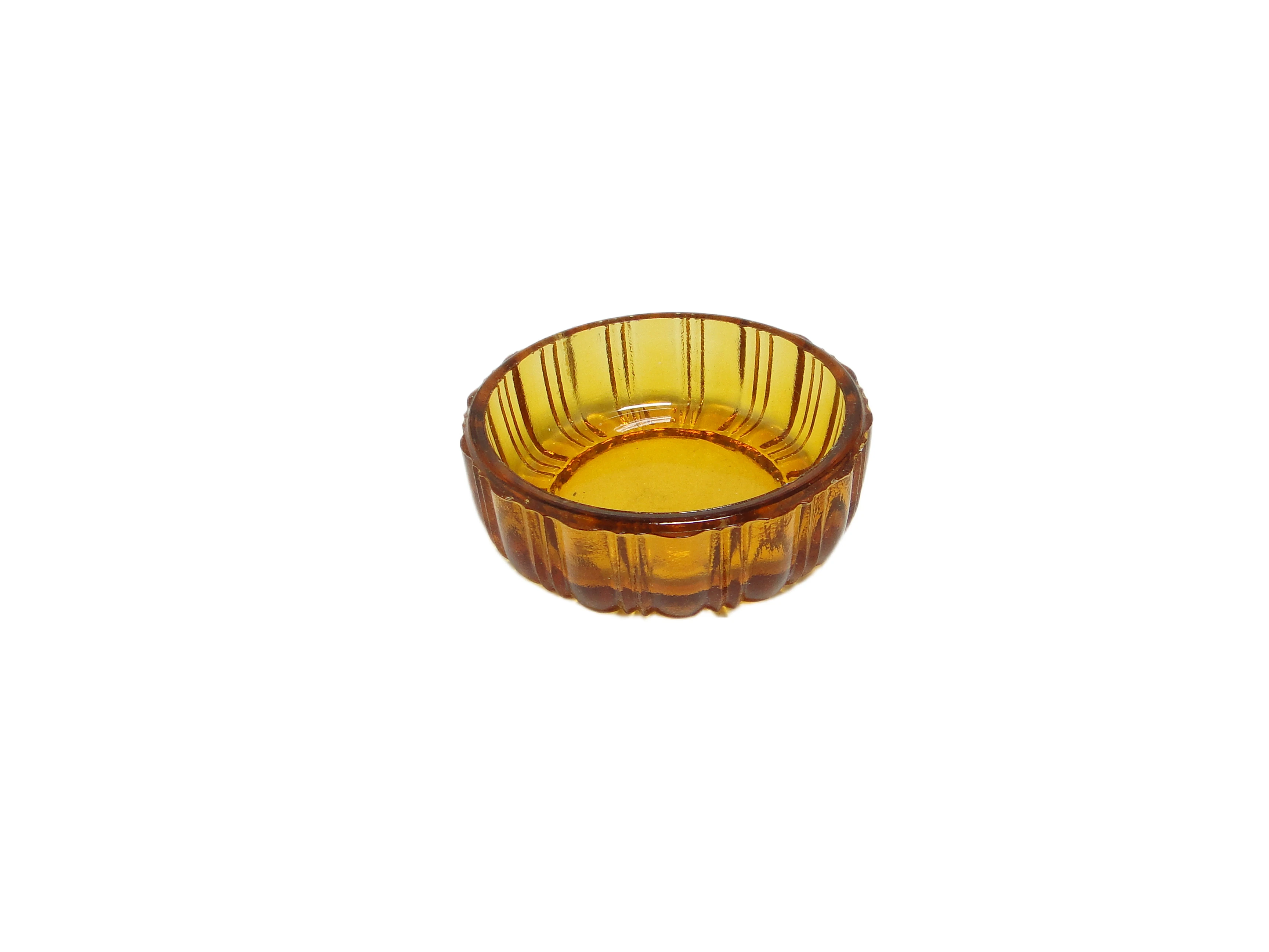 Solniczka wyprodukowana przez HSG Ząbkowice w Polsce w latach 30. XX wieku wykonana została z prasowanego szkła o wyrazistej, bursztynowo-pomarańczowej barwie. Konstrukcję stanowi niewielka, okrągła miseczka z grubymi ściankami i solidnym, płaskim dnem. Zewnętrzną powierzchnię szkła zdobią regularne, pionowe żłobienia, które nadają całości rytmiczny, geometryczny charakter typowy dla stylu art déco. Szkło jest półprzezroczyste, o błyszczącej powierzchni, dzięki czemu światło efektownie rozprasza się na żłobieniach i wnosi głębię kolorystyczną. Wnętrze miseczki pozostaje gładkie, co tworzy kontrast dotykowy z żłobionymi ściankami. Proporcje naczynka są zwarte i harmonijne, podkreślając jego użytkowy charakter. Solniczka zachowana jest w bardzo dobrym stanie – brak widocznych wyszczerbień, pęknięć czy śladów zużycia; wszystkie elementy oryginalne.Ten drobny przedmiot przywołuje atmosferę lat 30. – epoki, w której codzienne szkło użytkowe otrzymywało nową, dekoracyjną rolę. Geometryczne rytmy żłobień odsyłają do fascynacji ruchem, światłem i symetrią, a ciepła barwa bursztynu budzi skojarzenia z przytulnością przedwojennych wnętrz. Solniczka z Ząbkowic mogłaby opowiadać o rodzinnych stołach, gdzie spotykała się codzienność i odświętność, a drobiazgi takie jak ona świadczyły o dbałości o każdy detal w codziennych rytuałach.Można wyeksponować ją na dębowym stole w salonie lub na półce z innymi szklanymi naczyniami z epoki art déco. Dobrze sprawdzi się w towarzystwie porcelanowej zastawy i srebrnych sztućców, podkreślając historyczny charakter aranżacji. Wnętrza kolekcjonerskie lub eklektyczne zyskają subtelny akcent, który można połączyć z innymi vintage dodatkami lub współczesnymi dekoracjami w ciepłej, bursztynowej palecie.