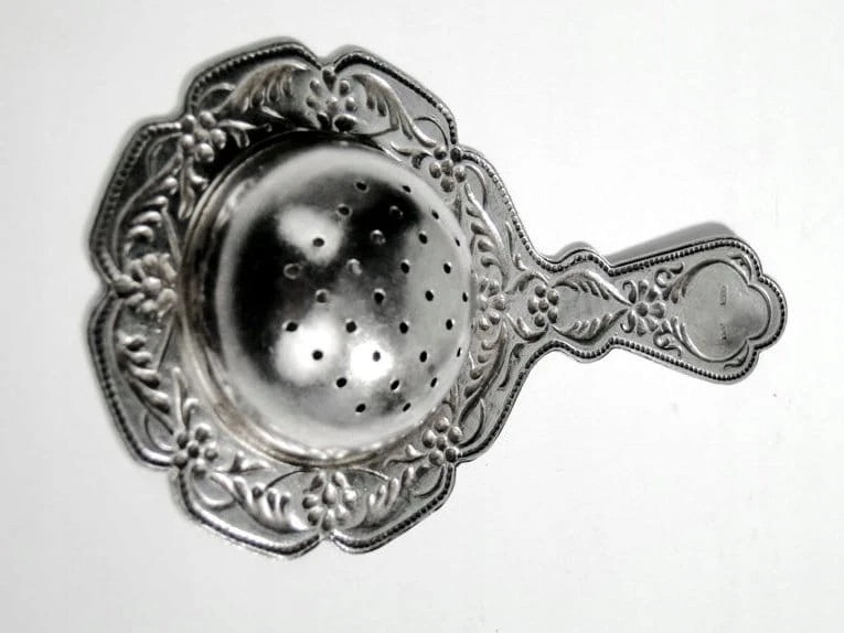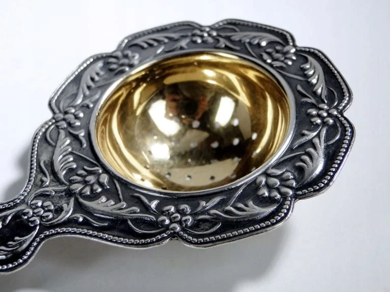 Przedmiotem aukcji jest srebrne sitko do herbaty wykonane na terenie dawnej Rosji.