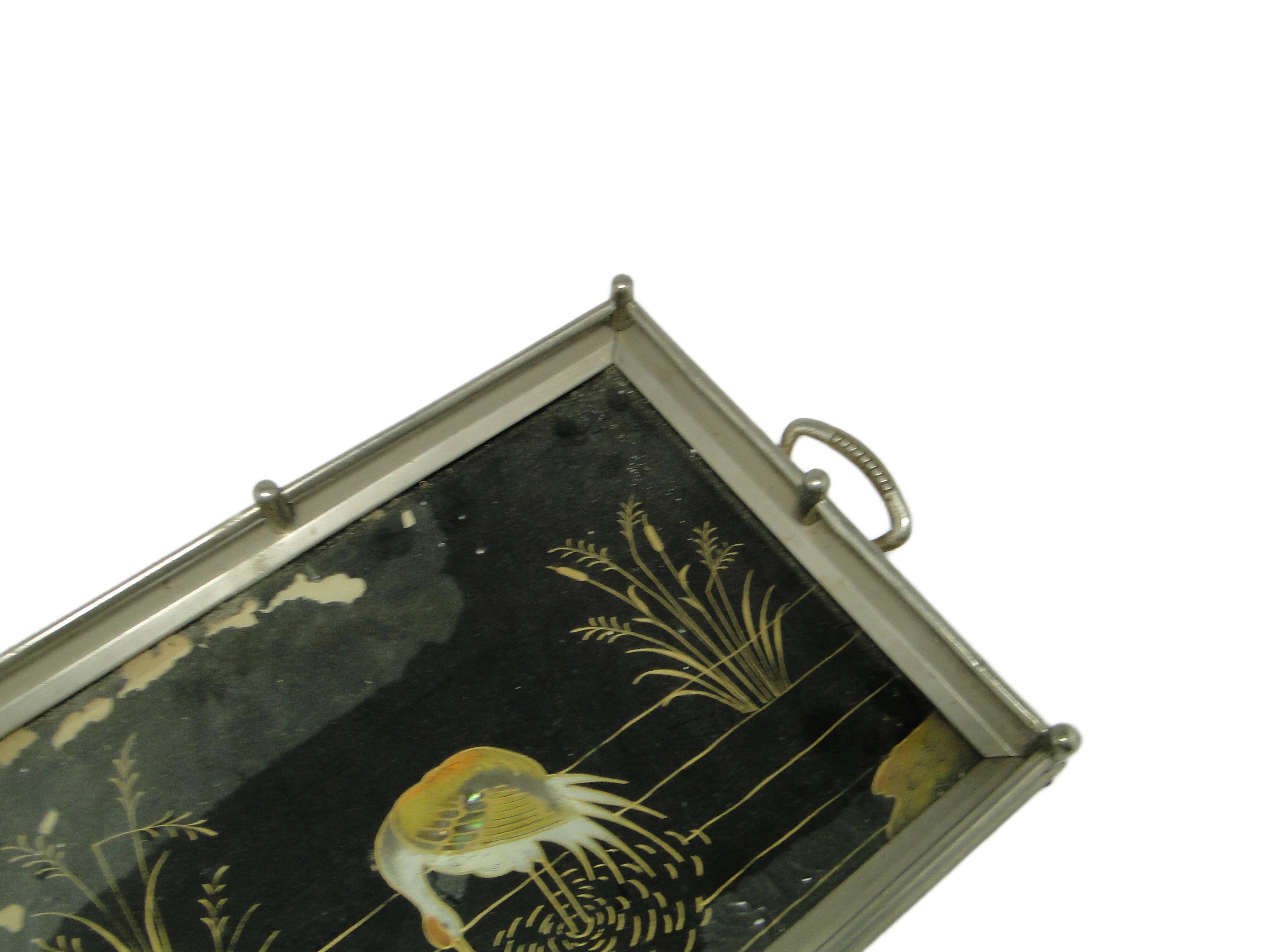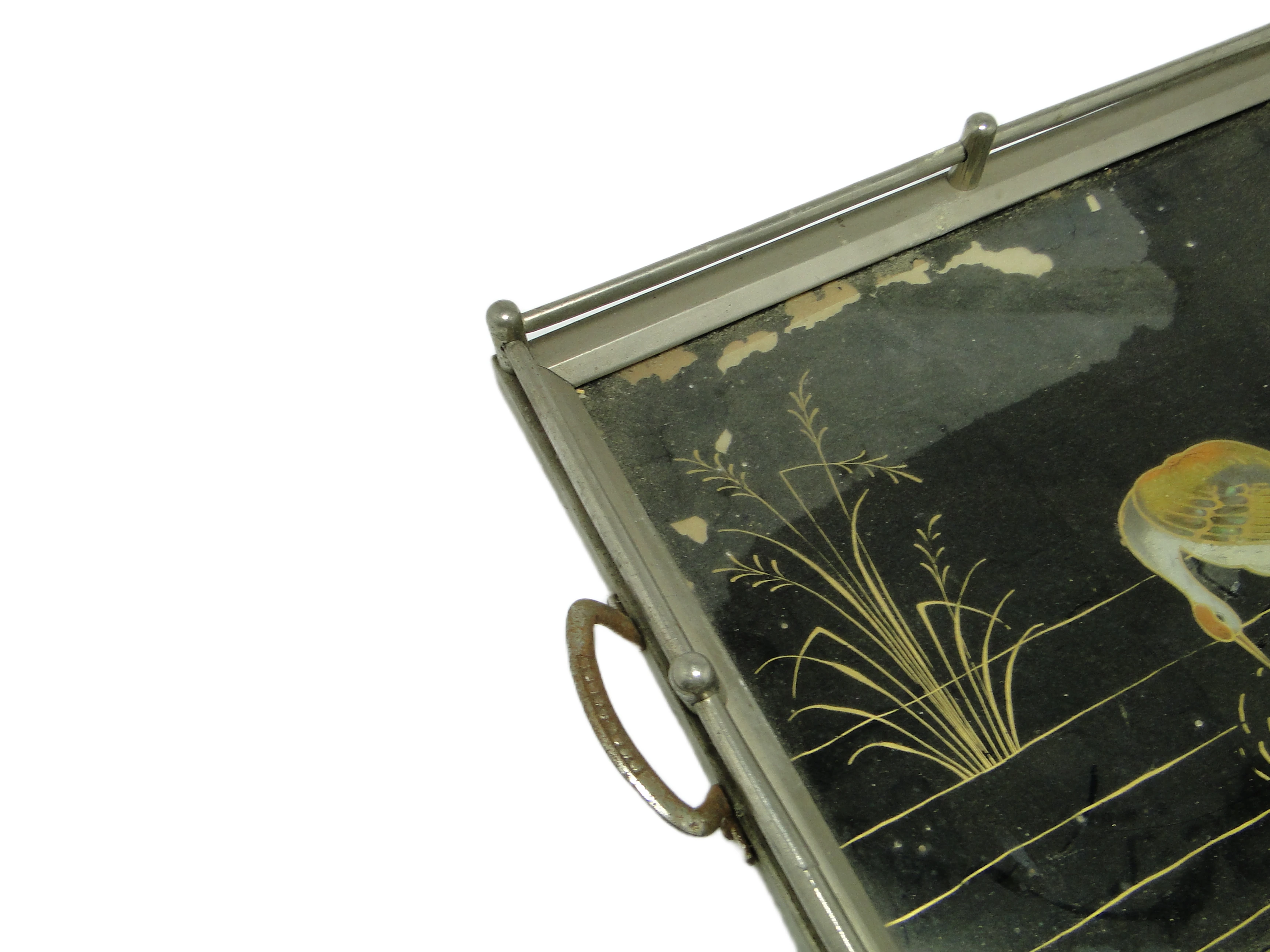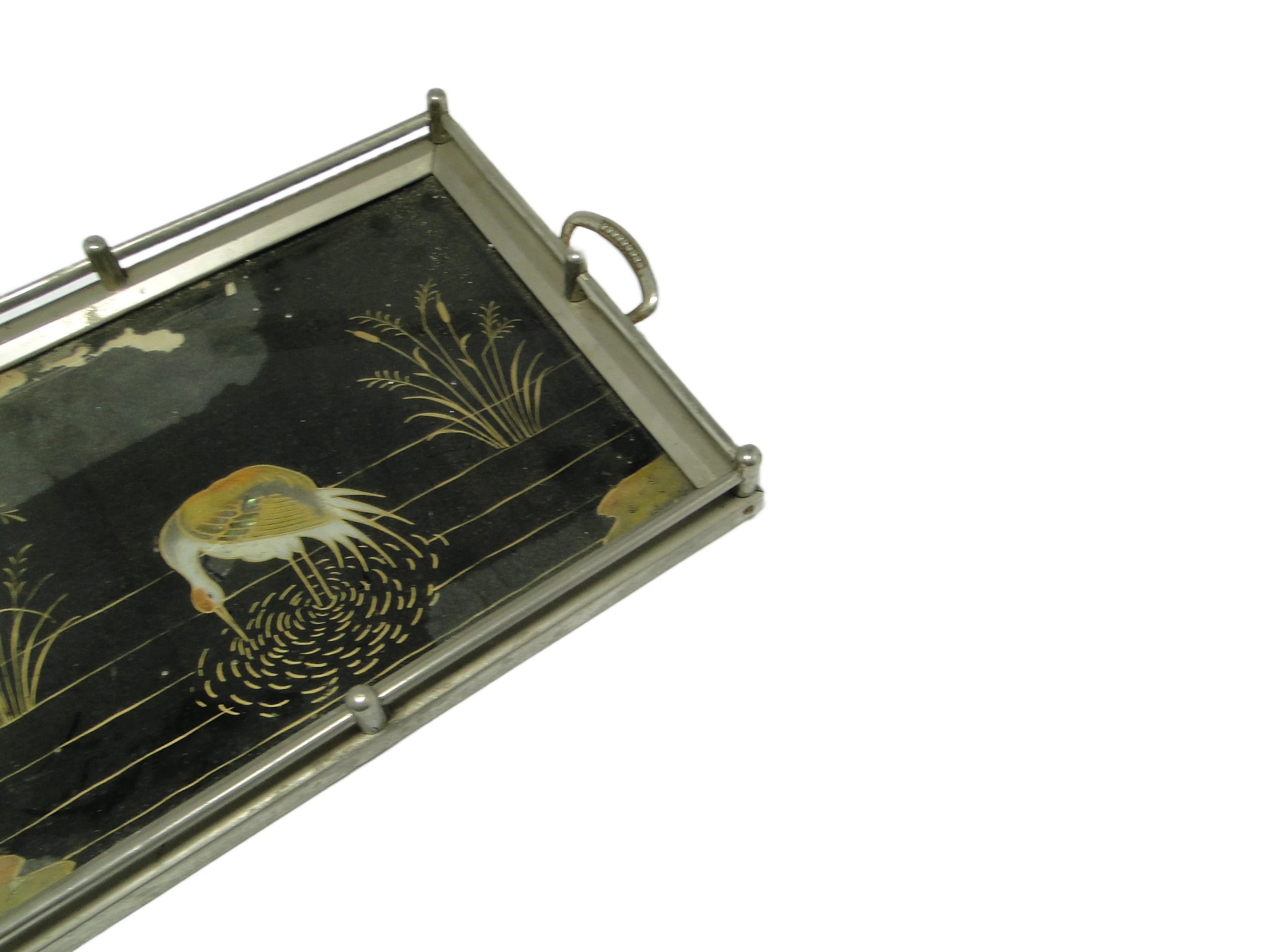Taca z Japonii z lat 50., utrzymana w duchu mid-century modern, prezentuje prostokątną formę z wyrazistą metalową ramą, której zaokrąglone uchwyty boczne w matowym, postarzałym srebrze noszą autentyczną patynę i ślady utlenienia. Podstawa wykonana z lakierowanego drewna o głębokiej, połyskującej czerni stanowi tło dla centralnie umieszczonego, ręcznie malowanego motywu: ptaka – żurawia lub czapli – stojącego w wodzie, otoczonego subtelnymi źdźbłami traw w odcieniach złota, ochry i bieli. Kompozycję dopełnia wysoki rant, który zabezpiecza przenoszone przedmioty, oraz widoczne metalowe łączenia i śruby podkreślające solidność konstrukcji. Powierzchnia tacy wyraźnie zdradza liczne ślady użytkowania: zadrapania, ubytki laki i farby, szczególnie w narożnikach, a srebrna rama miejscami zmatowiała. Stan zachowania: mocno zużyty, z autentycznymi śladami wieloletniego użytkowania.Ta taca niesie w sobie głos powojennej Japonii, gdzie tradycyjne rzemiosło spotykało się z modernistyczną funkcjonalnością doby lat 50. Lśniąca czarna laka odwołuje się do surowej dyscypliny warsztatu japońskich mistrzów, a ręcznie malowany ptak – niczym cichy świadek codziennych ceremonii – wpisuje się w narrację o uważności i szacunku dla chwil spędzanych przy herbacie. Patyna metalu i rysy na powierzchni opowiadają o upływie czasu, o domach, w których taca towarzyszyła rozmowom i gestom, pozostając zarówno praktycznym przedmiotem, jak i znakiem troski o estetykę.Zestawienie tej tacy z minimalistyczną ceramiką w neutralnych barwach pozwoli wyeksponować jej ręcznie malowane detale. Może znaleźć swoje miejsce na niskim stole w salonie mid-century modern, w sąsiedztwie książek lub pojedynczego kwiatowego akcentu. W kolekcjonerskich aranżacjach sprawdzi się jako dekoracyjny akcent na otwartej półce lub konsoli w przedpokoju – warto połączyć ją z japońską grafiką albo prostym świecznikiem, by podkreślić dialog tradycji z nowoczesnością.